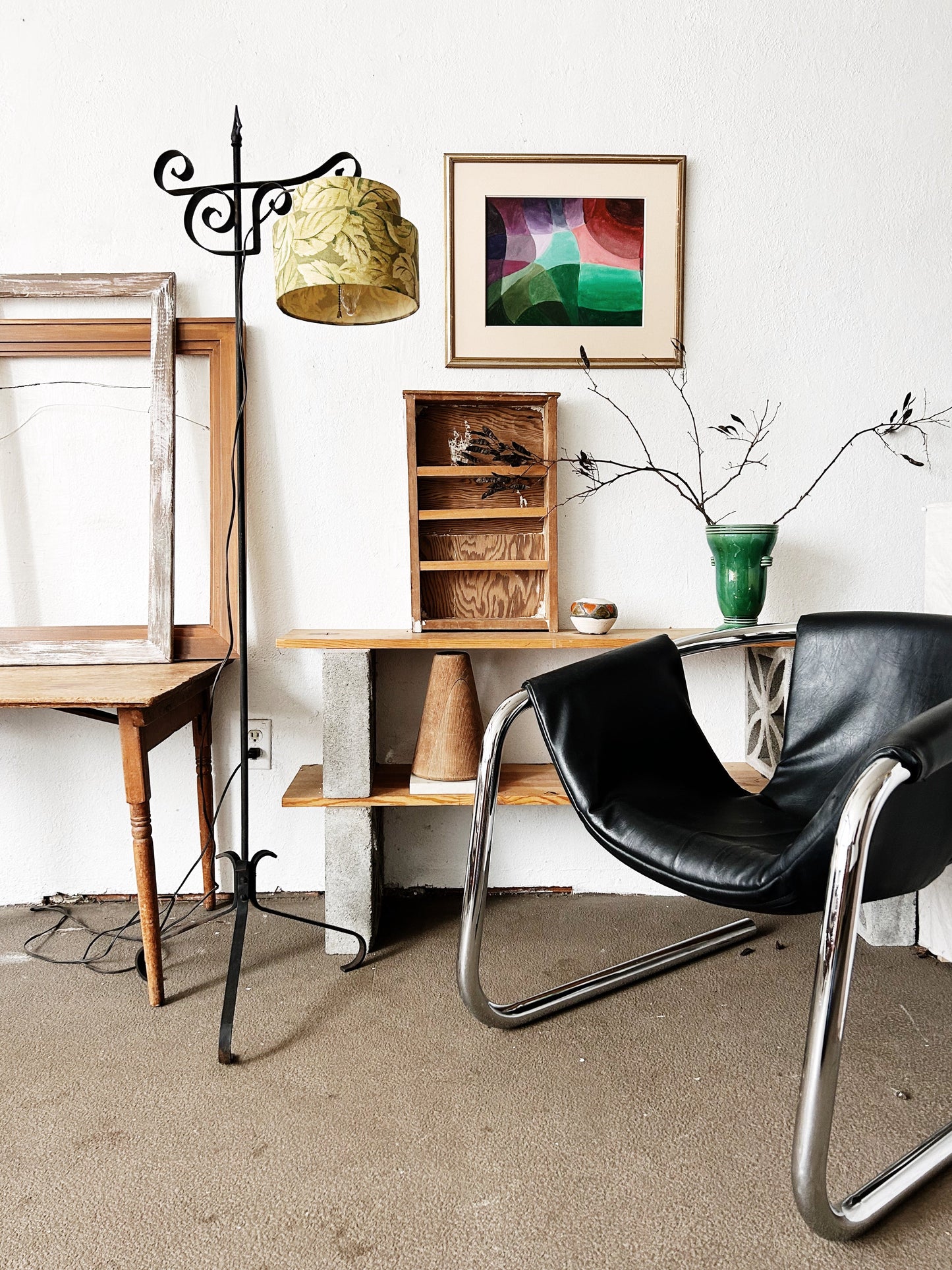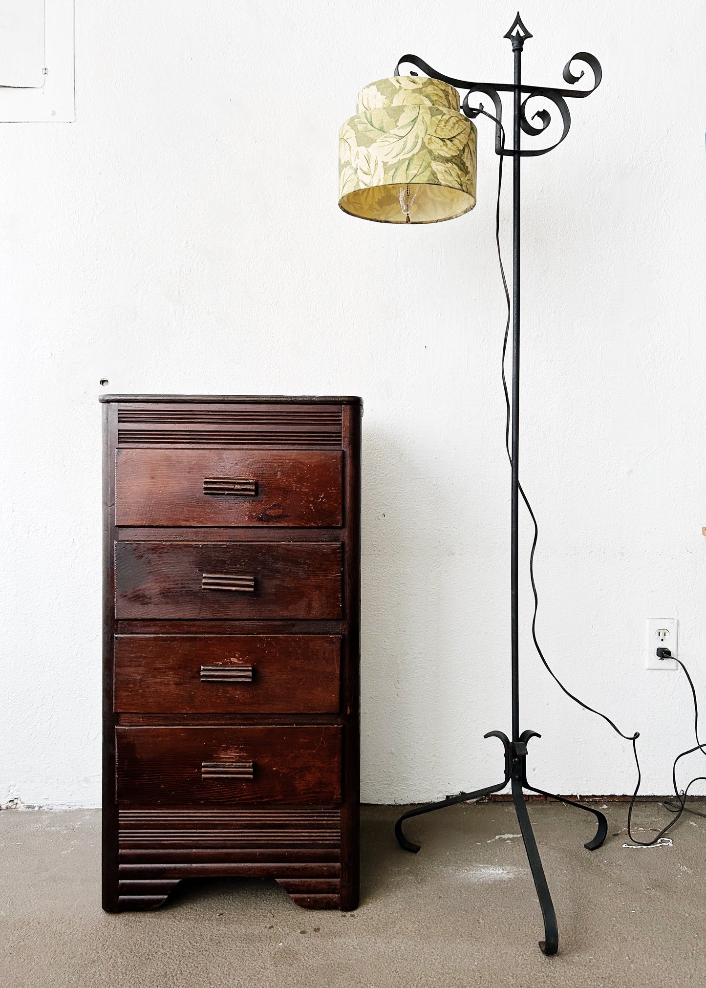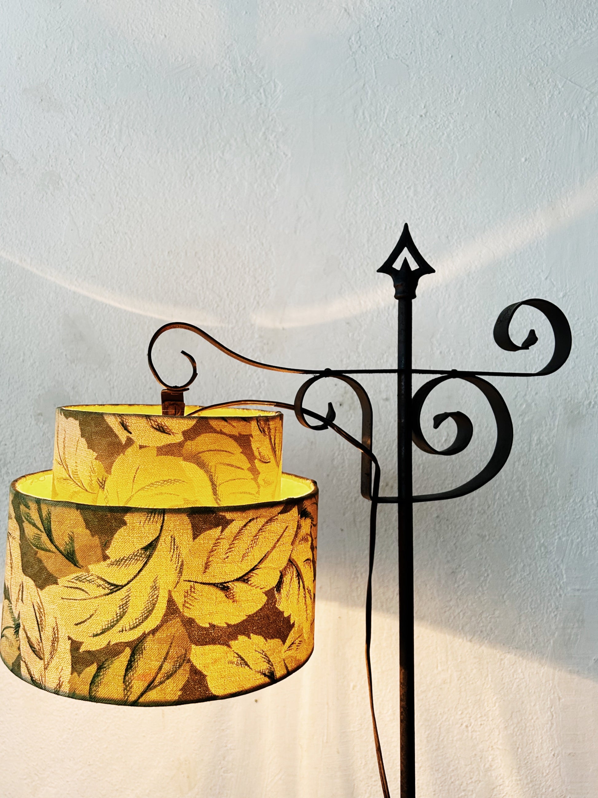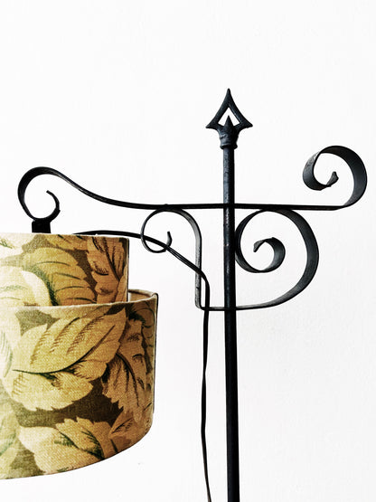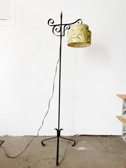 Gorgeous antique wrought iron floor lamp with original shade. Pull chain socket, overall excellent condition. Minor age marks to the shade but nothing that detracts.