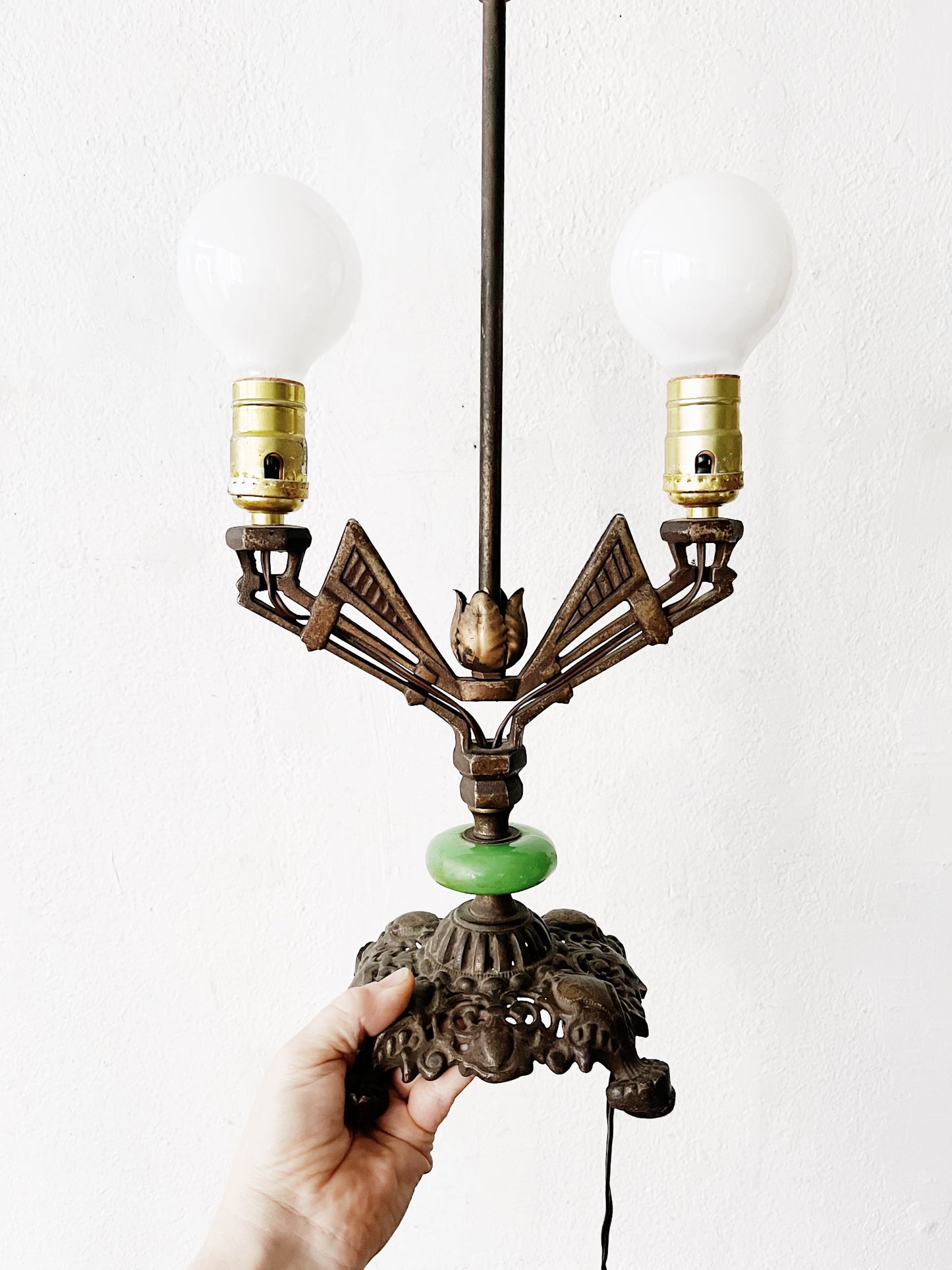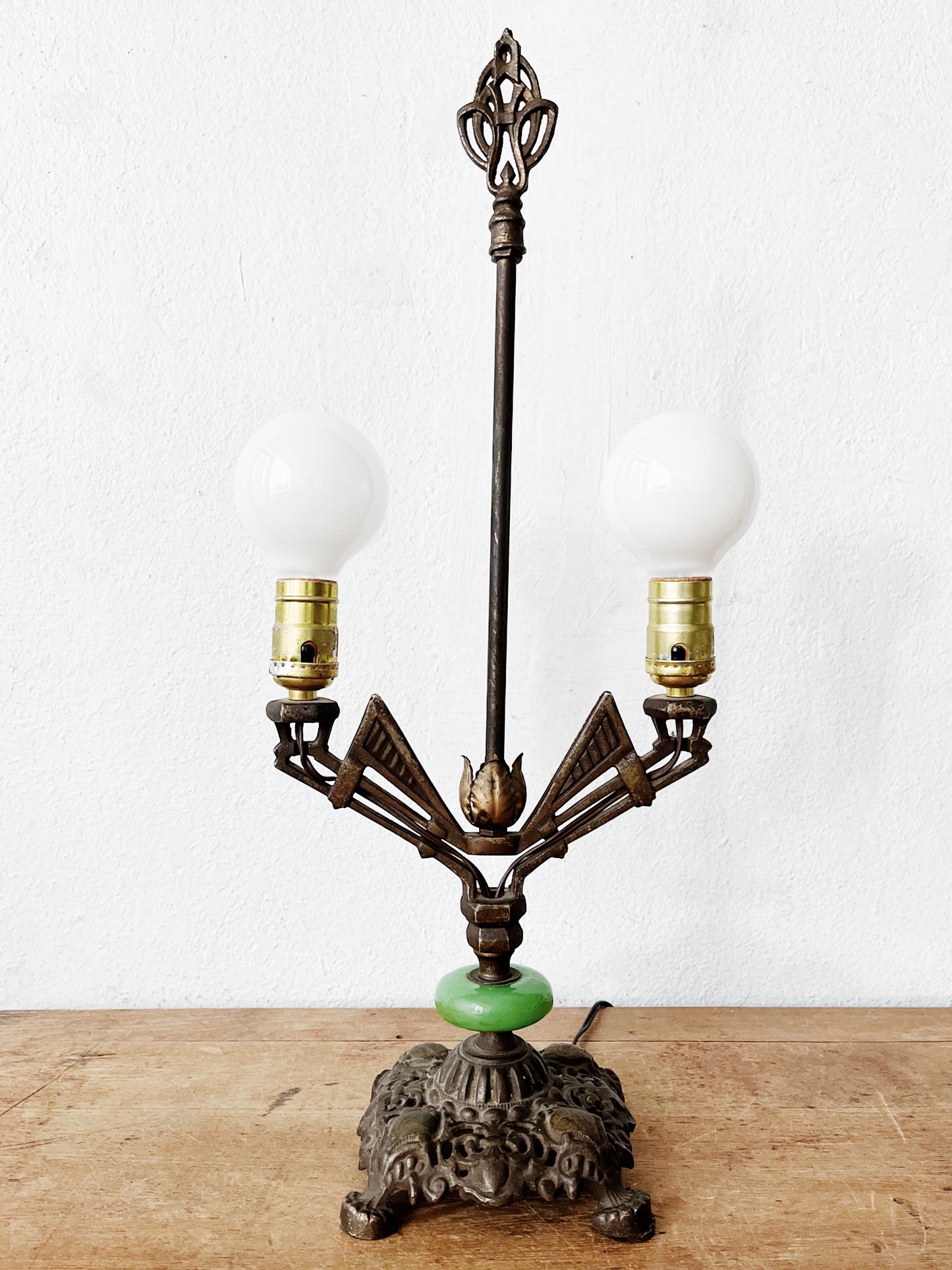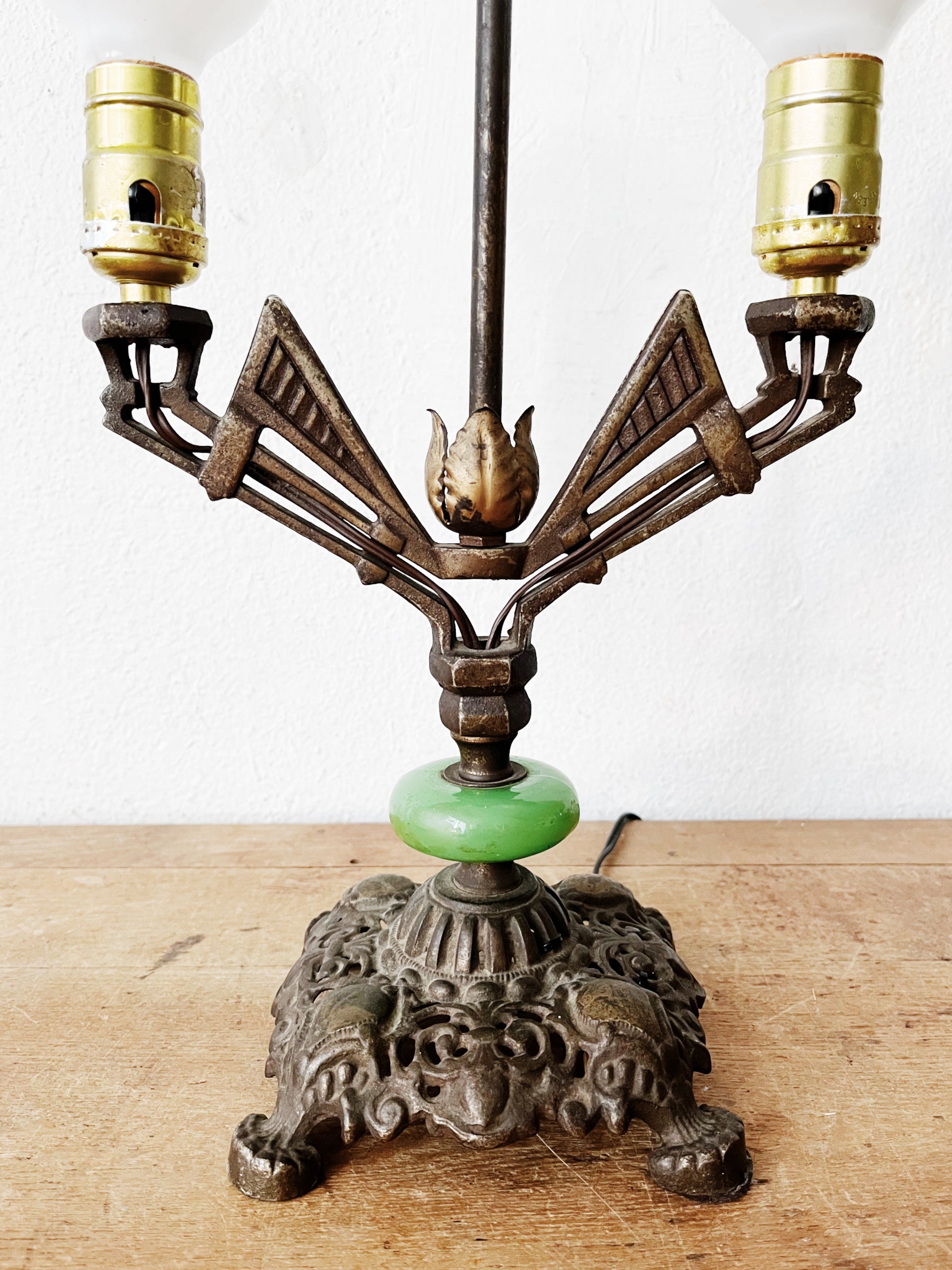 Stunning bronze lamp from the early Art Deco era. Heavy weighted intricate base. Amazing details in the jadeite glass and geometric stem. Shadeless because we like it that way but this will take a shade. Wiring has original and both sockets work independently of each other