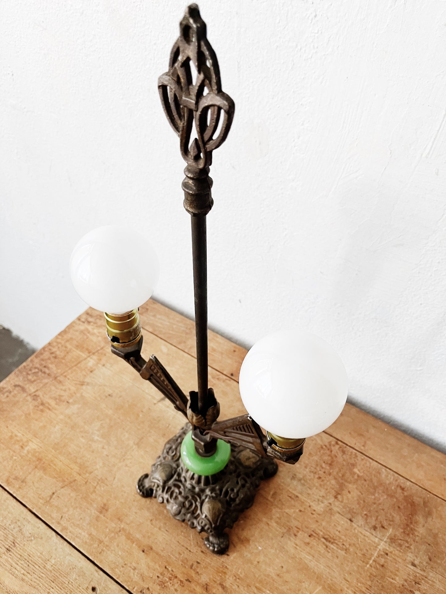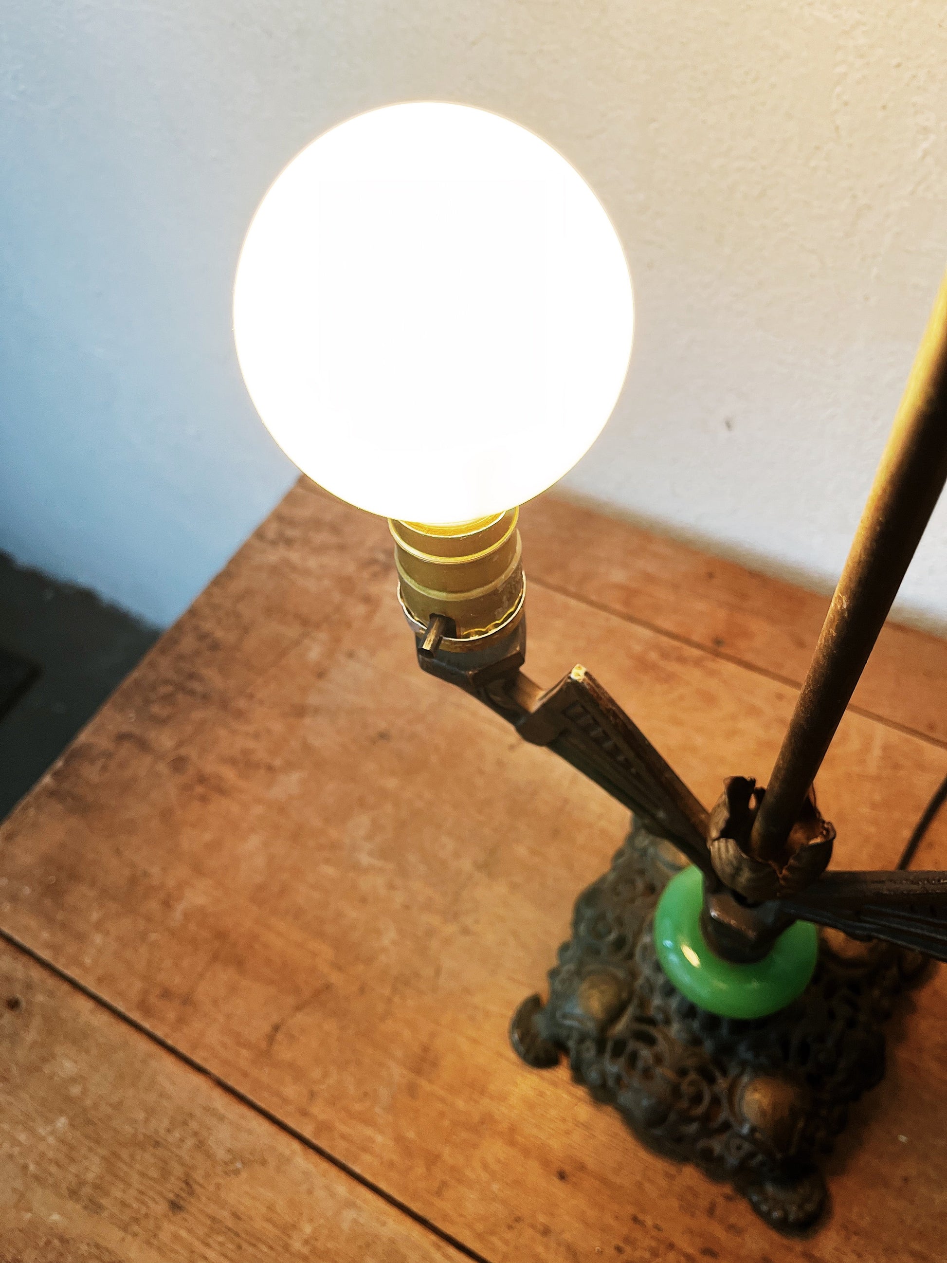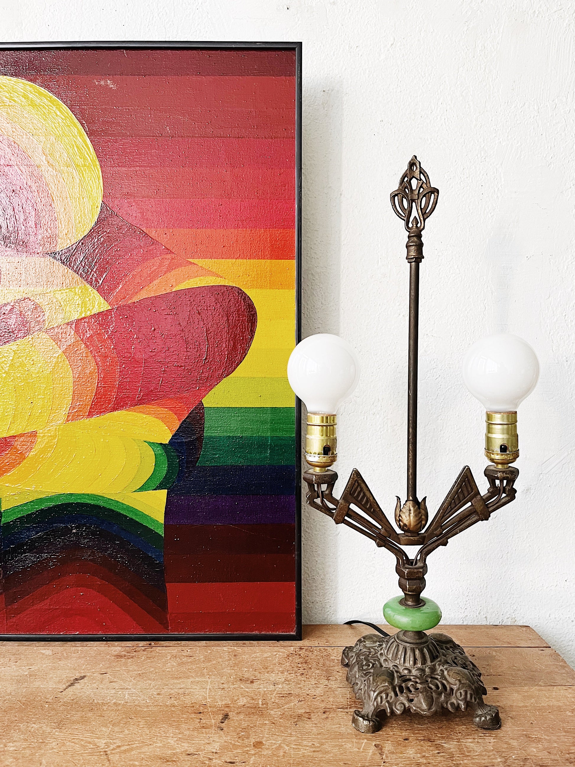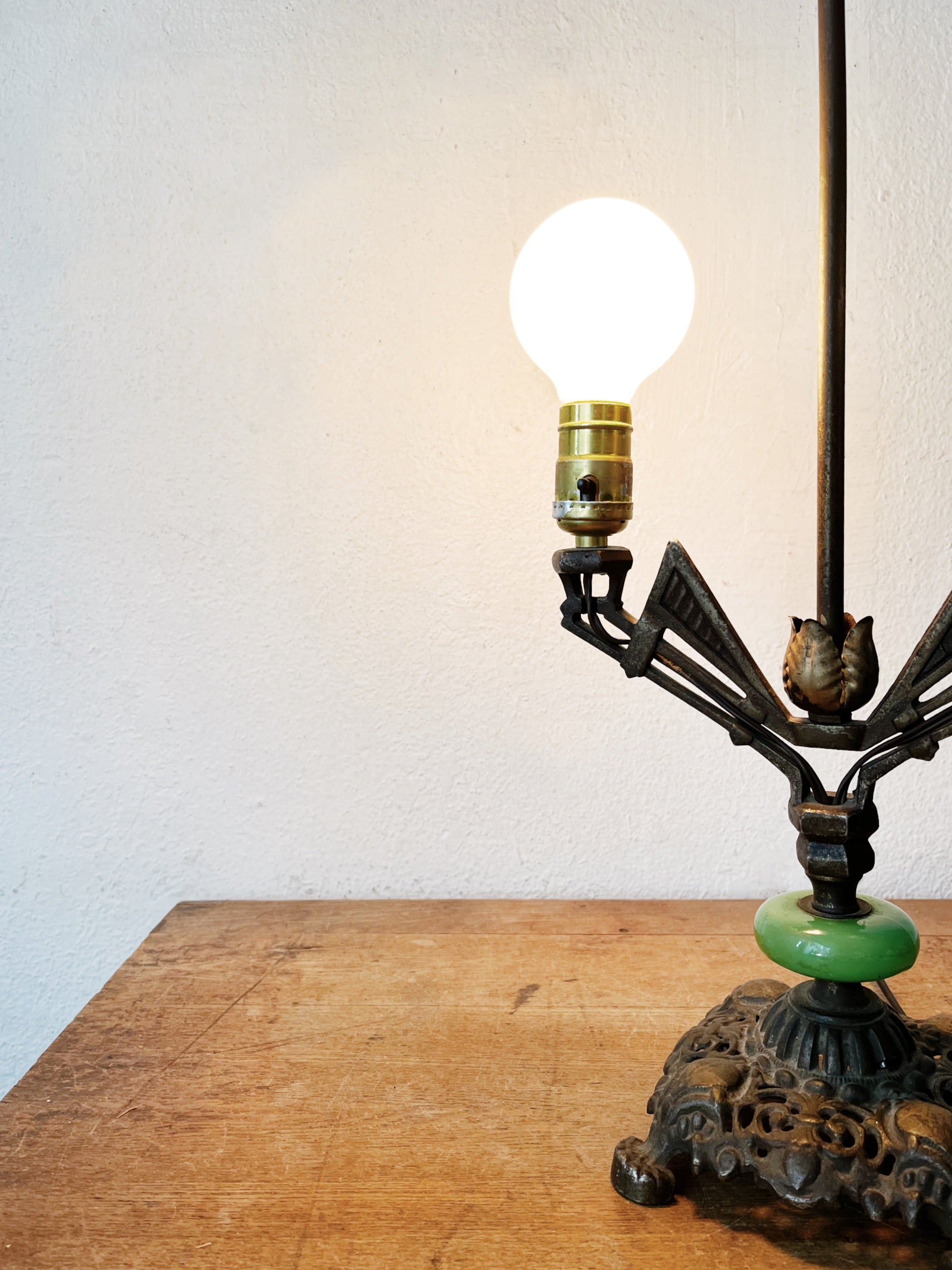 Stunning bronze lamp from the early Art Deco era. Heavy weighted intricate base. Amazing details in the jadeite glass and geometric stem. Shadeless because we like it that way but this will take a shade. Wiring has original and both sockets work independently of each other