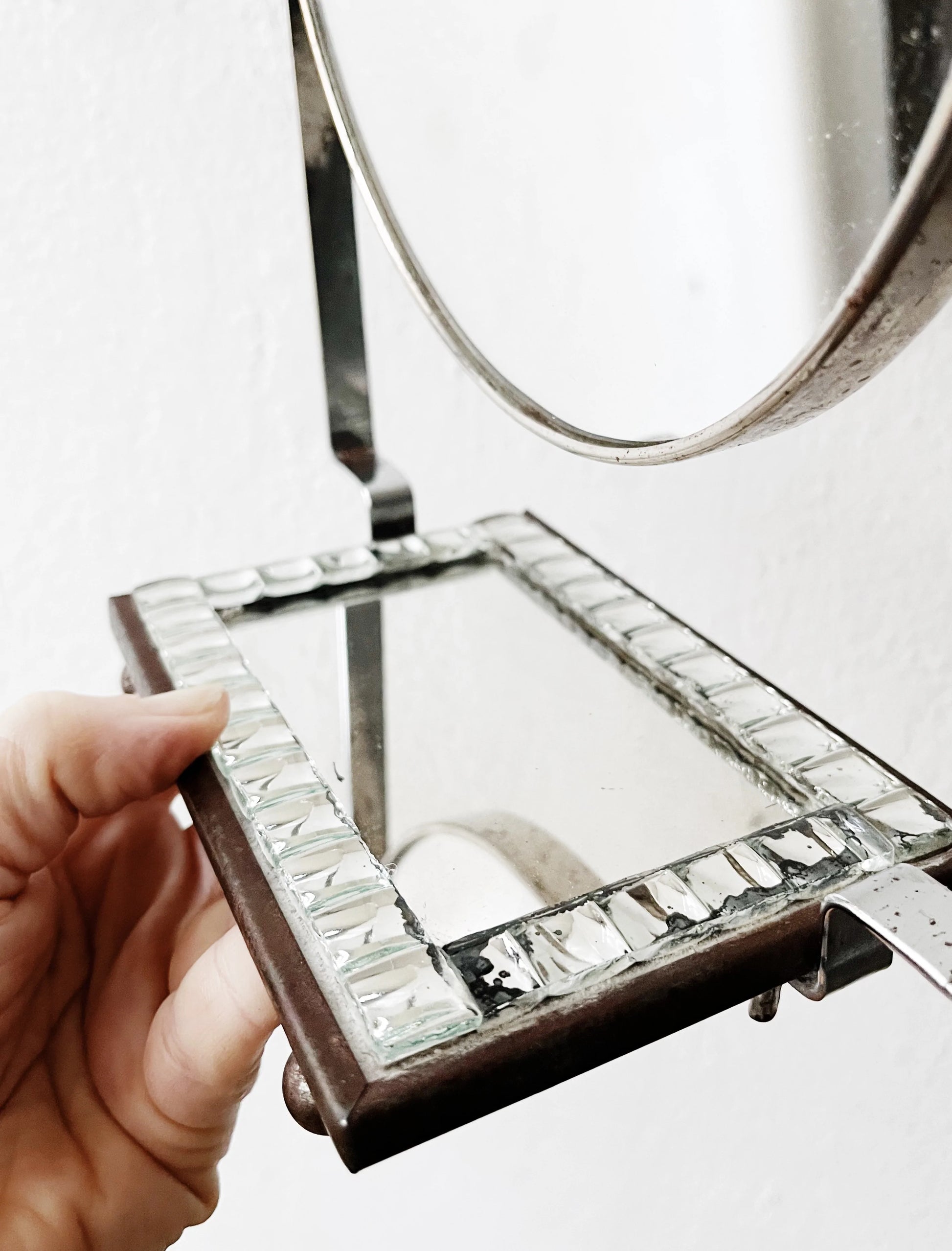 Really special chrome vanity mirror from the art deco era. Has a swivel to magnify. Look at those little glass tiles at the base and chrome feet. Perfection! Some overall surface wear as shown.