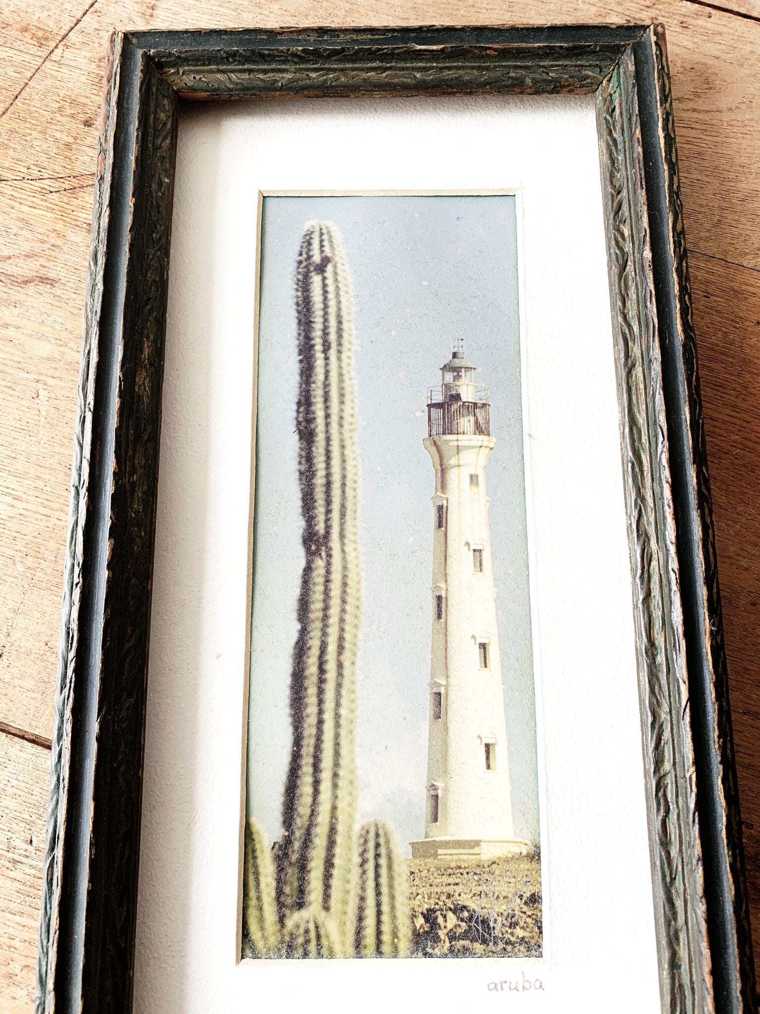 fantastic vintage film photo of a giant saguaro cactus and lighthouse. Love the orientation. Signed and labeled ‘aruba’