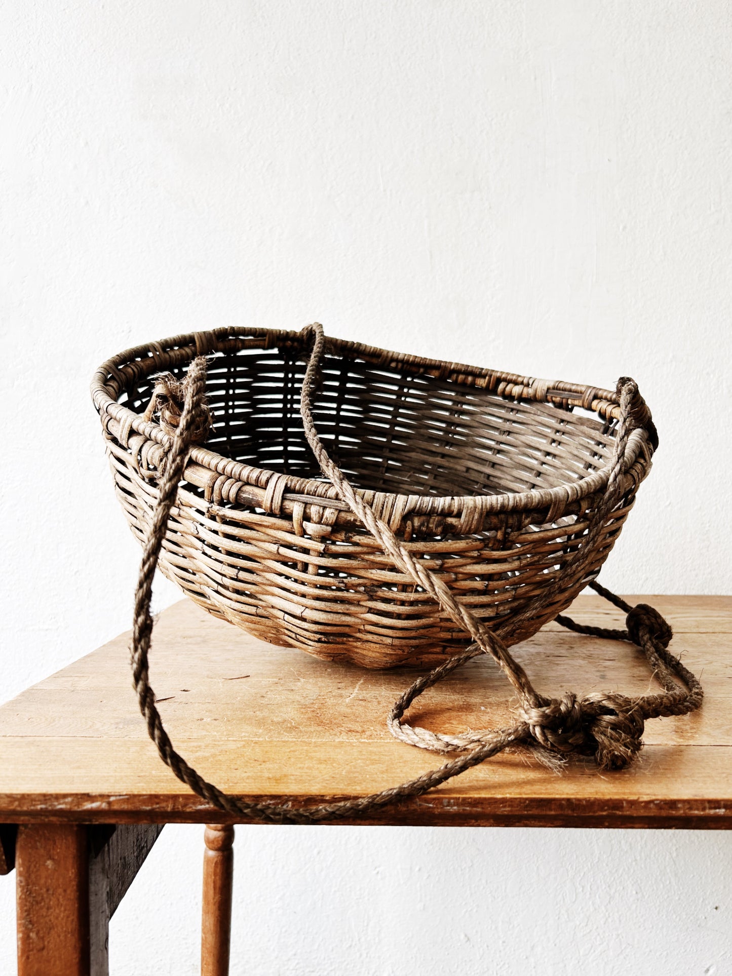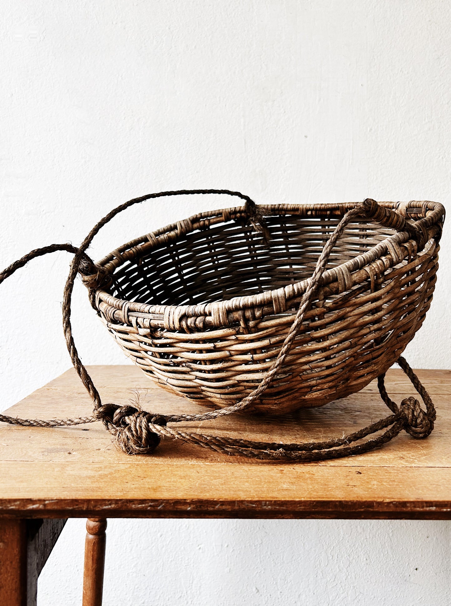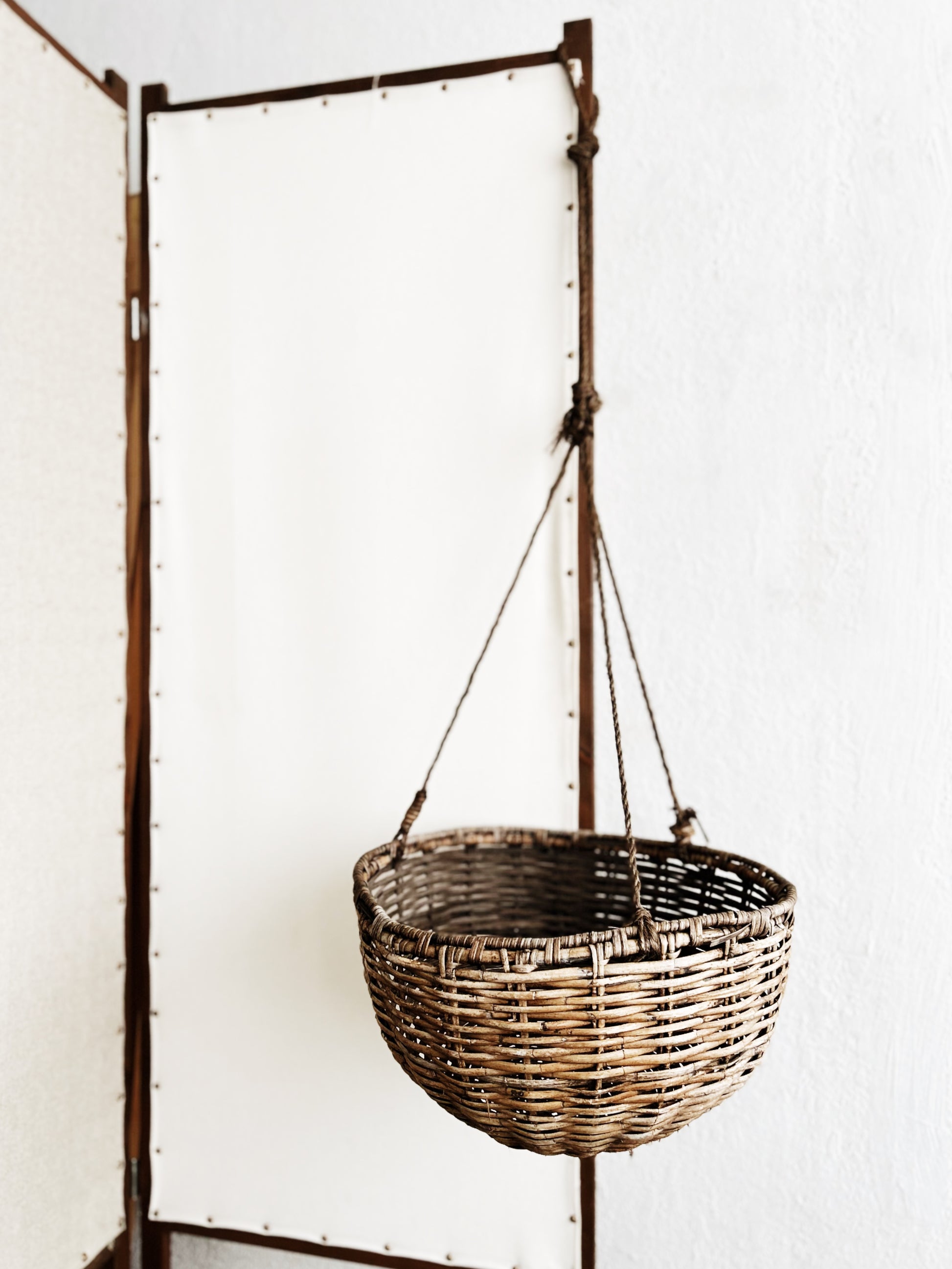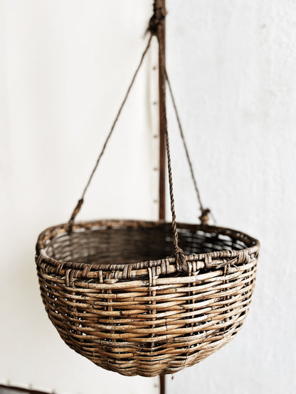 Larger sized grapevine basket planter with rope hanger. Pretty hanging outside from a low branch and filled with ferns