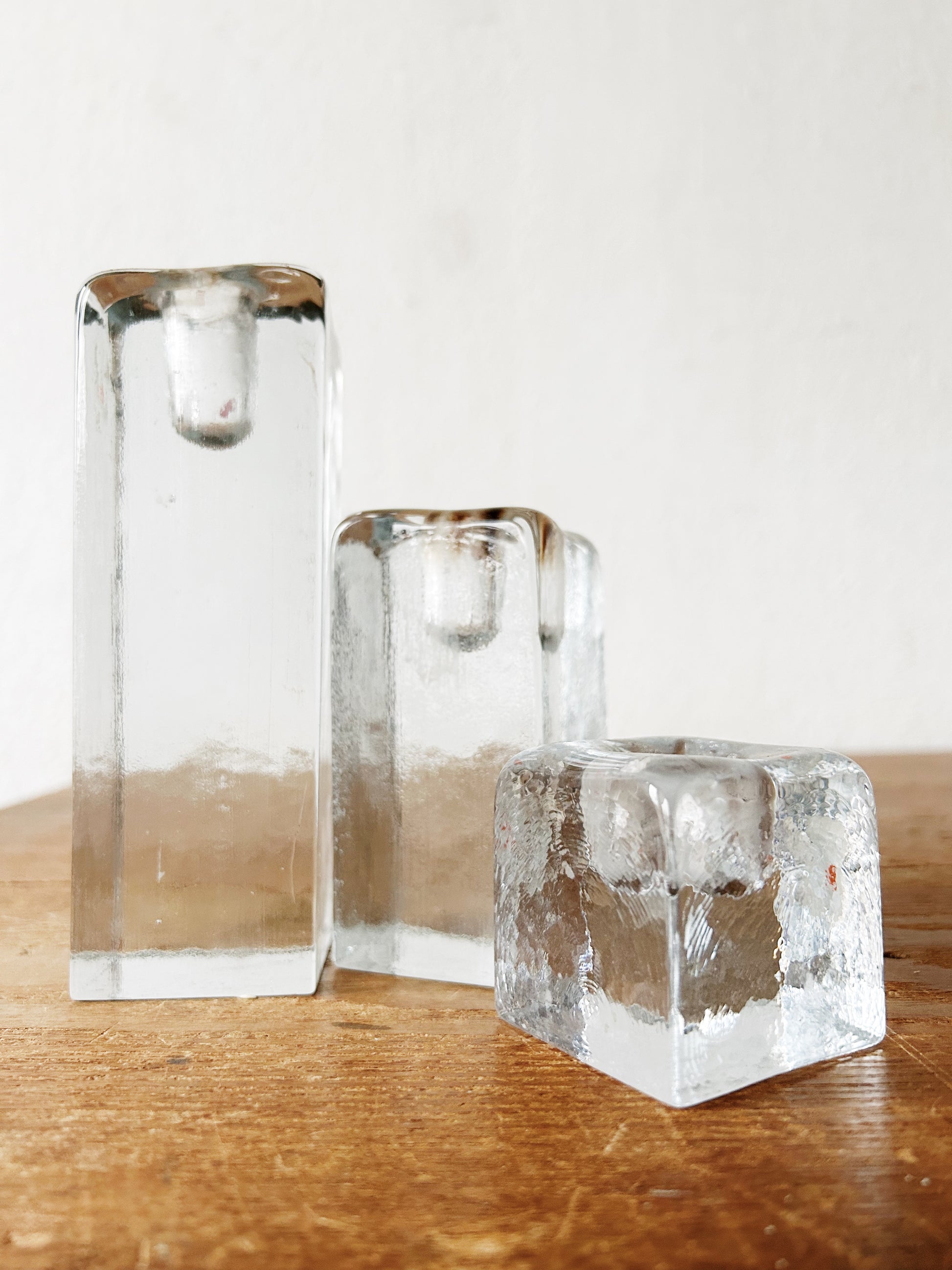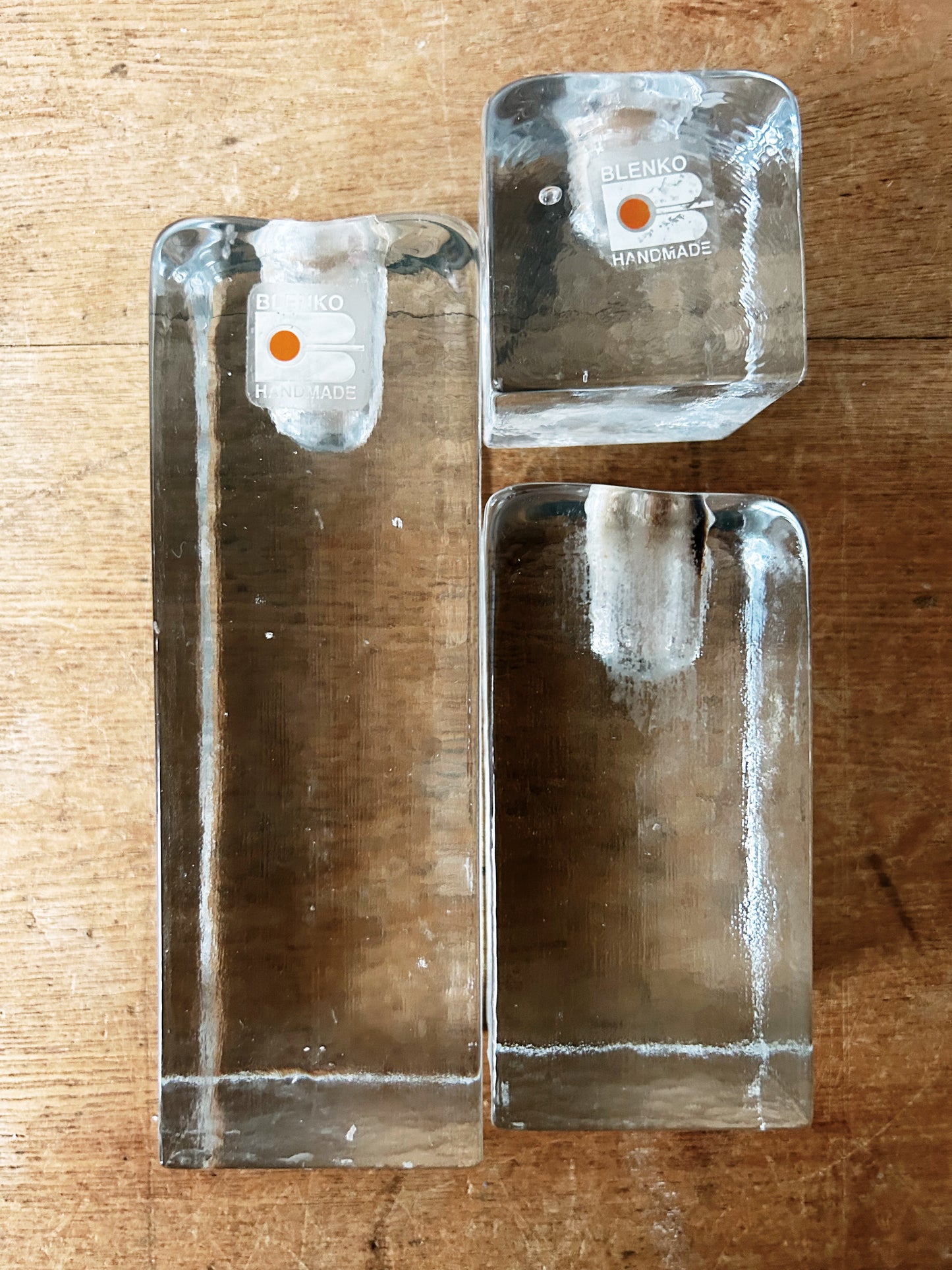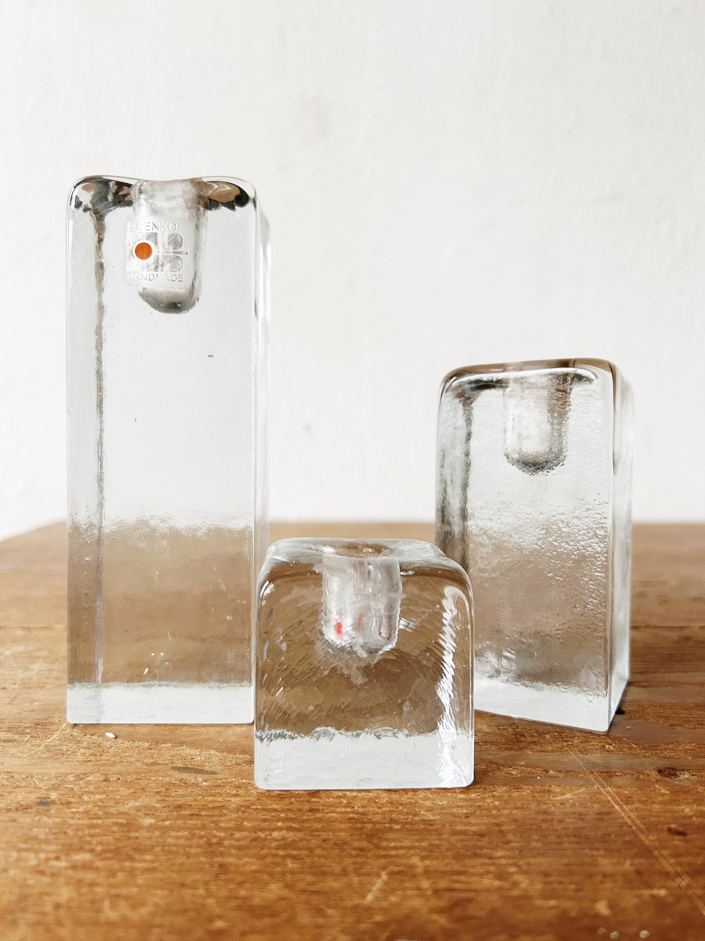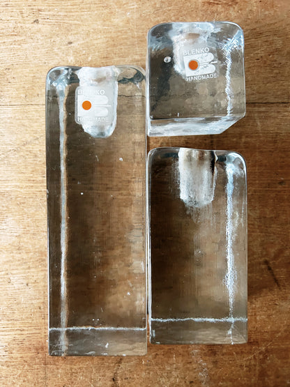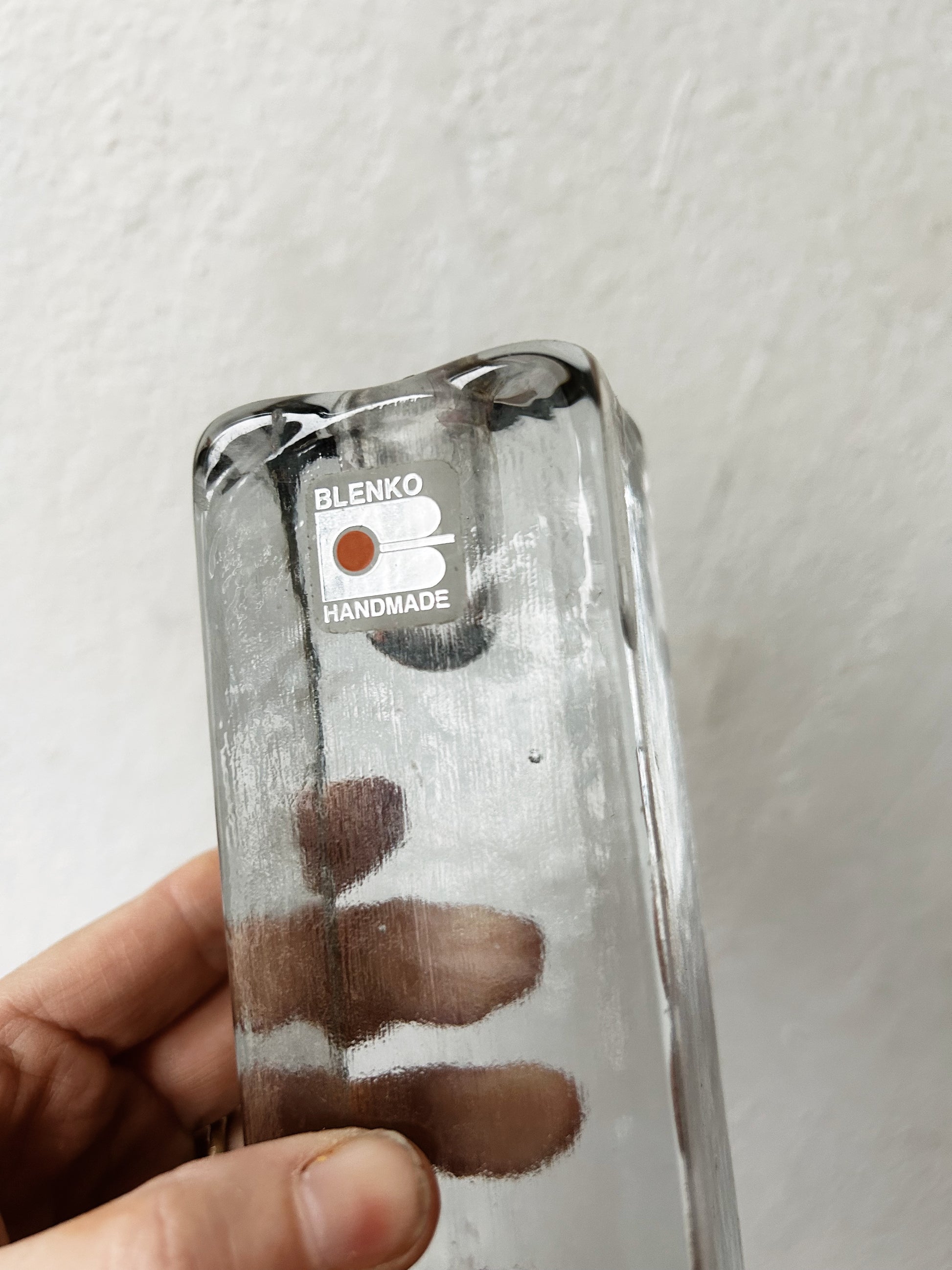 Post modern chunky, weighty Blenko candle holder. Ice cube style, handmade. Original sticker