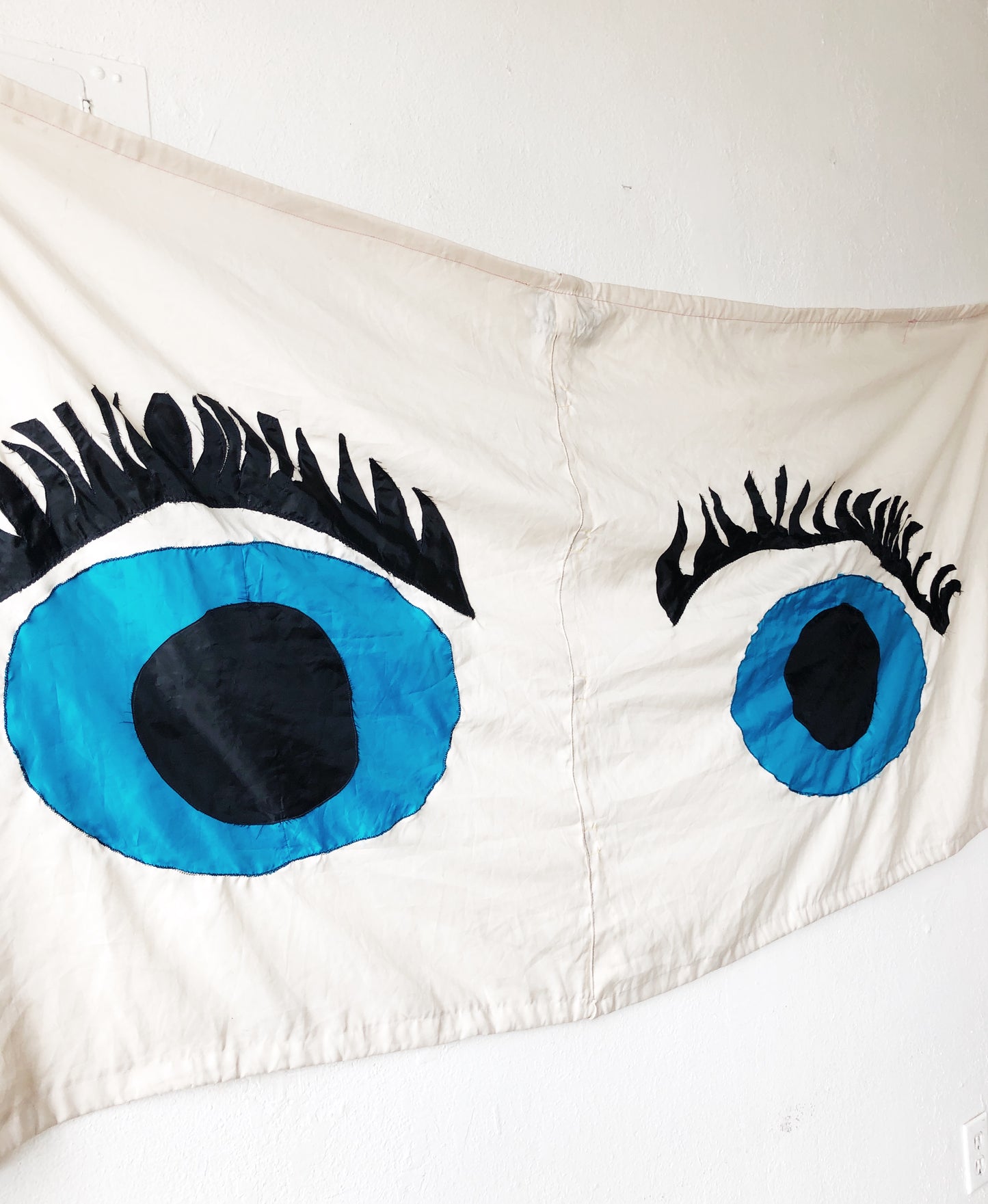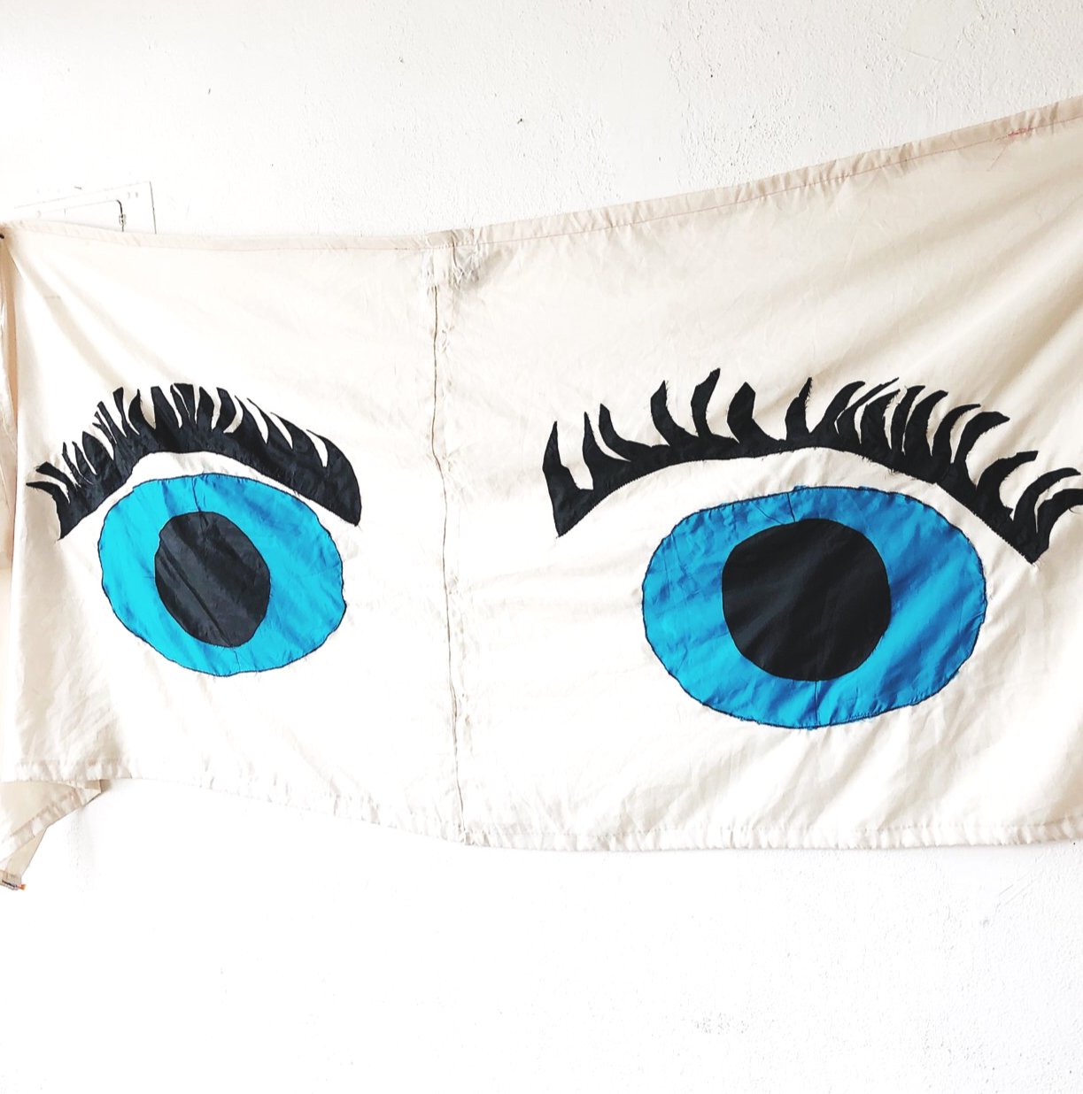 This is somethin’! Big blue eyes patched on a nylon banner. It has a hem for a dowel rod or flagpole. The fabric is worn in areas and had a few stains but no tears