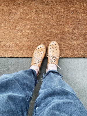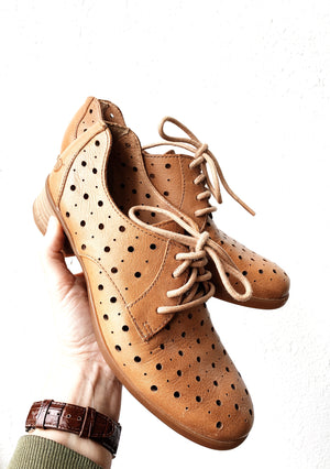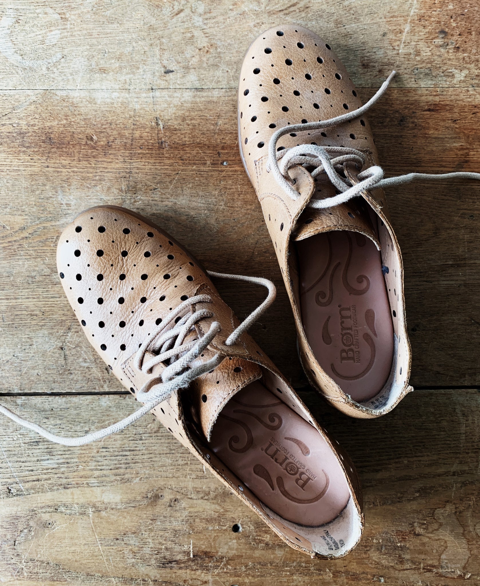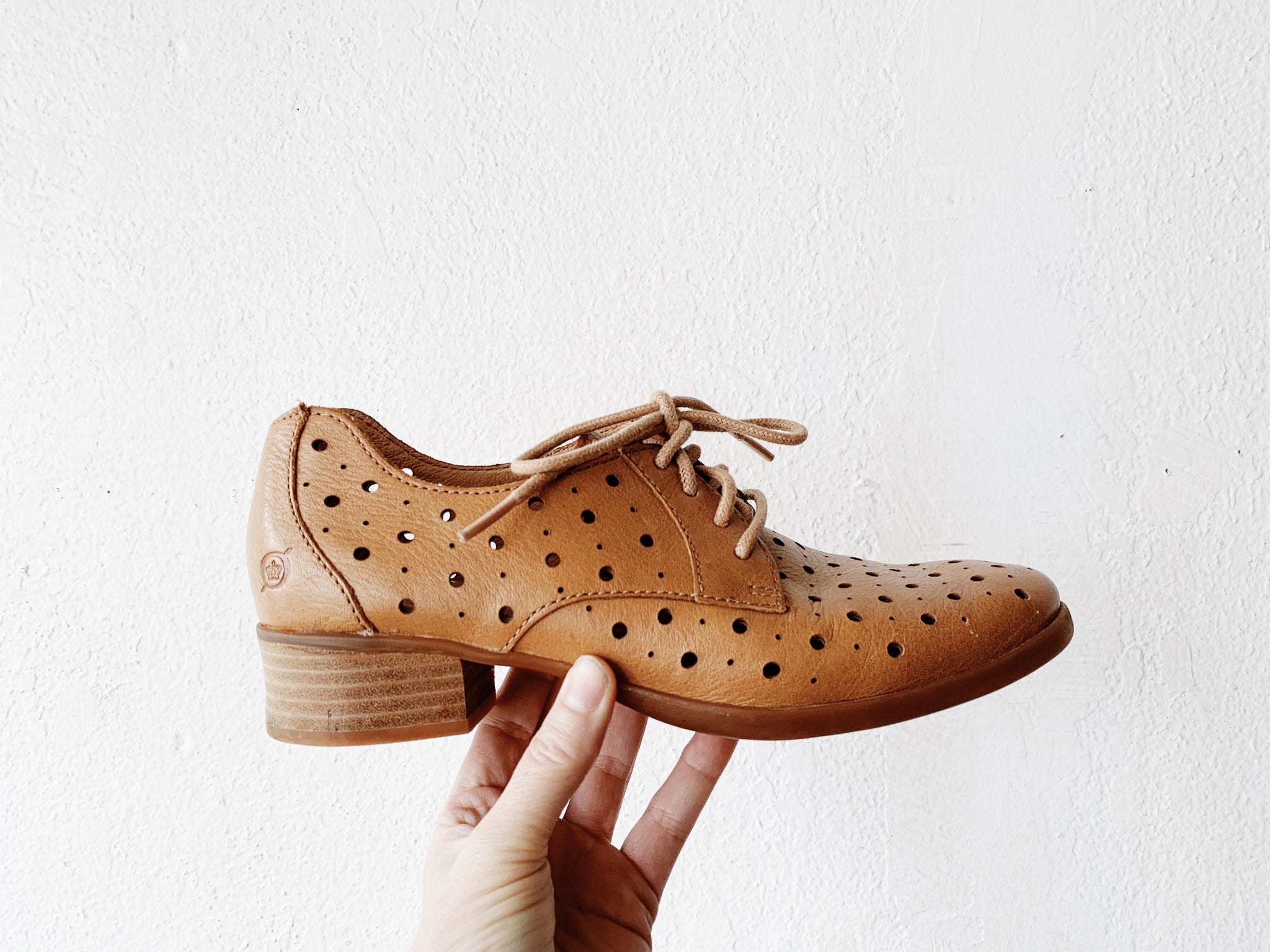 A fantastic pair of Born leather oxfords with holes!ove these. Super comfortable and in new condition. Stacked wood heel. Size 38.5 and fit is true to size 8.5.