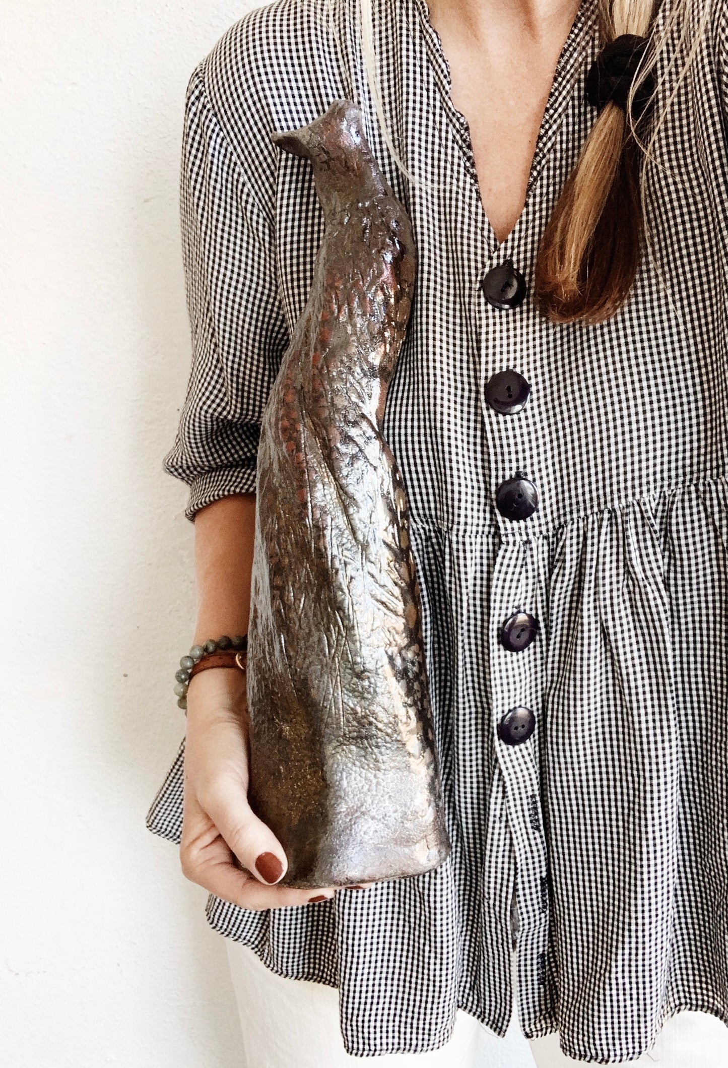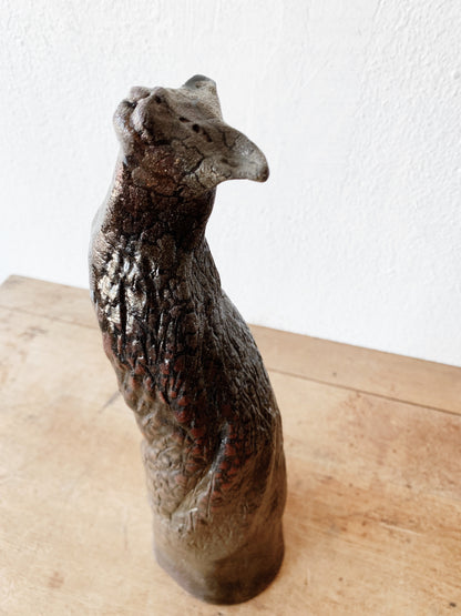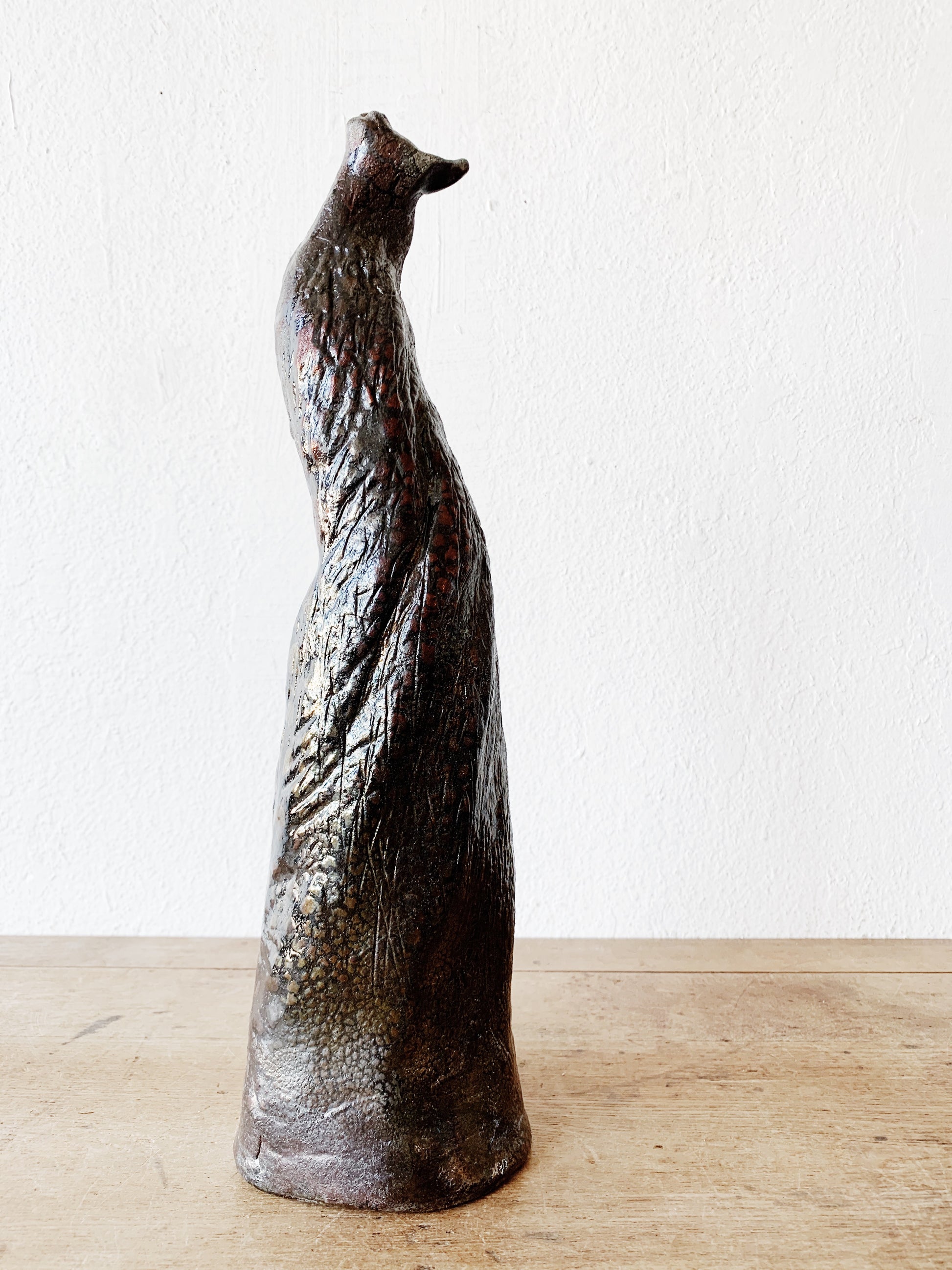Signed vintage brutalist style weighty sculpture with fantastic serpent like metallic glazing.