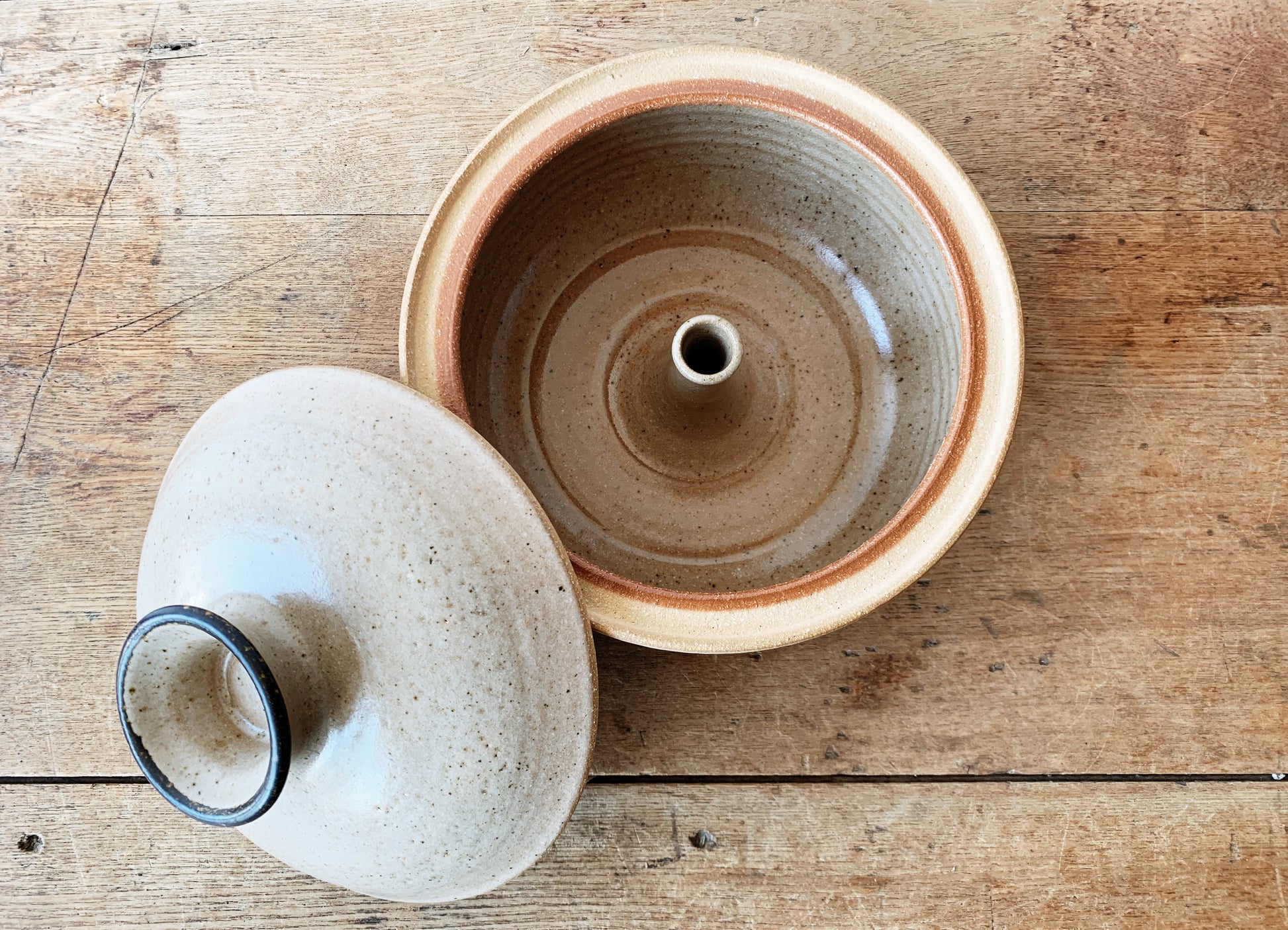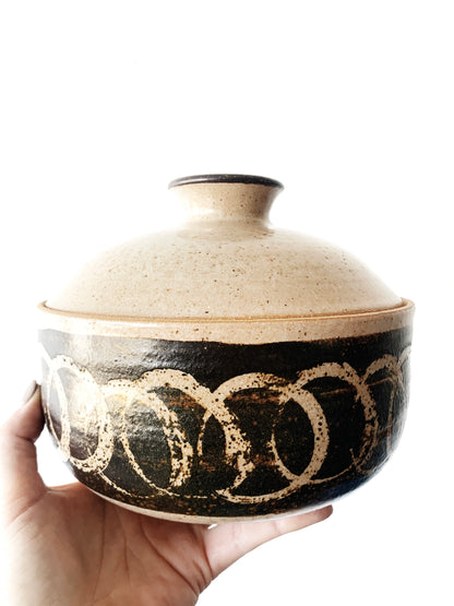 Earthenware lidded vessel / bowl with darkened abstract circle glaze patterning. Excellent condition