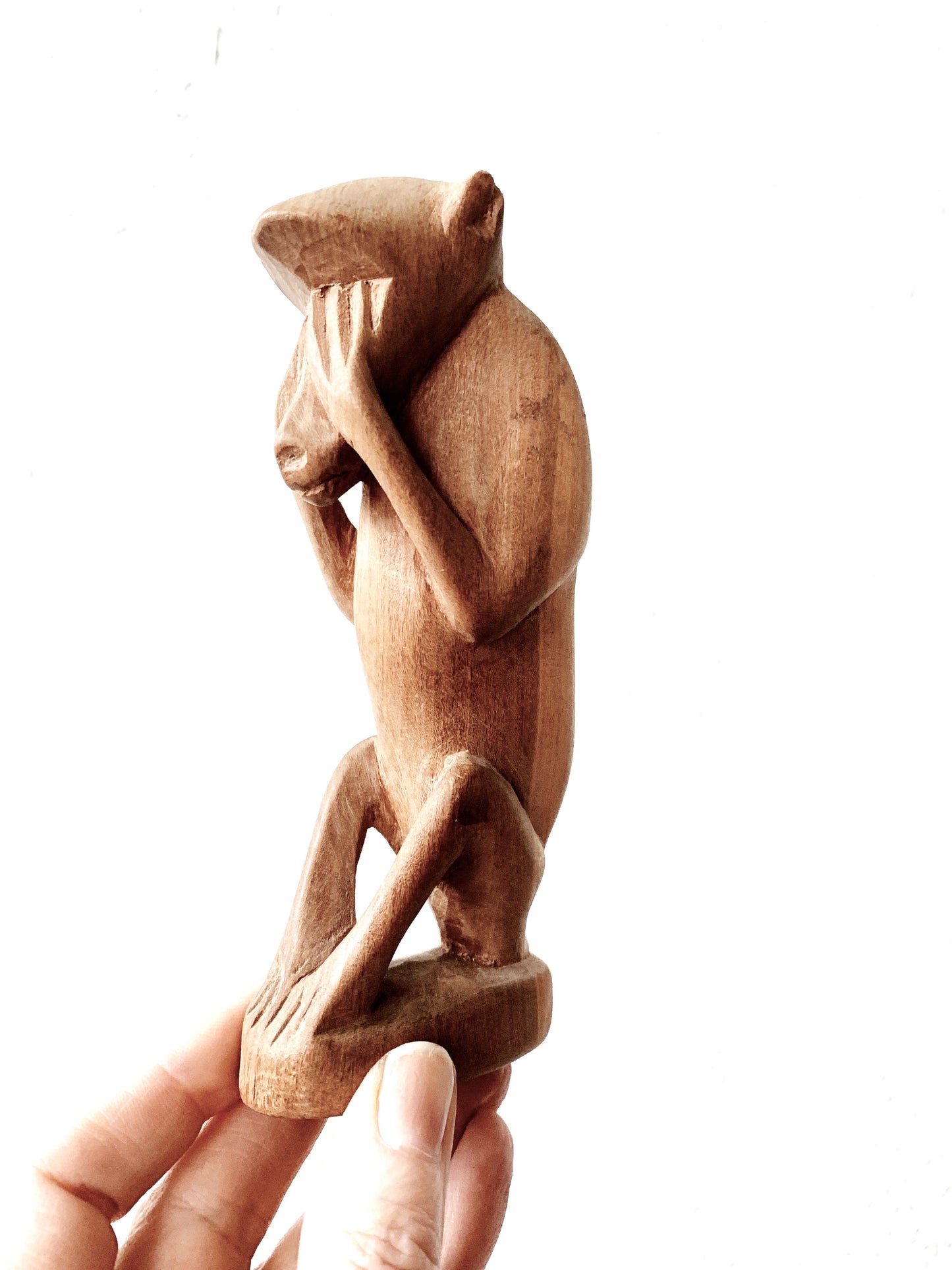 Carved wood monkey hiding his eyes. Likely from ‘See no evil’ trio. We like him solo! ;)