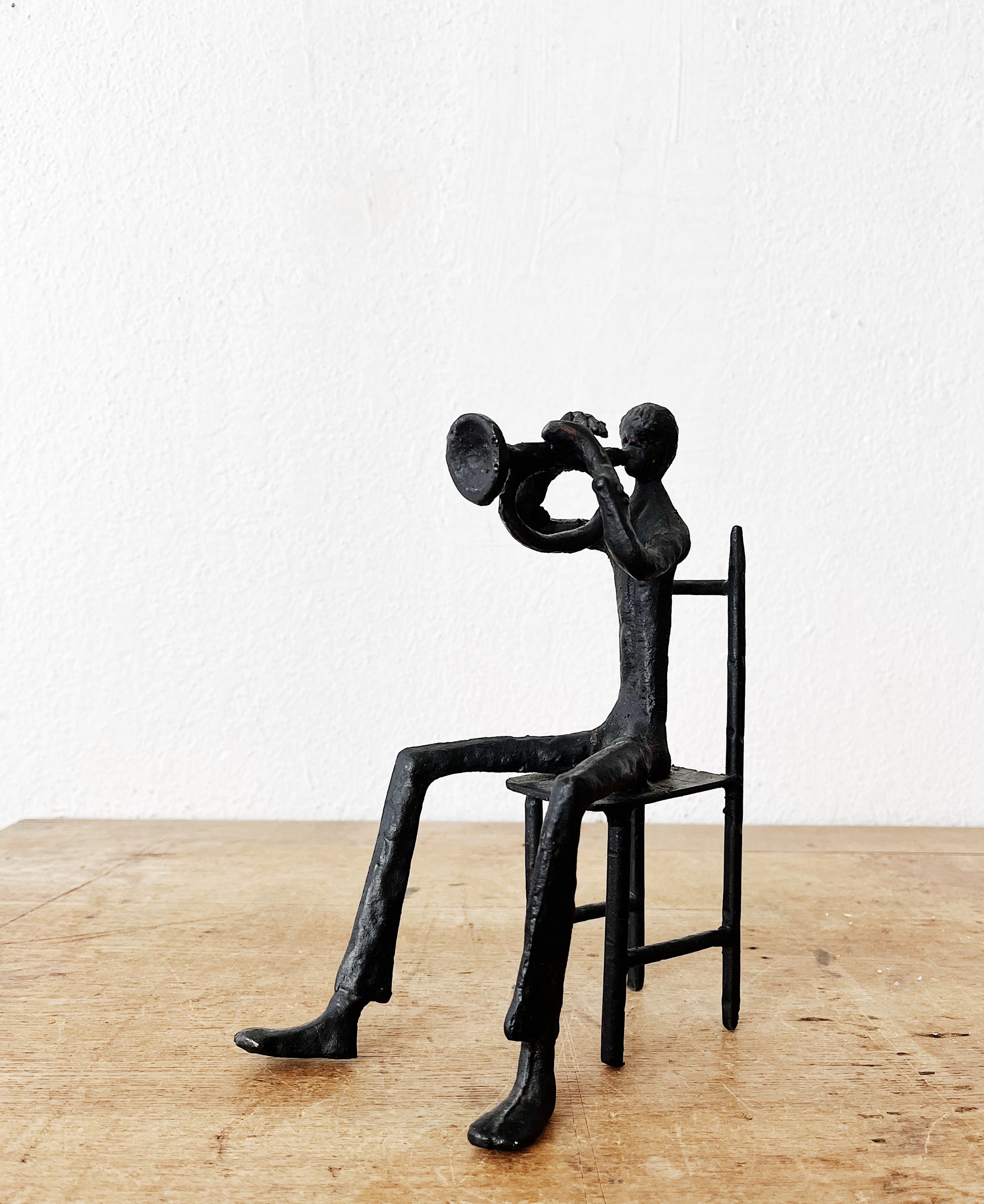 Larger sized cast iron sculpture of a seated trumpeter. Nice one for jazz and music lovers