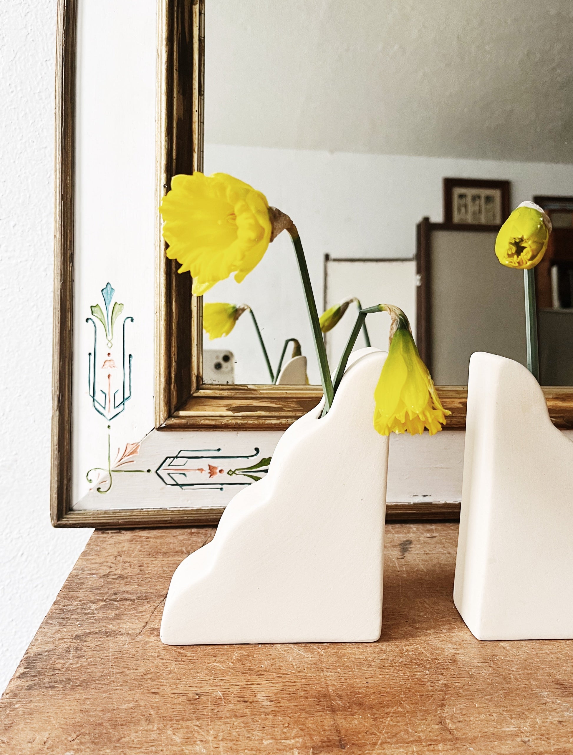 Matte ceramic vase with a fun wavy edge. We also think two could be filled with pebbles or sand and used as bookends. As with mush unglazed clay, some seepage does occur at the base with water use.