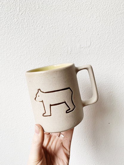 Perfect ceramic line drawn bear mug with pretty yellow glaze inside. Natural our. By Pigeon Forge Pottery.