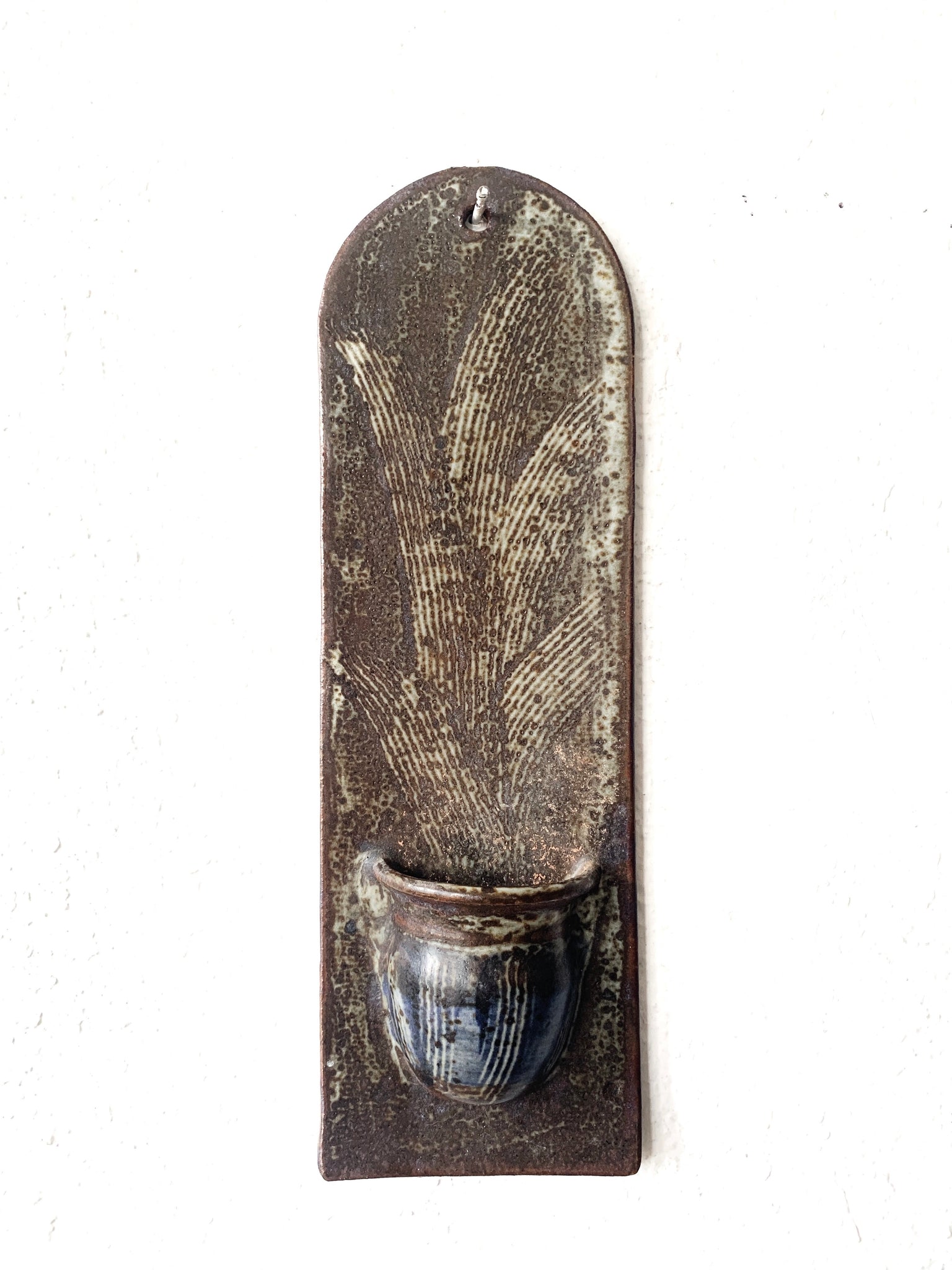 Lovely ceramic wall pocket vase with holder for incense or a small flower. Rustic and beautiful, brown, creams and touch or indigo on the pot.