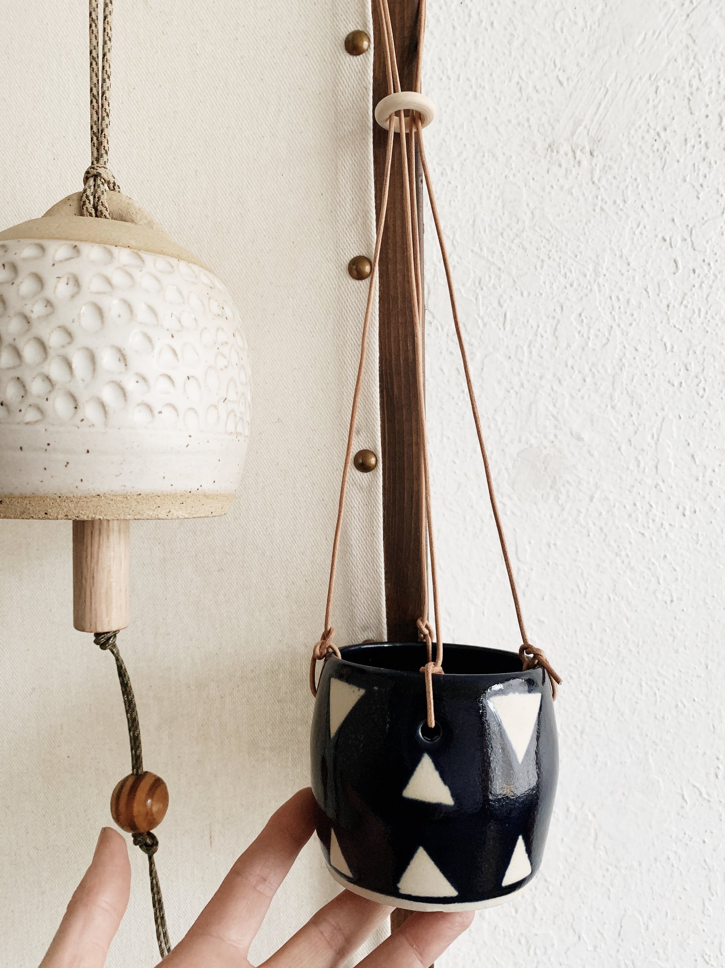 the hanging pot is by Small Spells which we added leather cording and wood bead to. 3x3” pot, hangs 21”