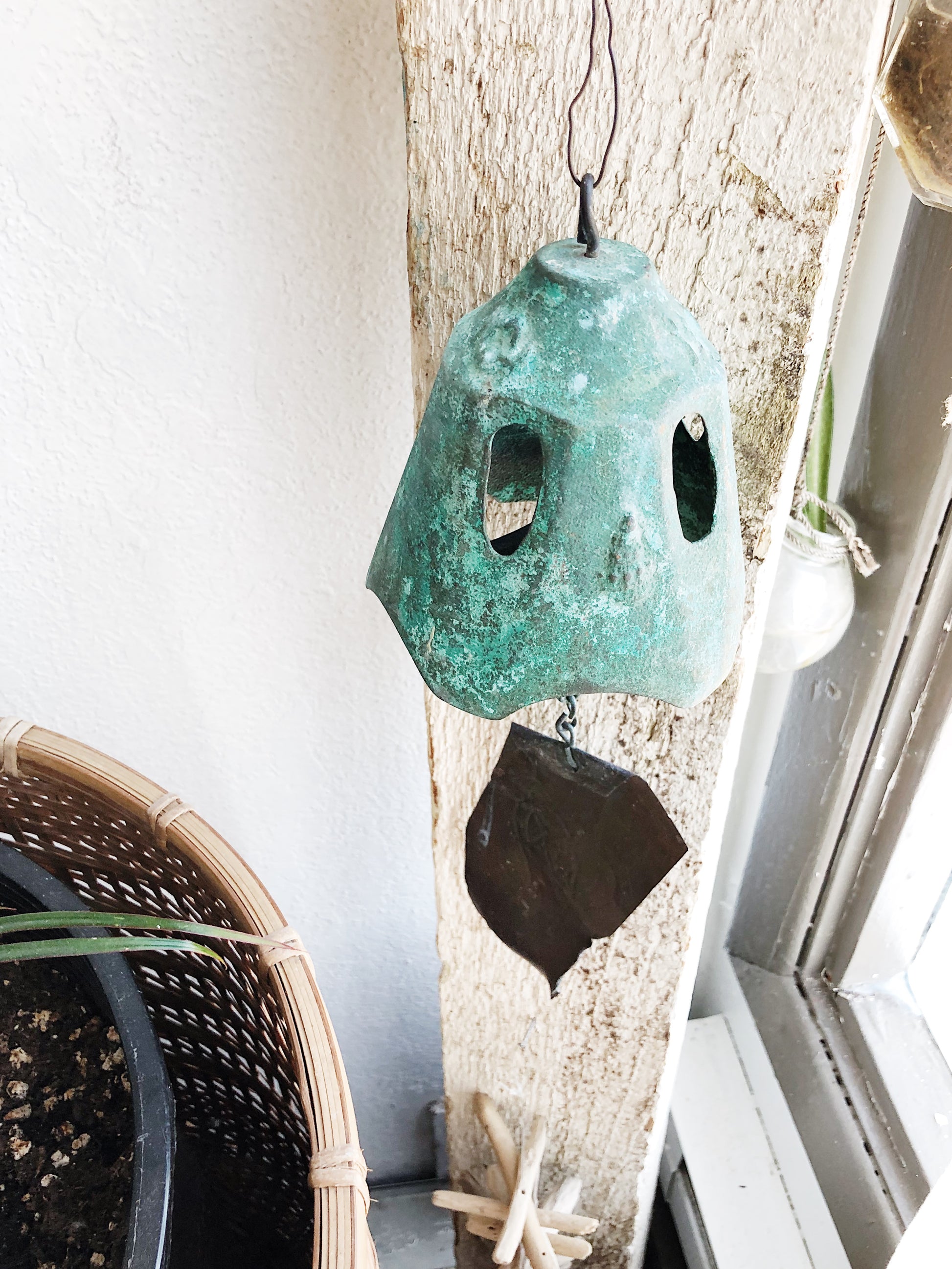 Mid century bronze bell by artist Jeff Cross of harmony hollow bells. In the spirit of Paolo Soleri. Verdigris patina and embossed clapper. Marked HHBC