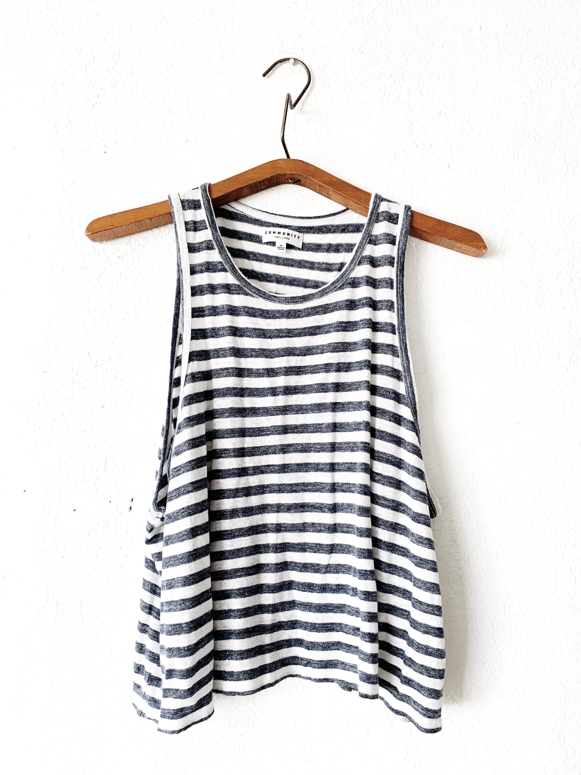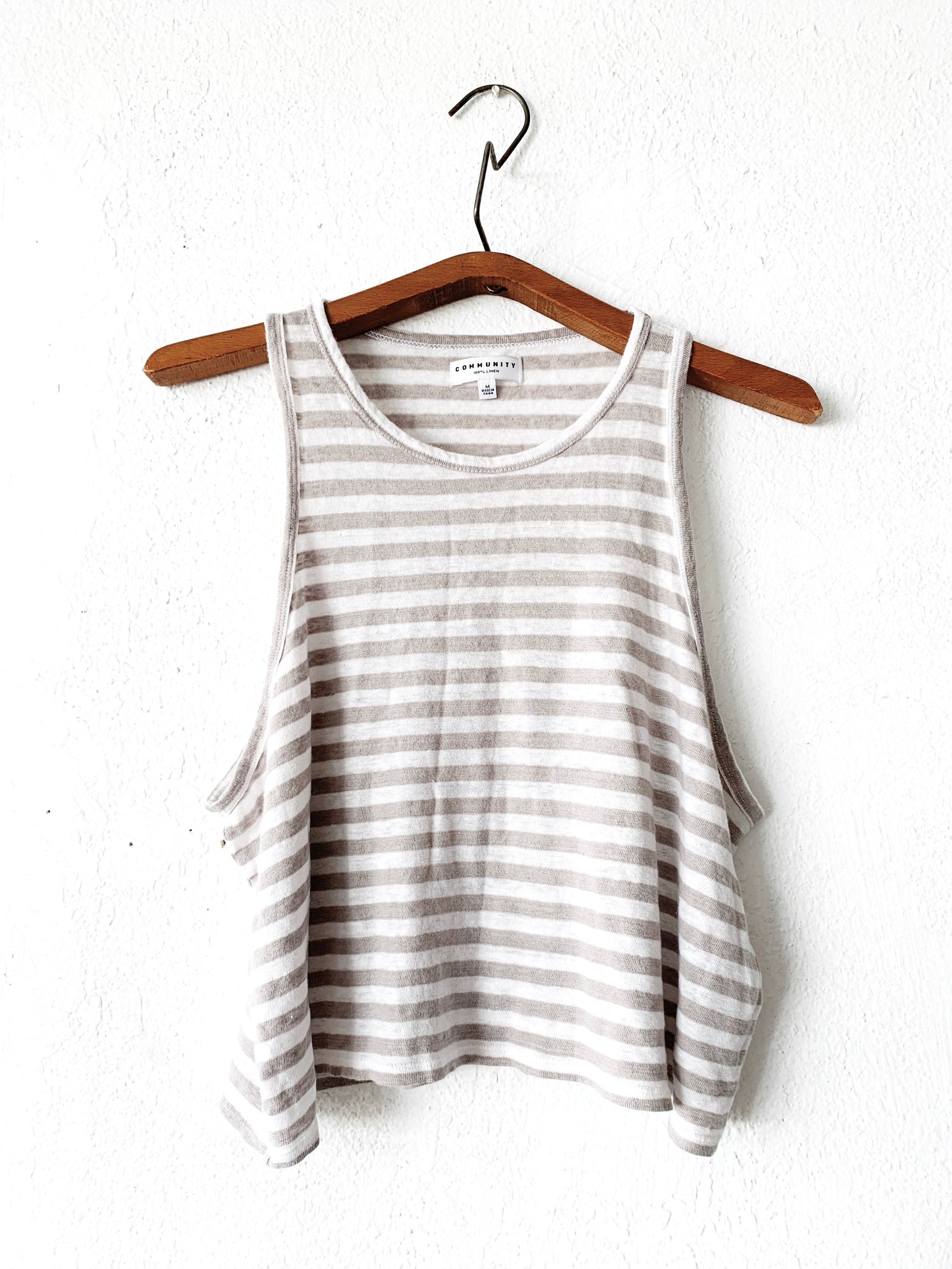 Community linen striped tank to perfect for summer. Cropped and long open sides which means you need to layer or wear over bathing suit/ sport bra etc.