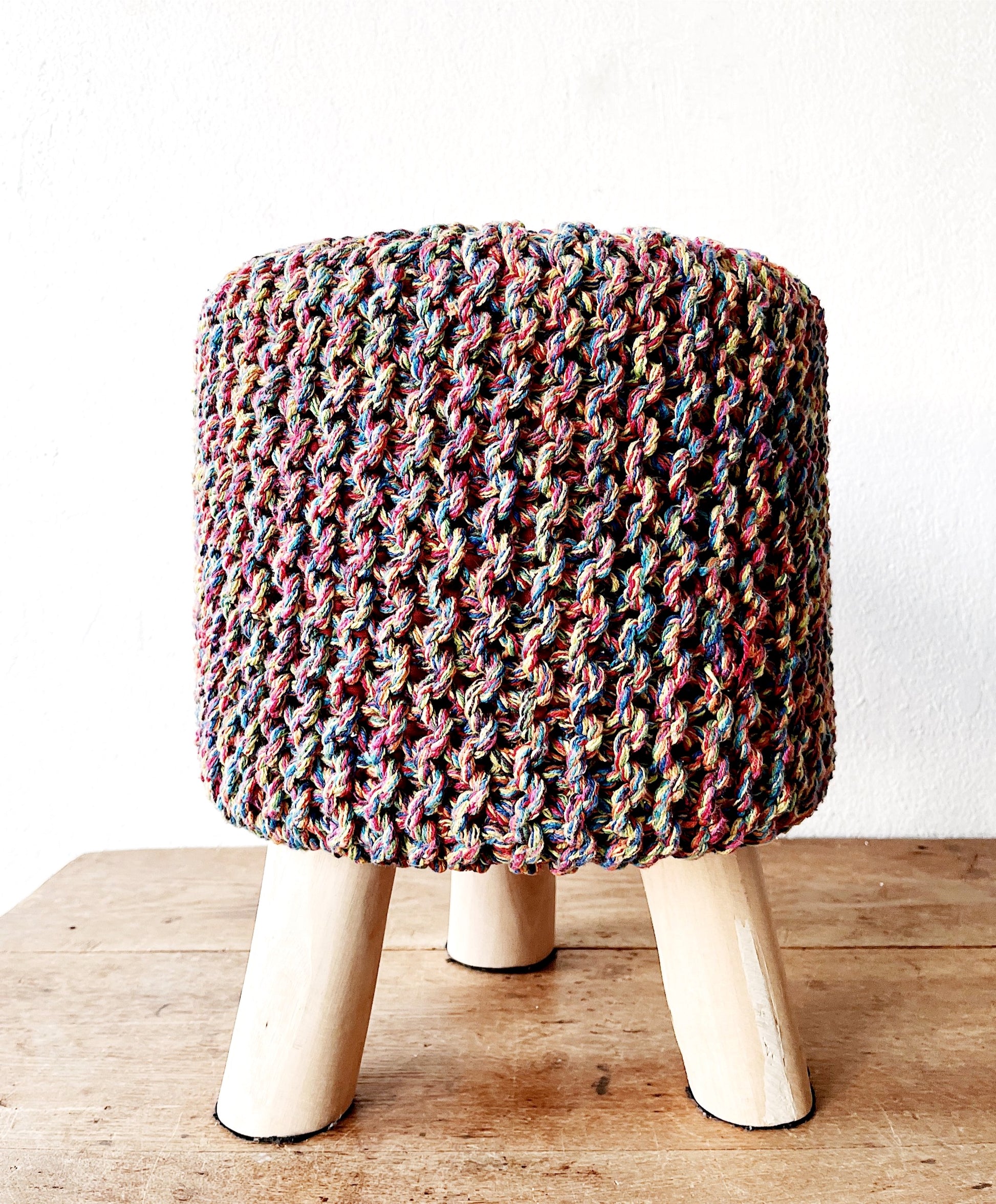 Padded stool with nicely colored cotton crocheted cover. Confetti colors. Cozy craft mod look. Thick tree branch legs sanded smoothly. Sturdy enough for sitting or stepping on.