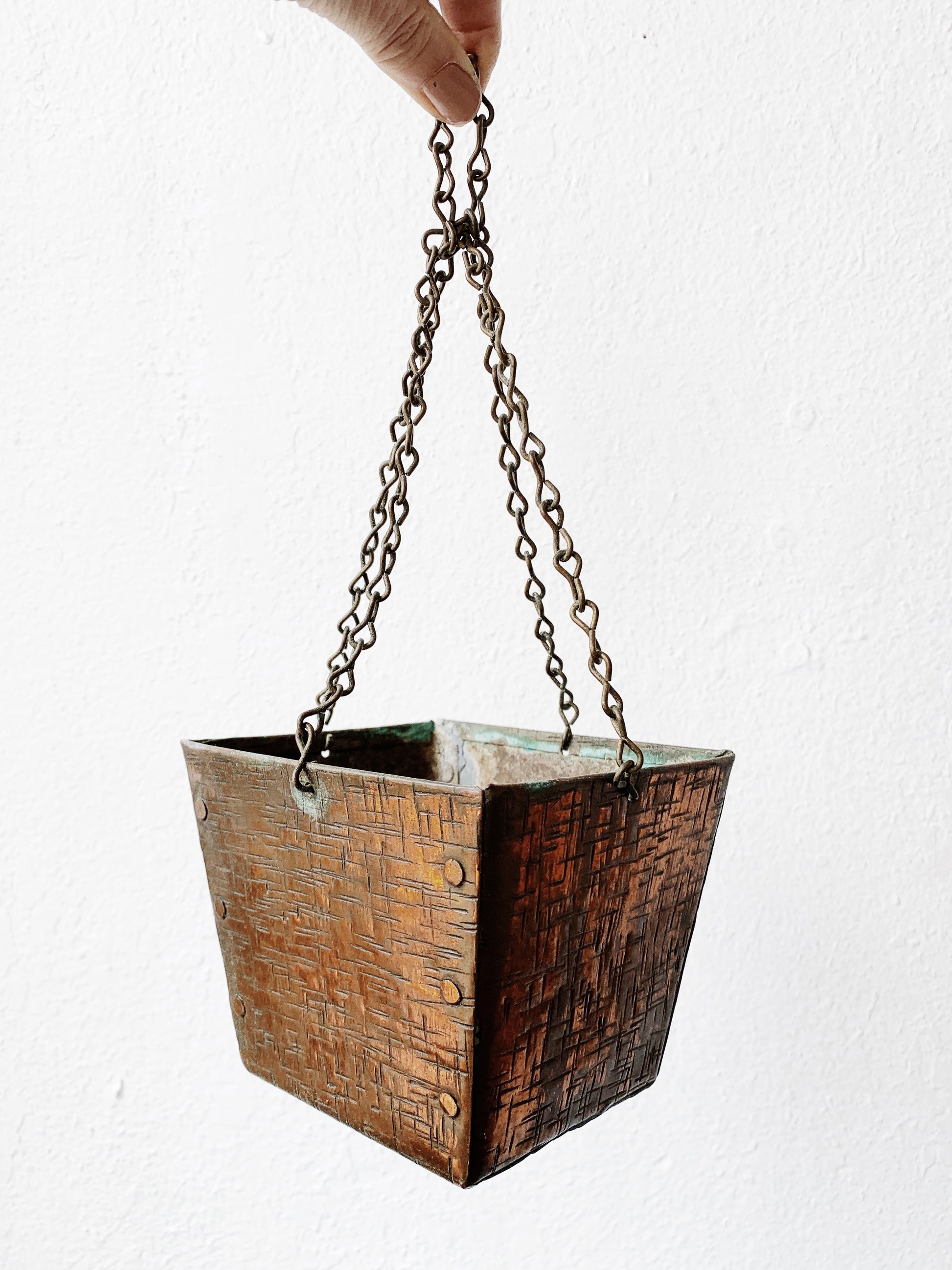 Wonder aged etched copper hanging pot. Copper nails too! A gorgeous little thing with most excellent patina and cross hatched etching. Brass chain.