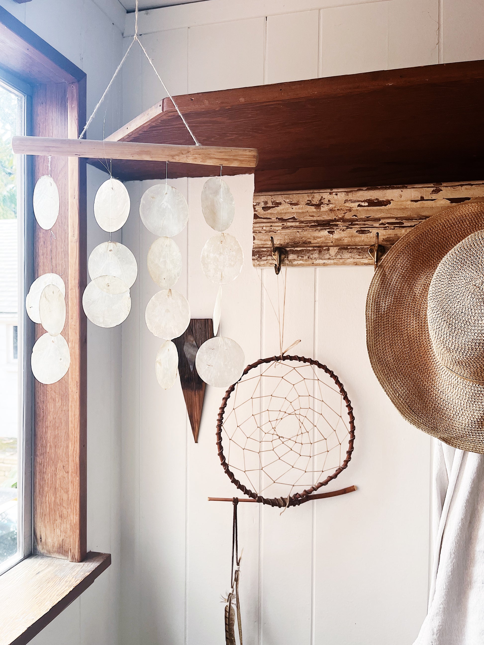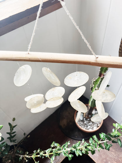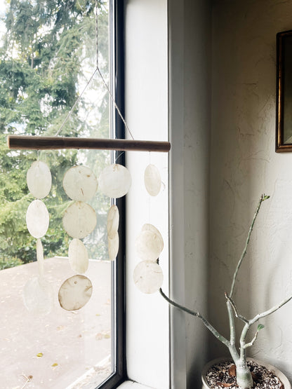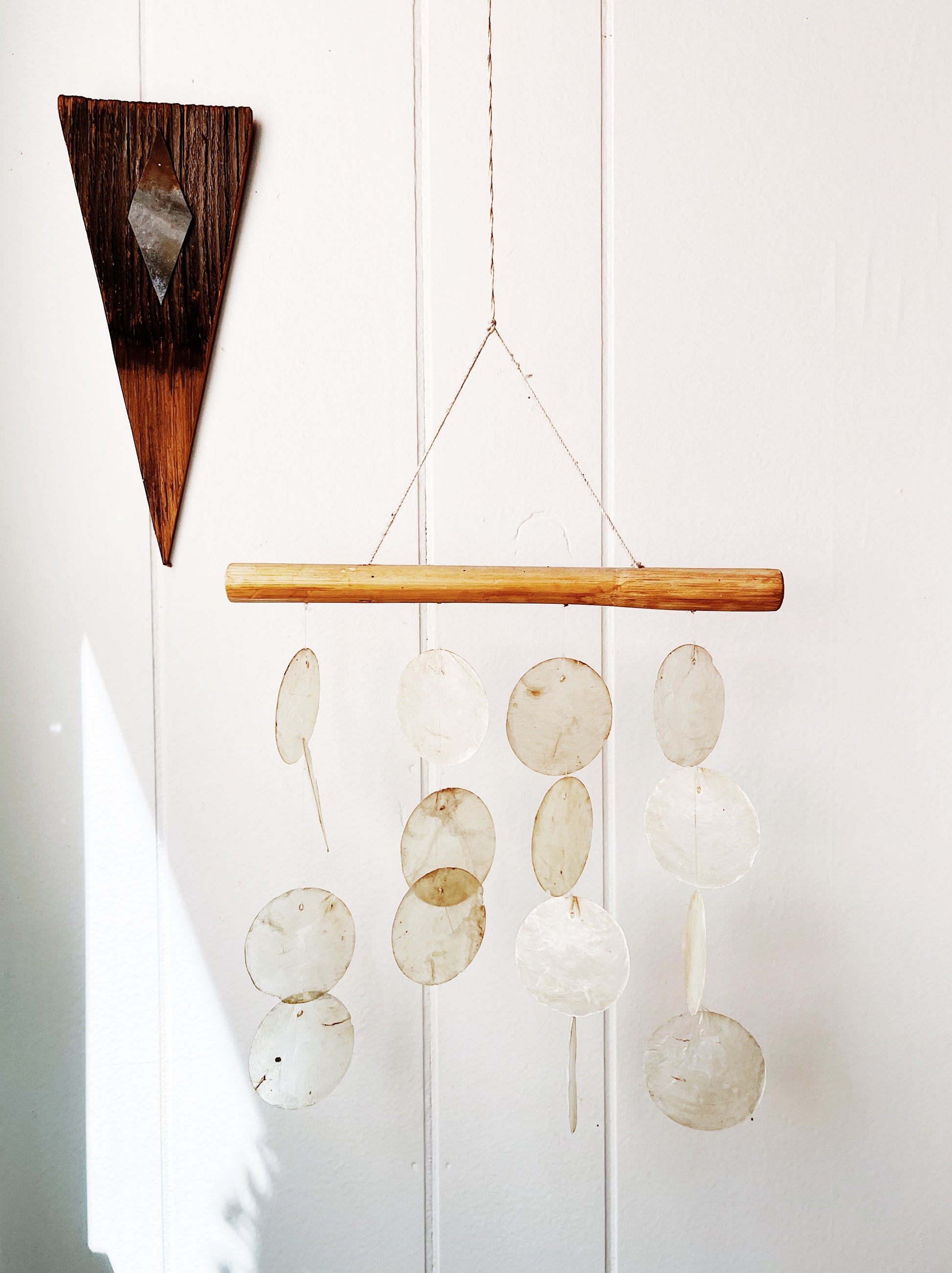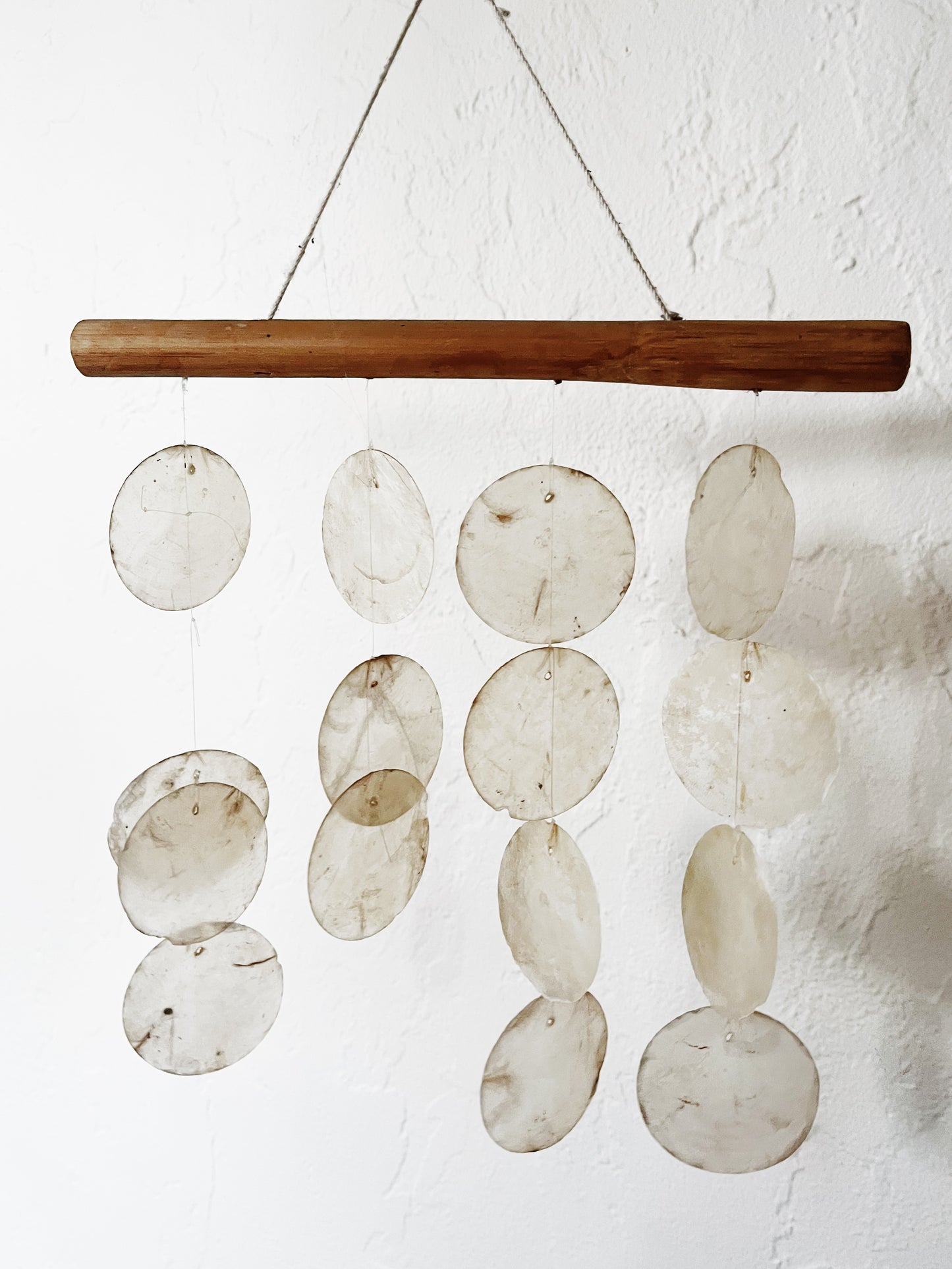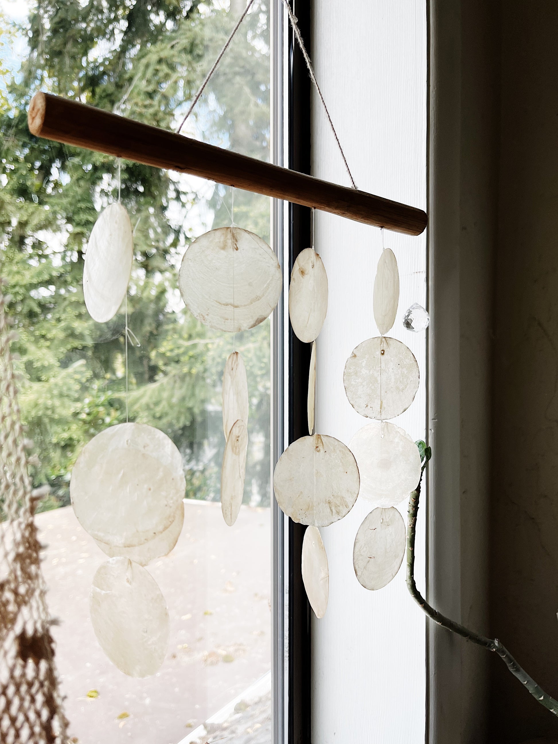 The delicate sounds of a Capiz shell chime wafting through the summer breeze. Yep, it’s really that romantic. Hangs from a wood dowel