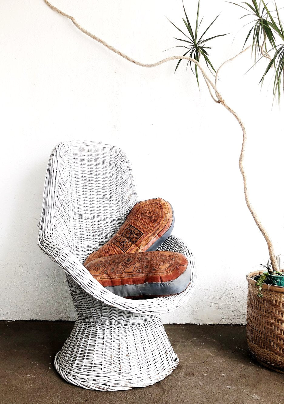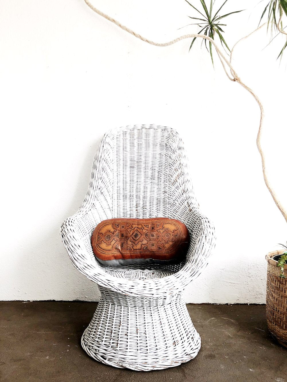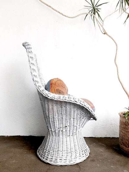 Nice sculptural woven chair painted white. Low seated and comfortable. Has a nice profile too. Condition is very good with some surface wear and a gentle creak when sitting