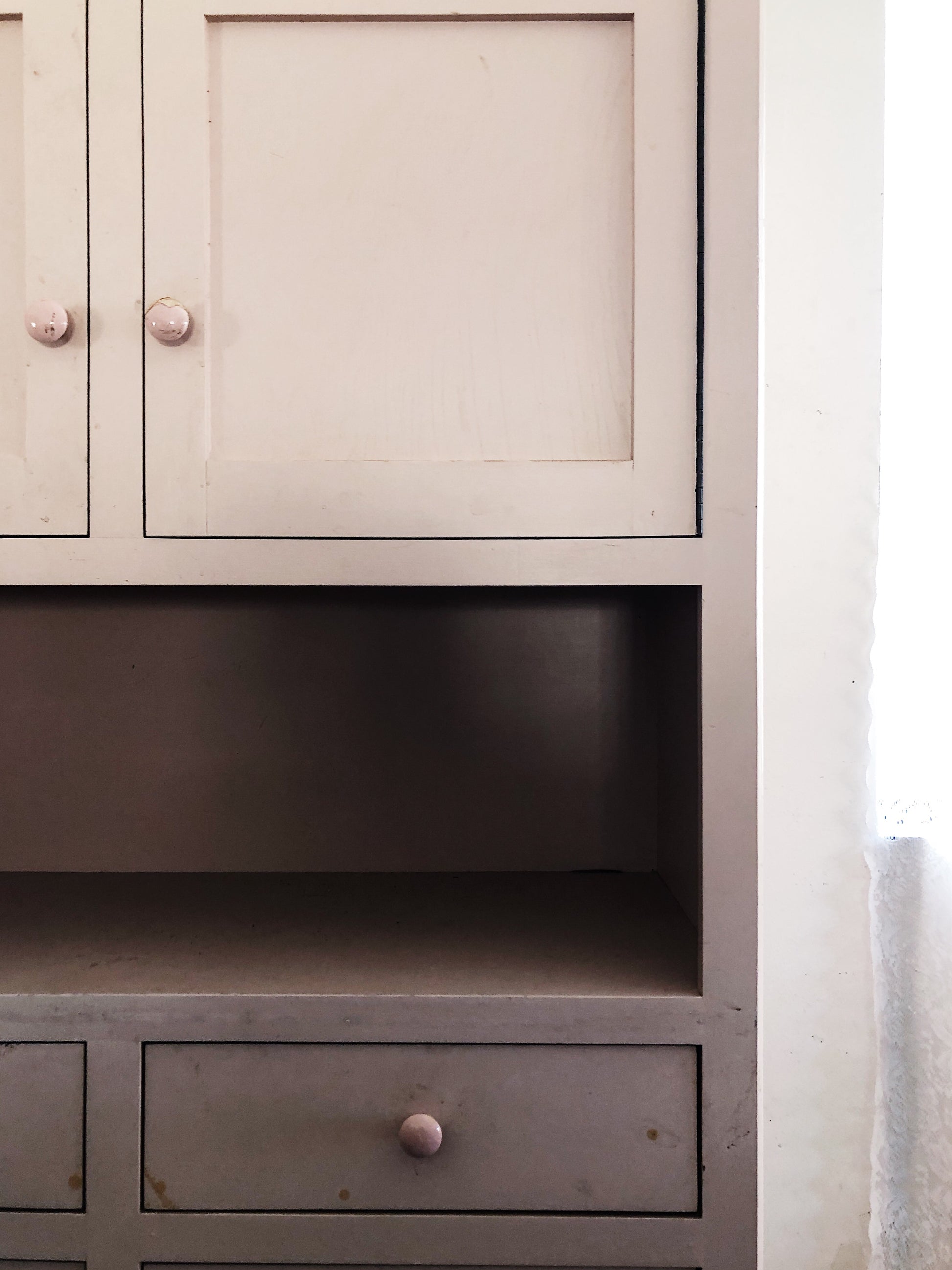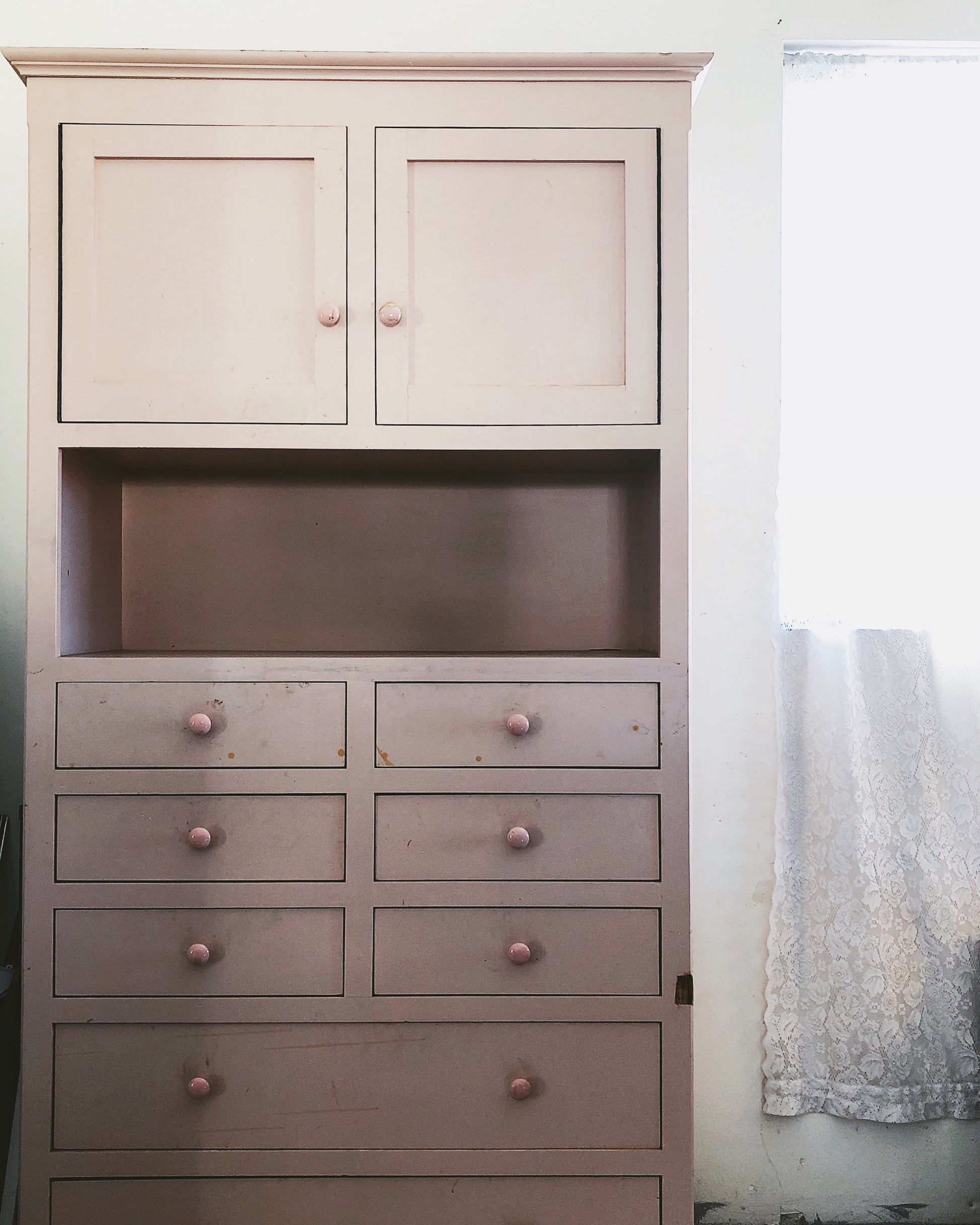 Vintage cabinet. Custom built from alder wood with a blush paint. Soft easy roll drawers. This beauty is large and heavy and available for local pickup