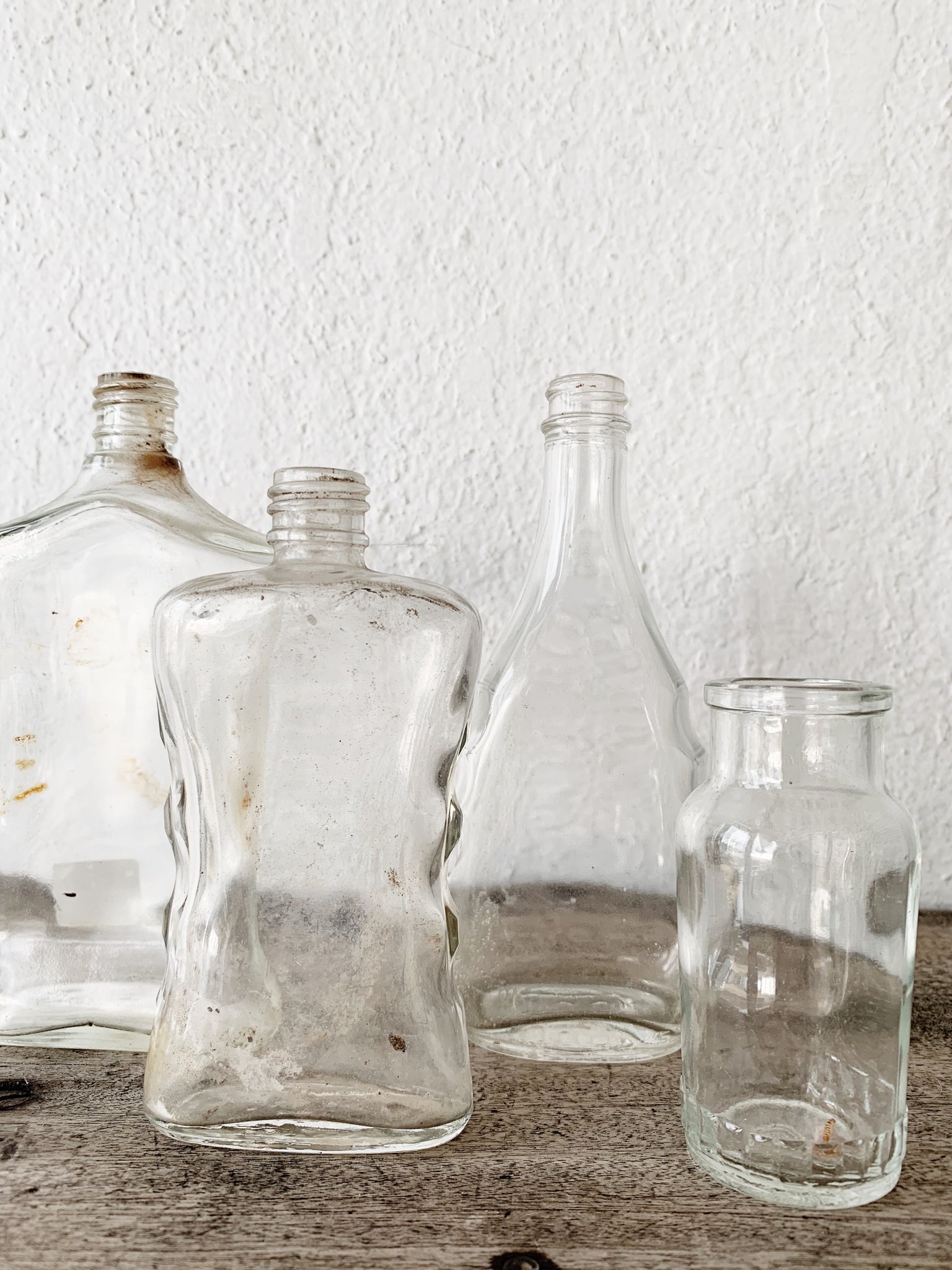 collection of four vintage clear glass bottles and one amber. We love these for little blooms