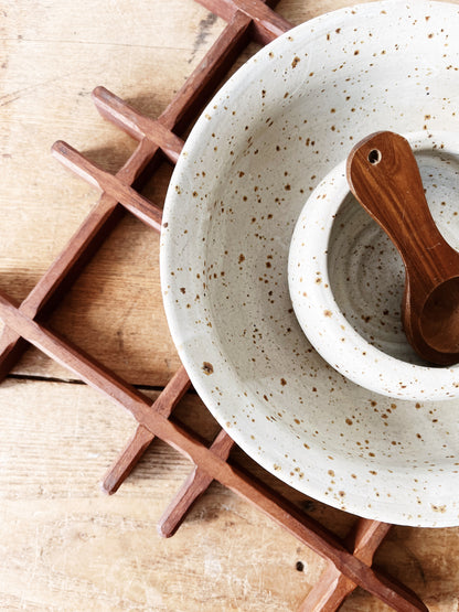 Extra large size on this teak trivet by the iconic Jens Quistgaard. Really beautifully made, and sets of a set of dishes or enamel pot so well. A collectors piece for the kitchen