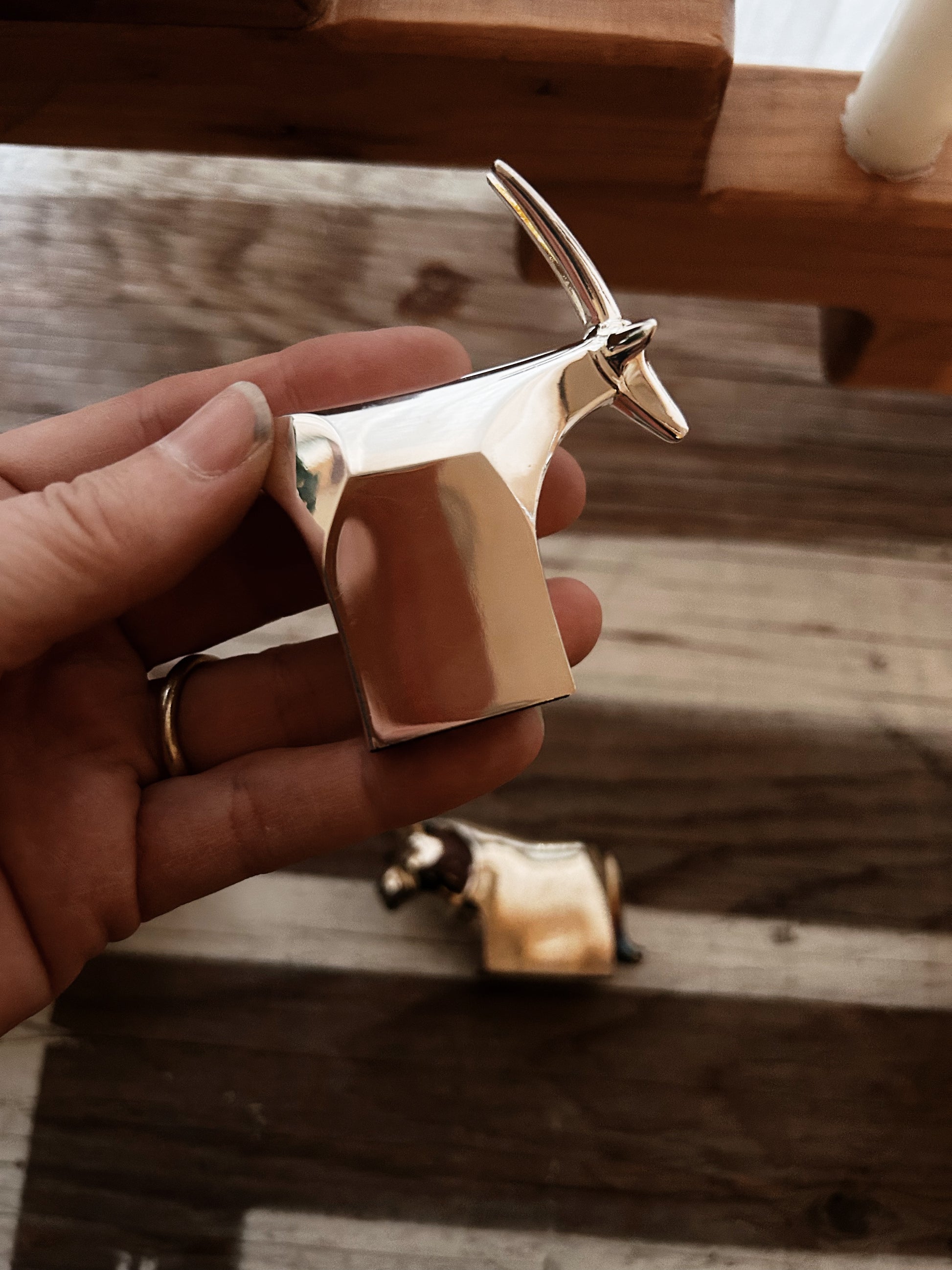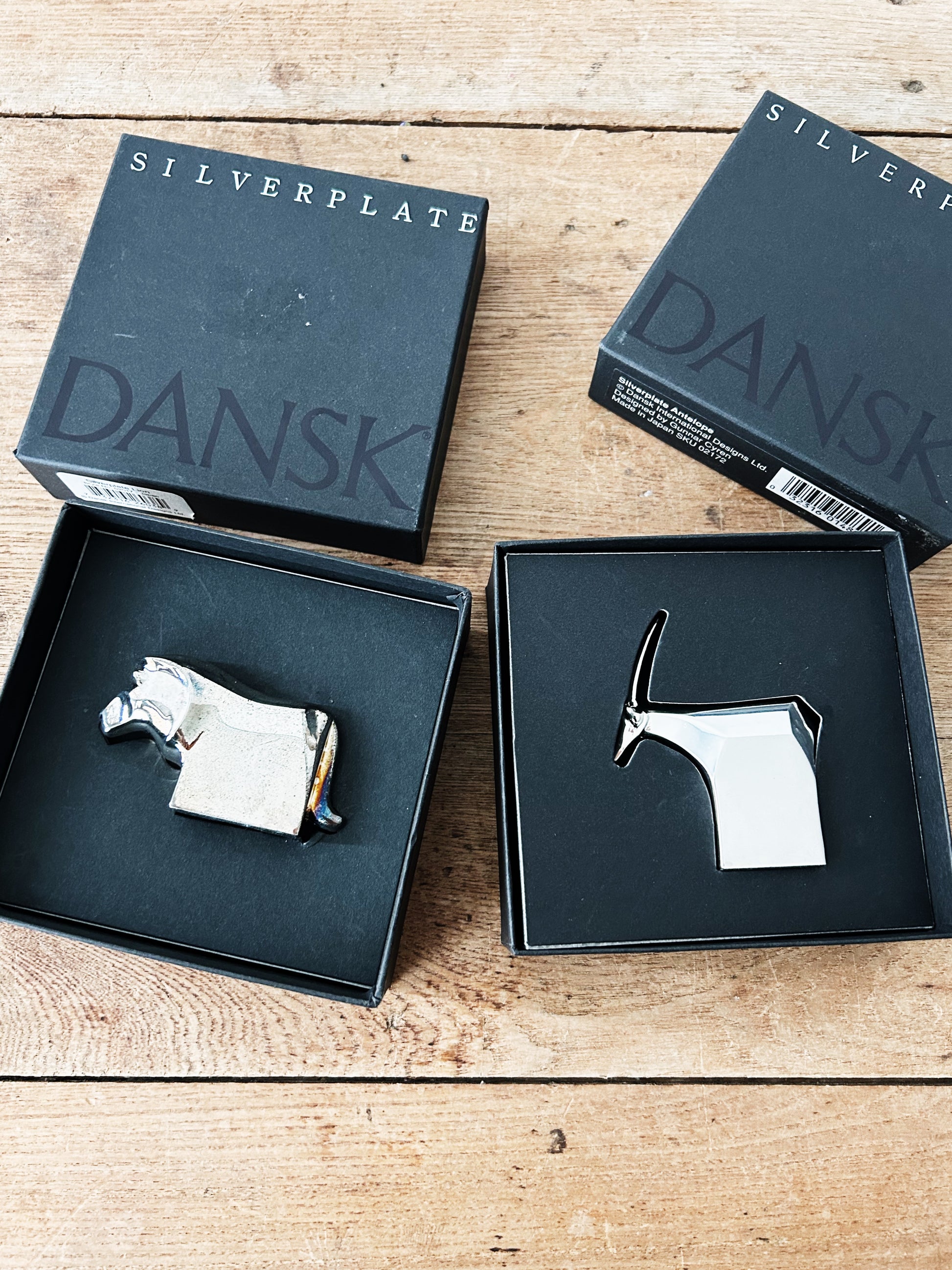 Vintage Dansk by Gunnar Cyren silverplate Lion and Antelope. Weighty, made in Japan. They both come with original box.