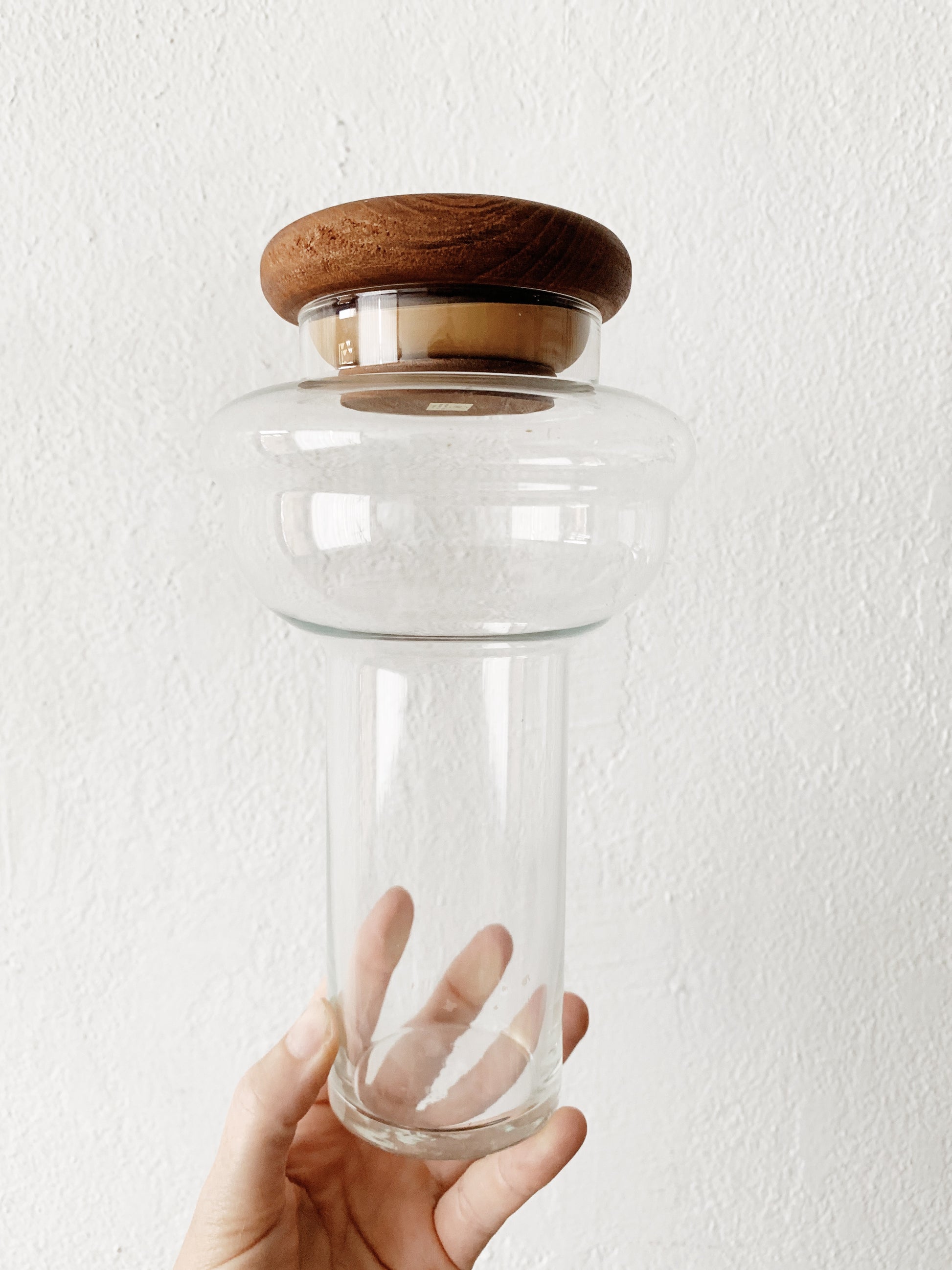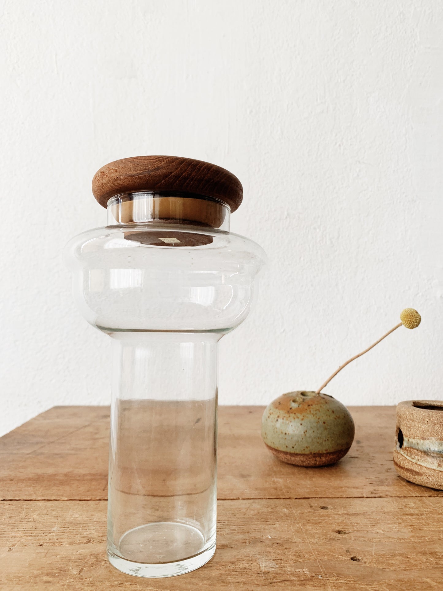 lovely shape to this glass decanter. Comes with the wood suction lid