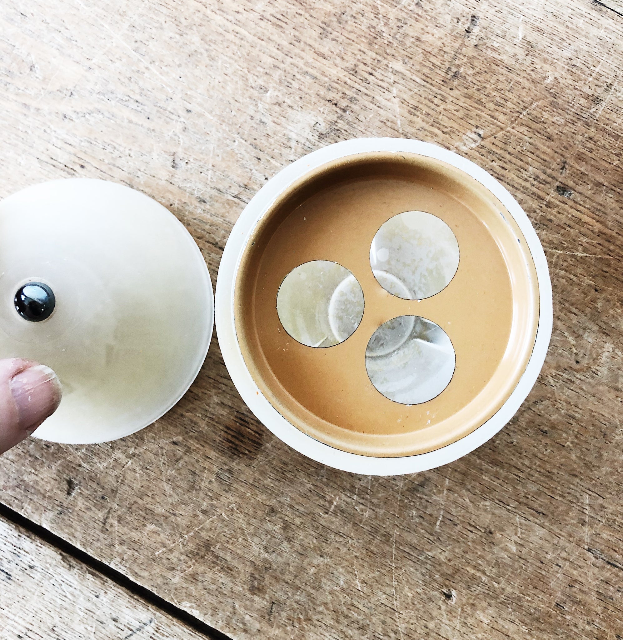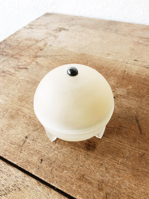 What a sweet little thing. Footed etched glass orb with lid. Contains a removable insert which (we think) might’ve been used to hold perfumes. Charming and beautiful for jewels