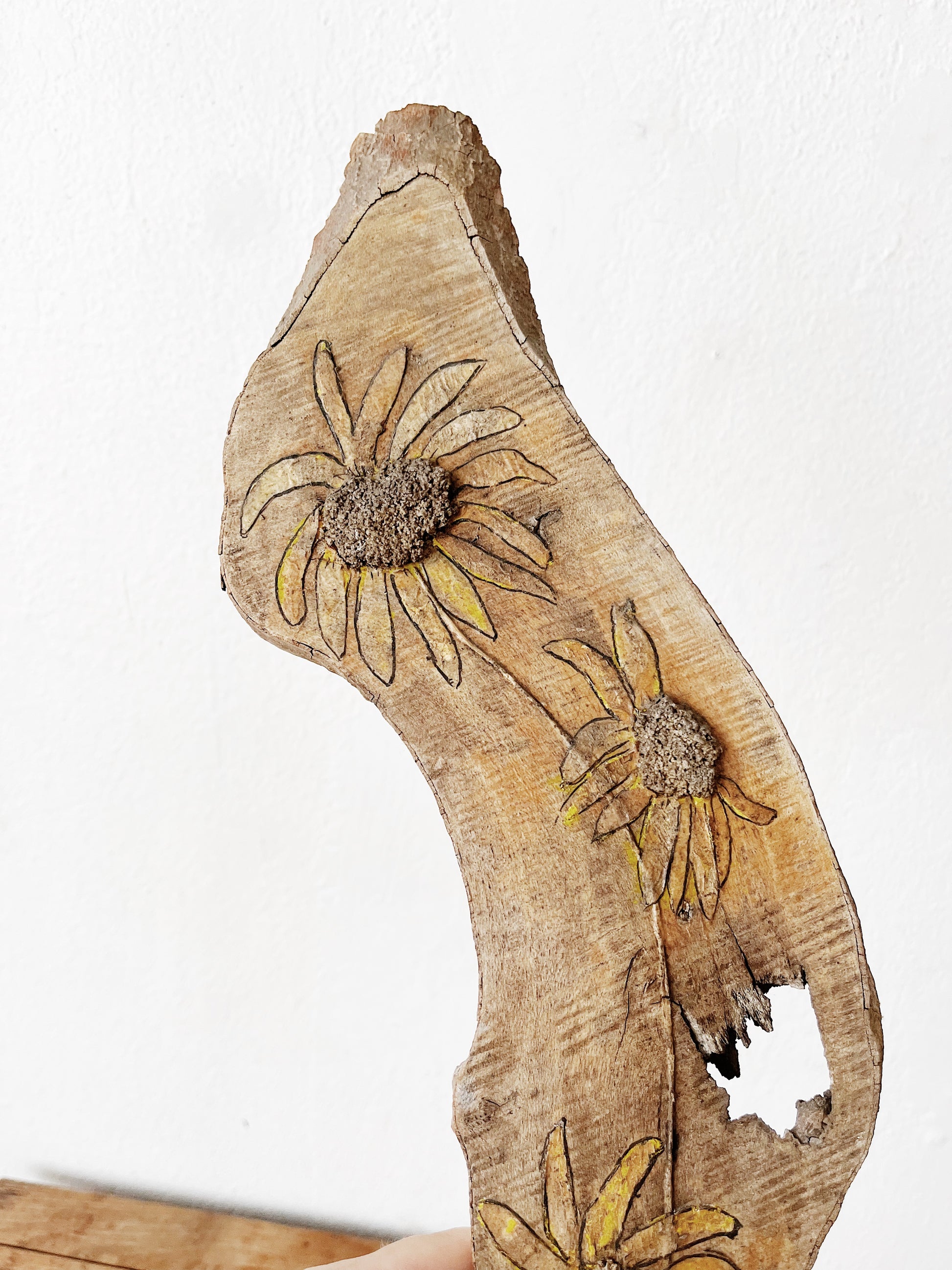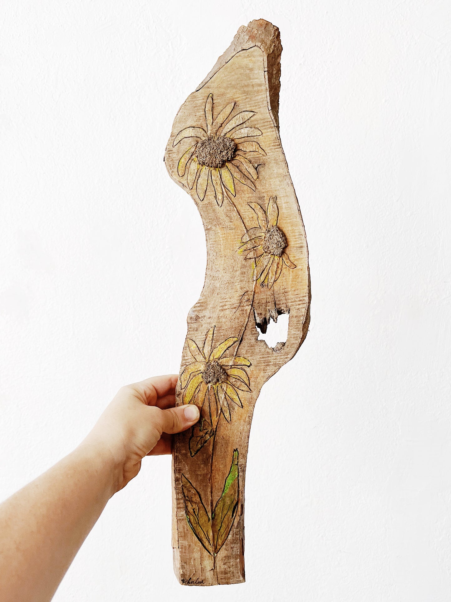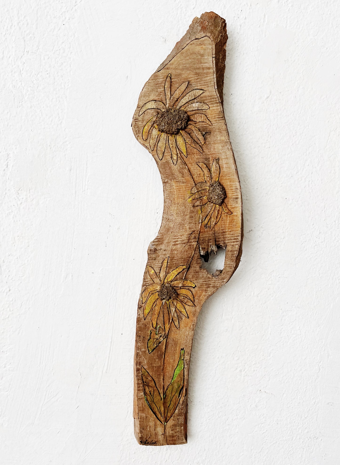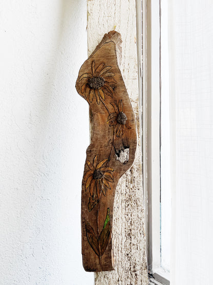 Pretty faded out driftwood with wood burned and painted sunflowers. An earthy whimsical art piece. Hanger on reverse
