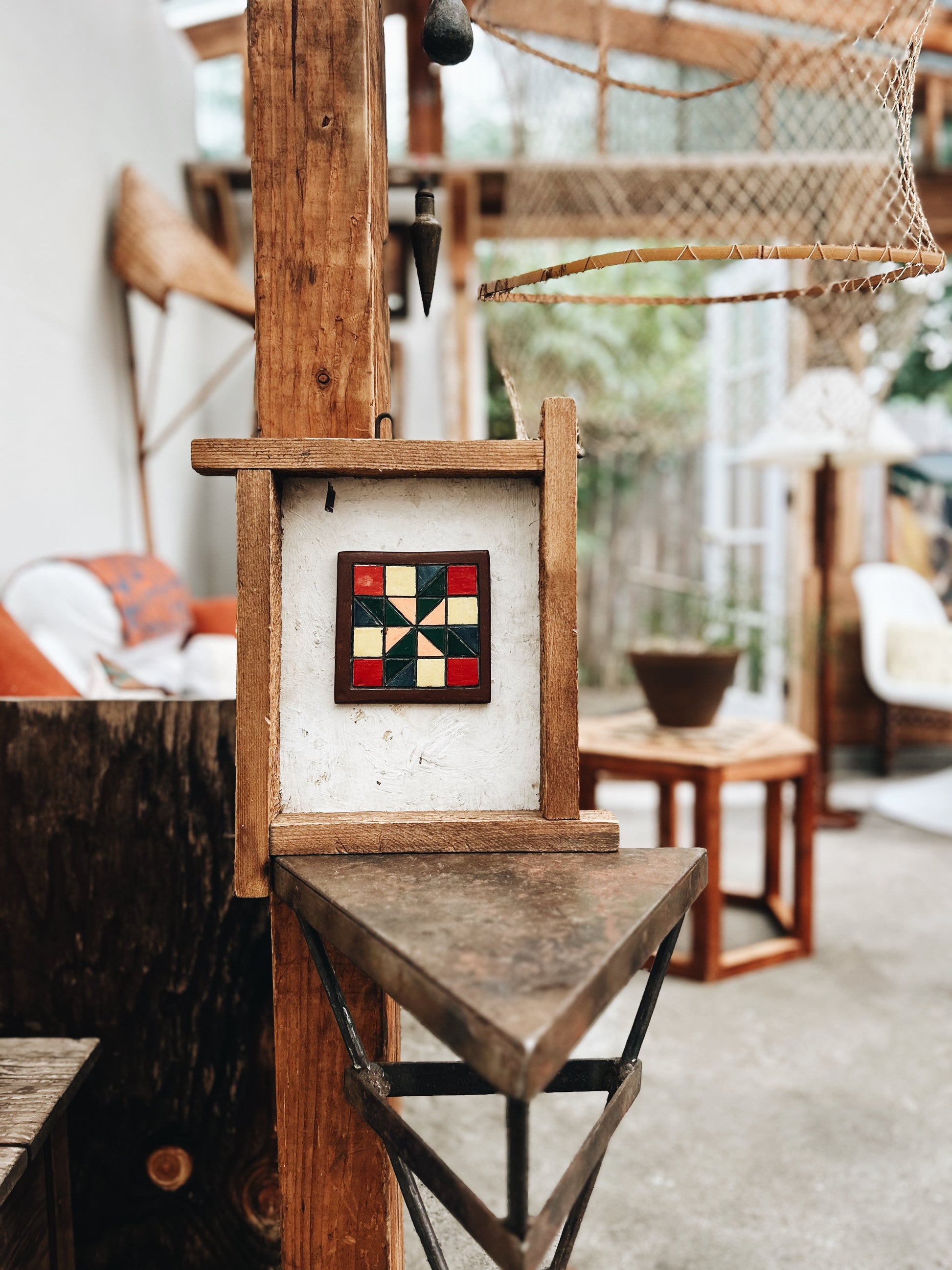 Hand painted clay tile mounted on gessoed board. Framed in the most wonderful primitive folk art wood.