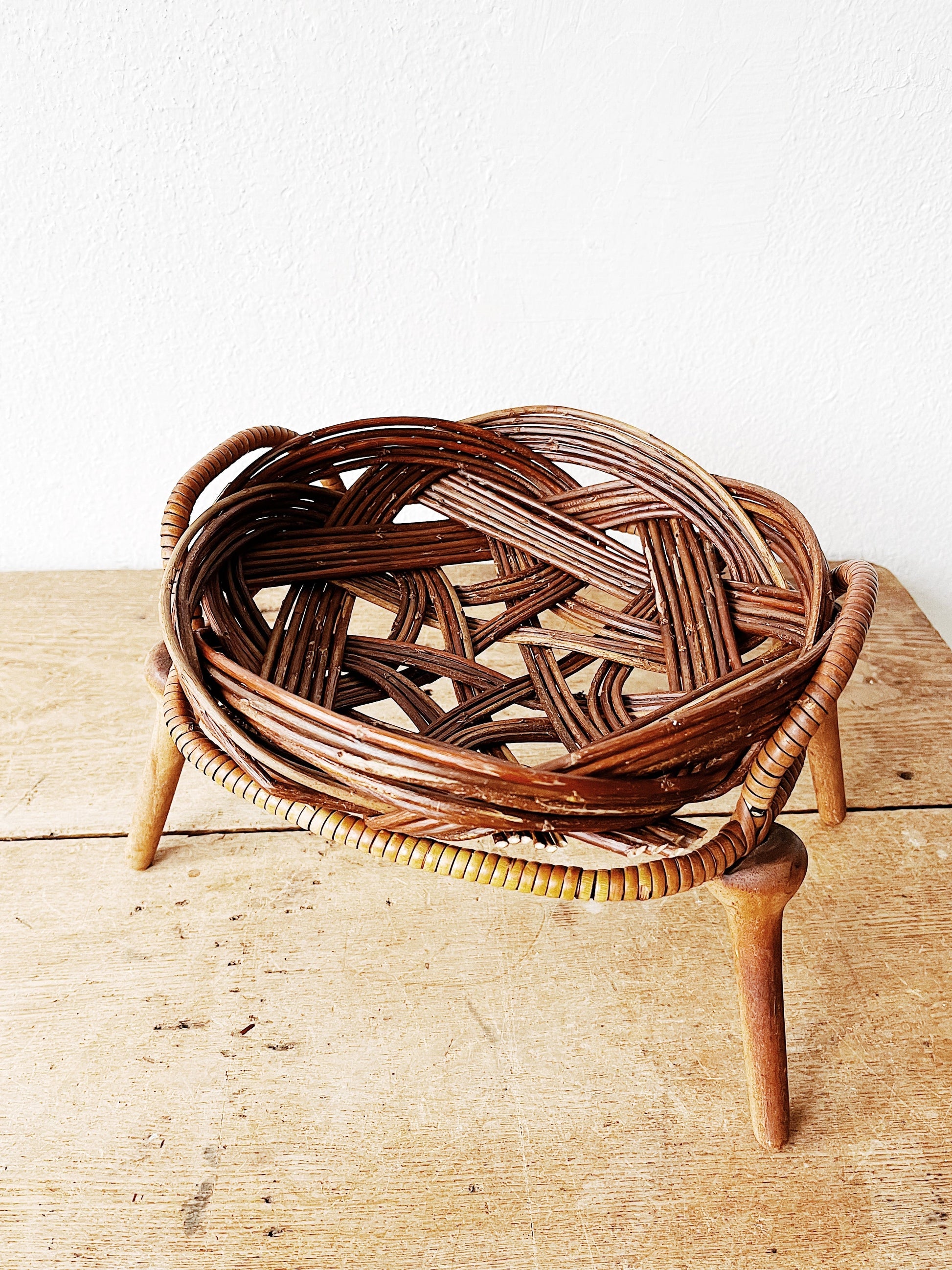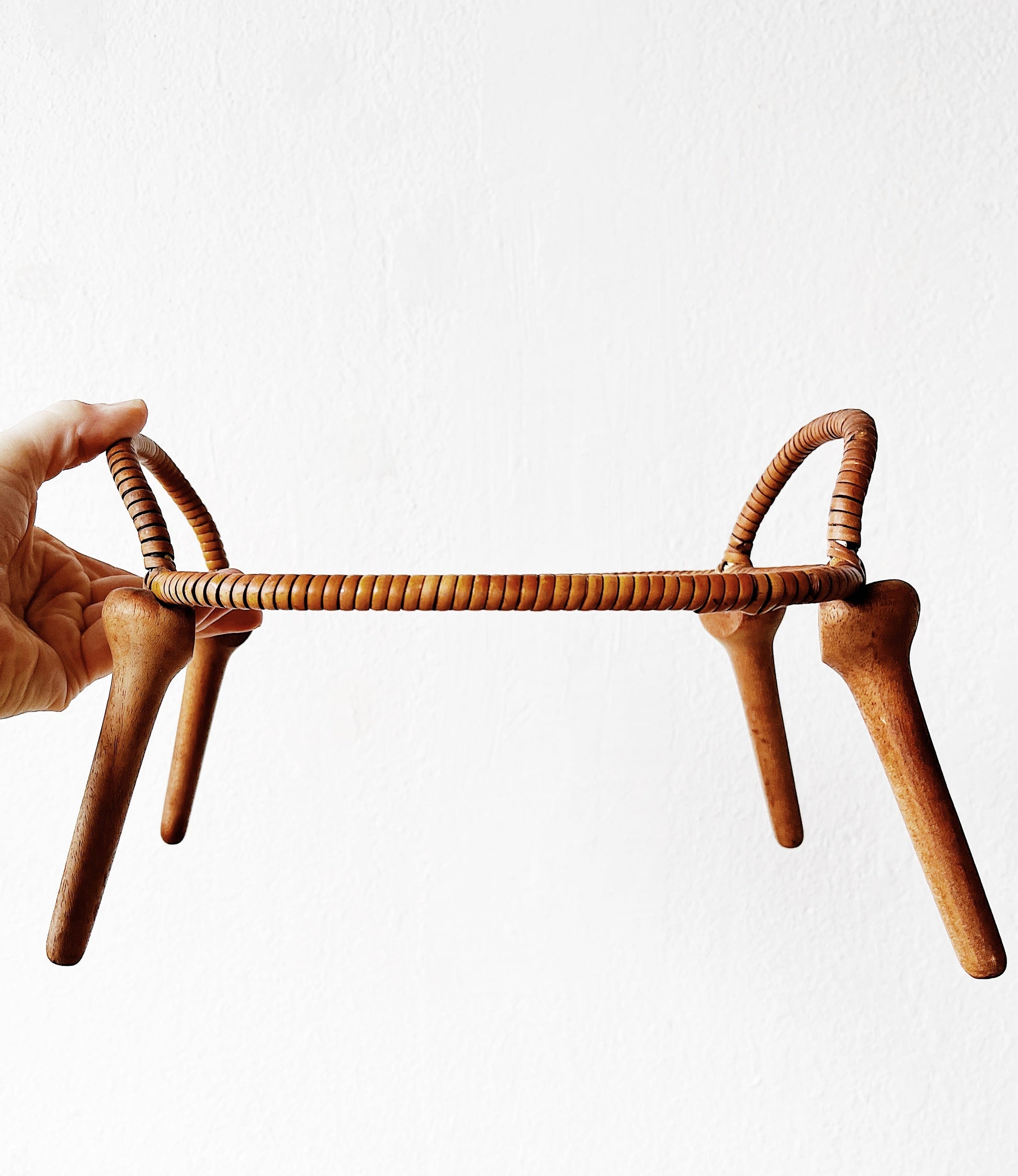 Designed by Jens Harald Quistgaard (IHQ) in 1954 before his collaboration with DANSK international, The serving stand has ant shaped teak legs and is made of iron wrapped with bamboo. Weighty. Last photo shows it’s original use