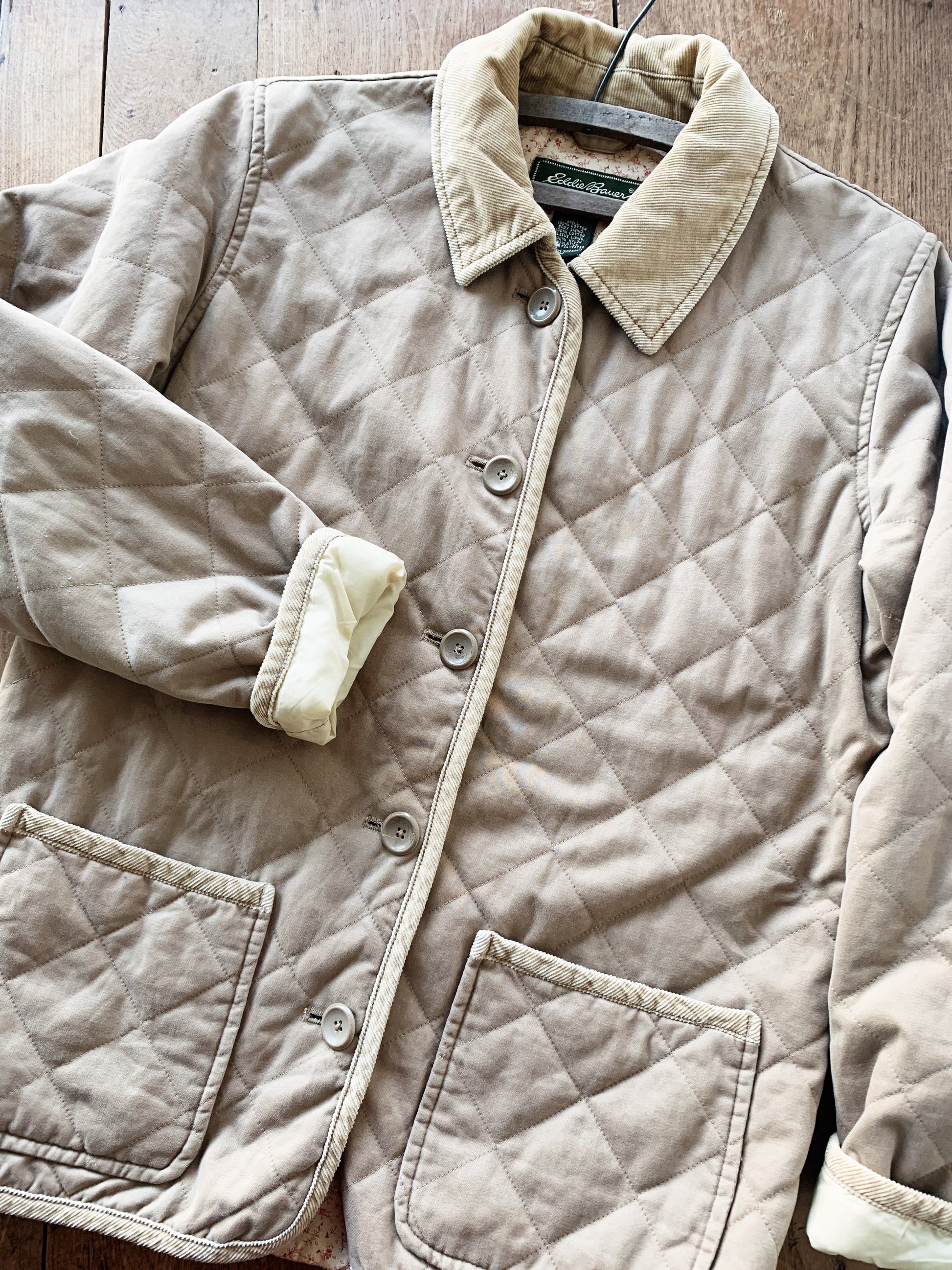 New condition Eddie Bauer Cotton barn jacket with corduroy collar and trim details. Lined in floral cotton. Great pockets too!