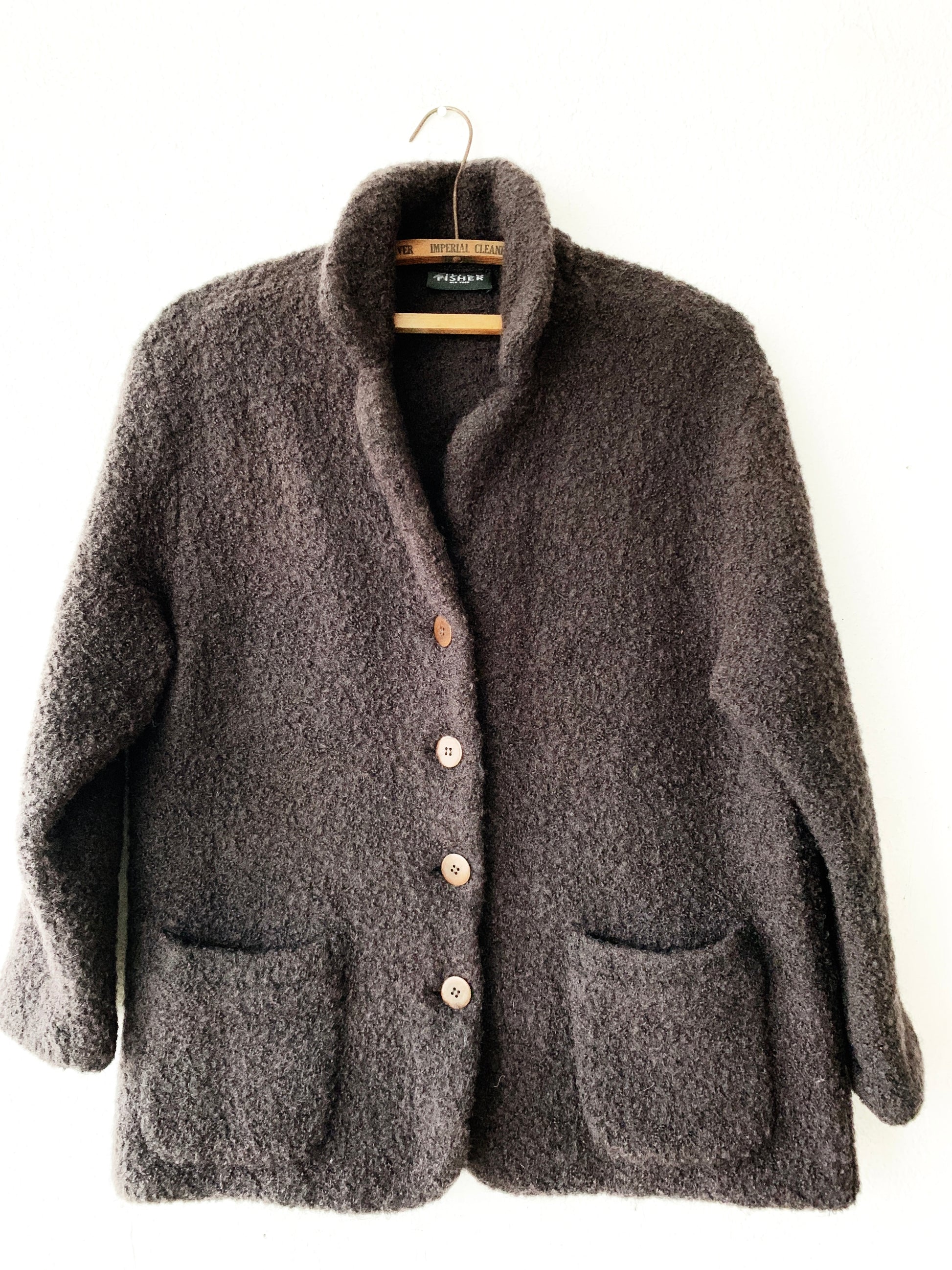 Super cozy and beautifully made Eileen Fisher wool blazer coat in chocolate brown. Patch pockets. Tagged a large, fit is M//L. Excellent condition.