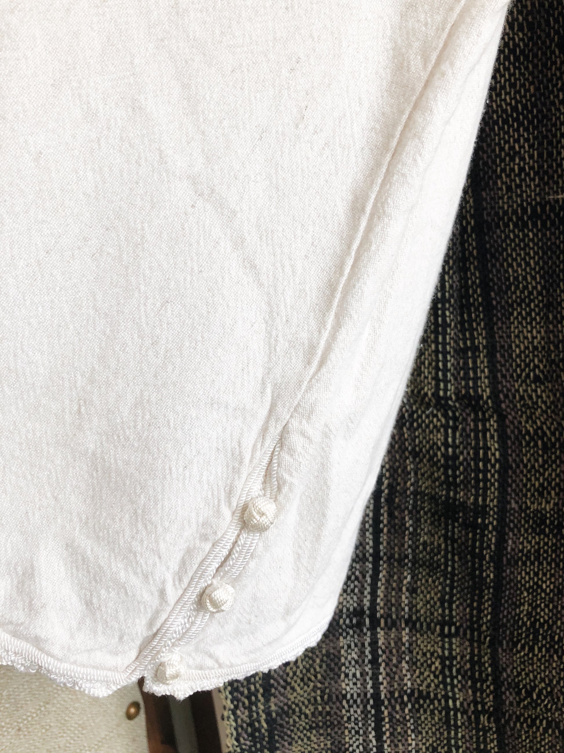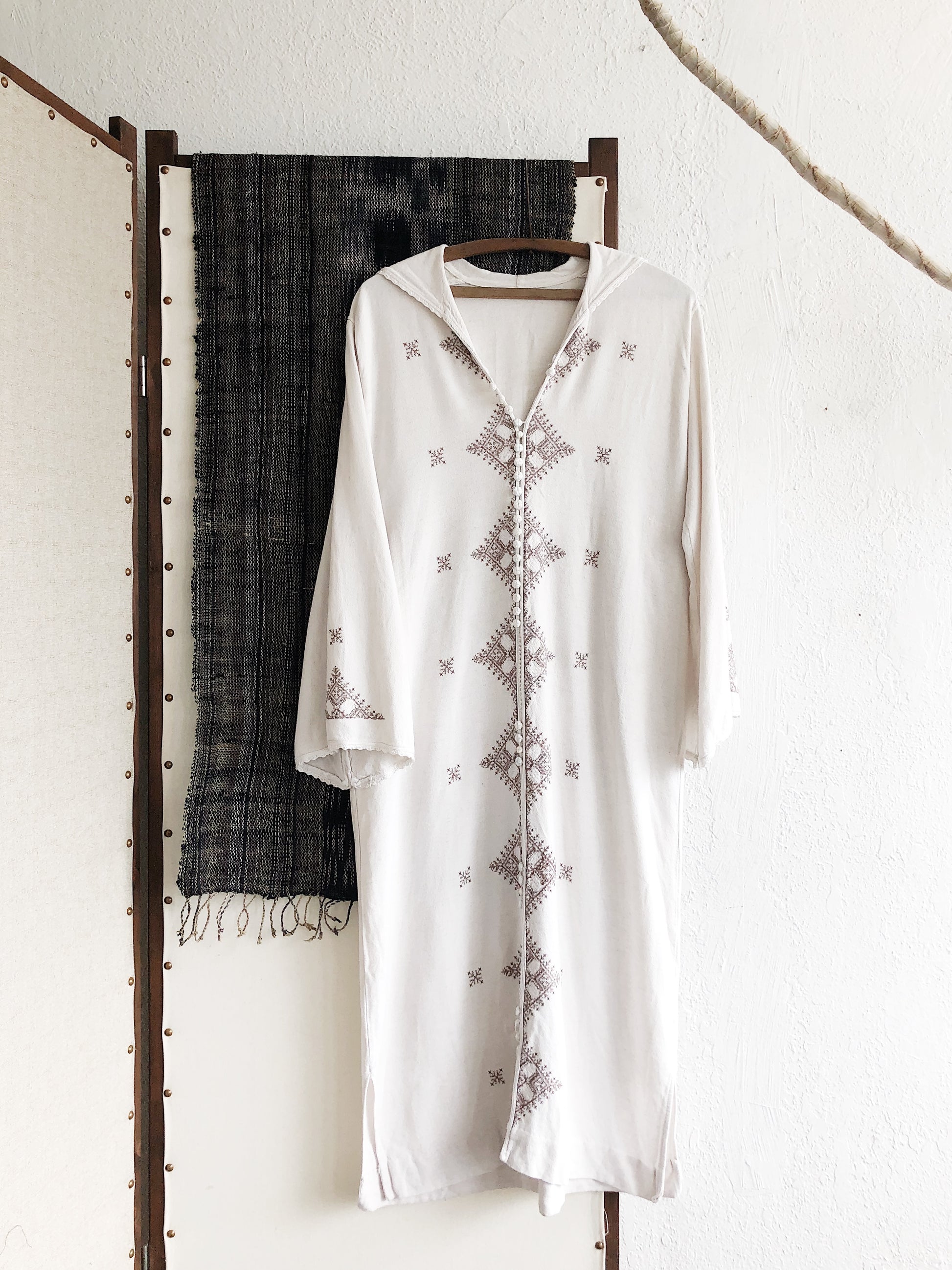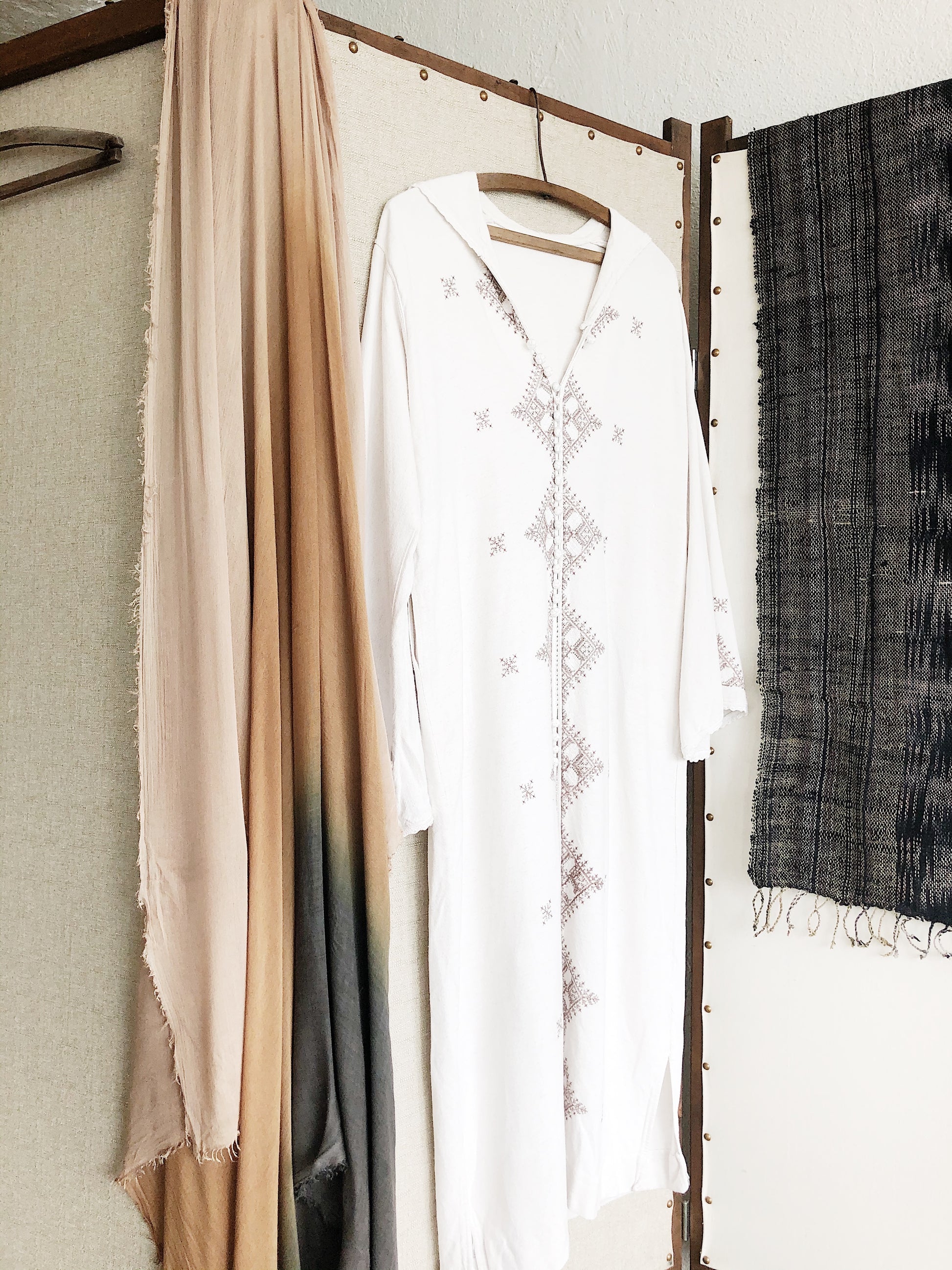 Such a great piece for lounging, poolside or otherwise. Soft natural and man made fibers...drapey rayon cotton mix we believe. Pointed sleeves and knotted buttons. Hood and Pockets!