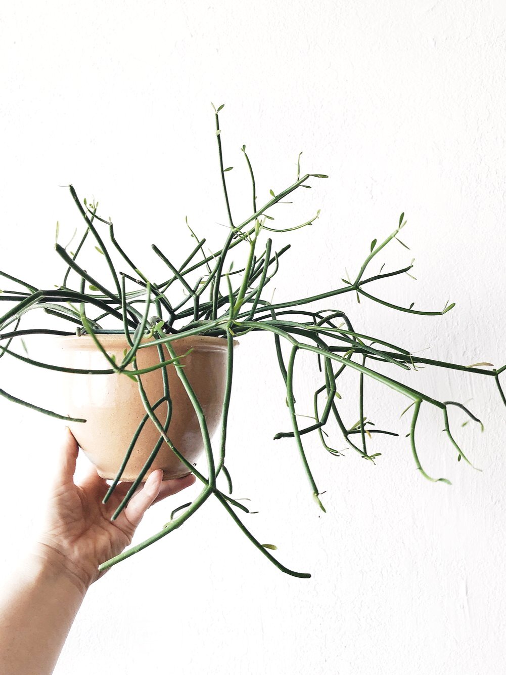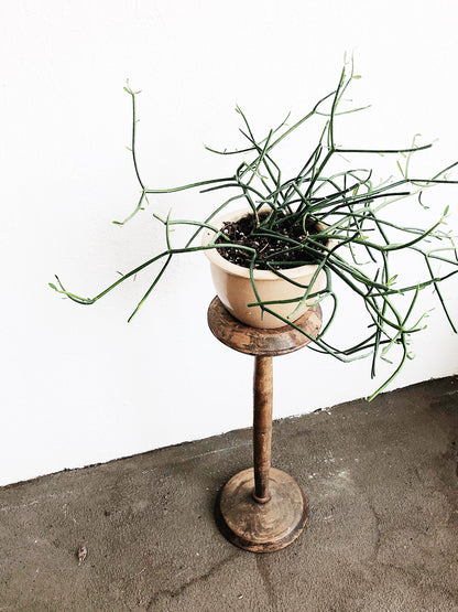 A sprawling pencil cactus potted in vintage peach stoneware. A spare and sculptural plant. Pot has drainage