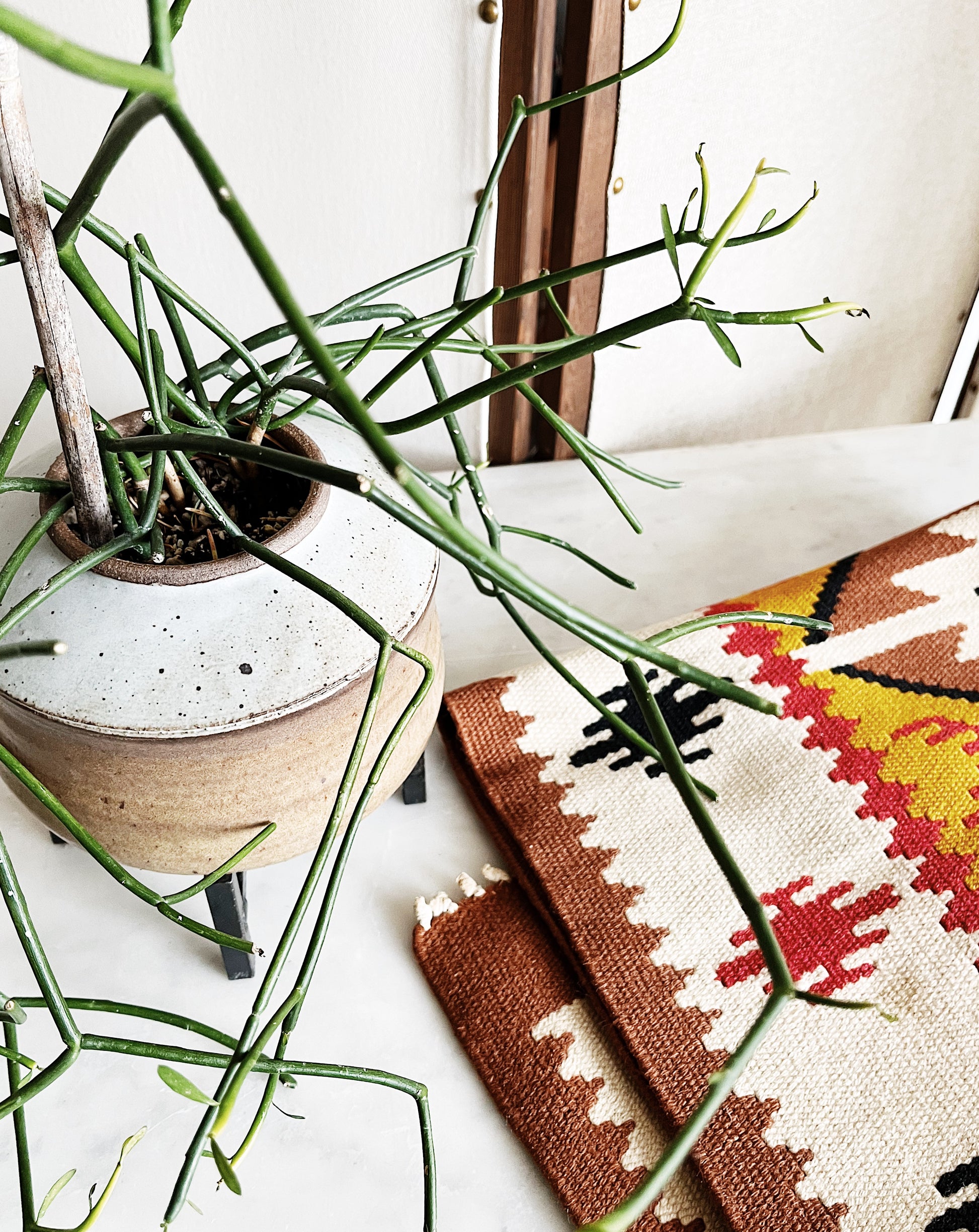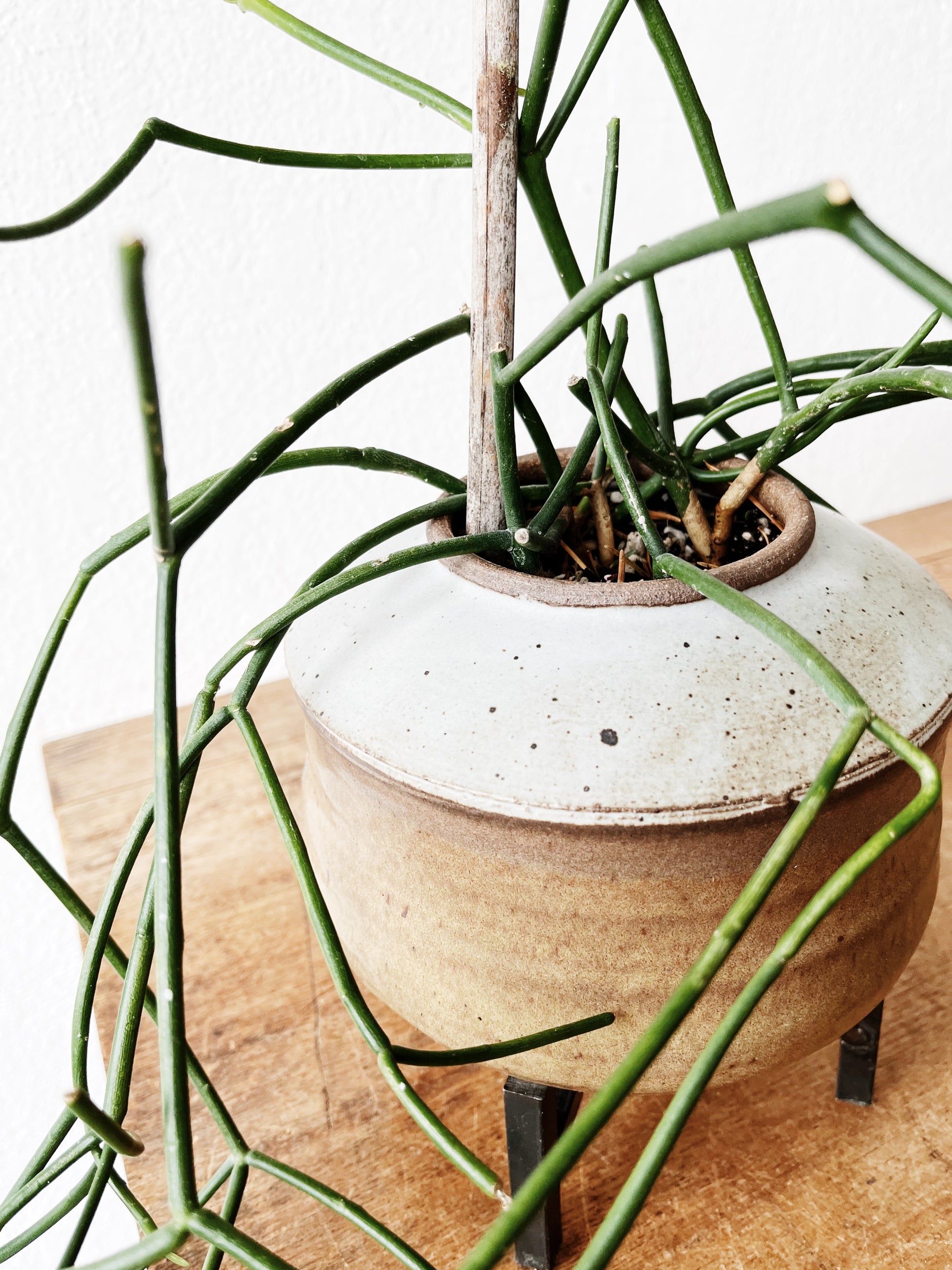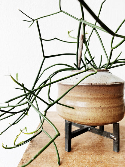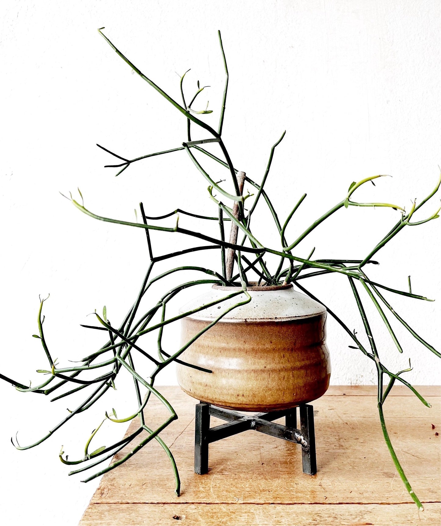 A crazy E. Tirucalli that’s growing wonderfully and thriving! Comes in this pretty stoneware vessel with metal stand