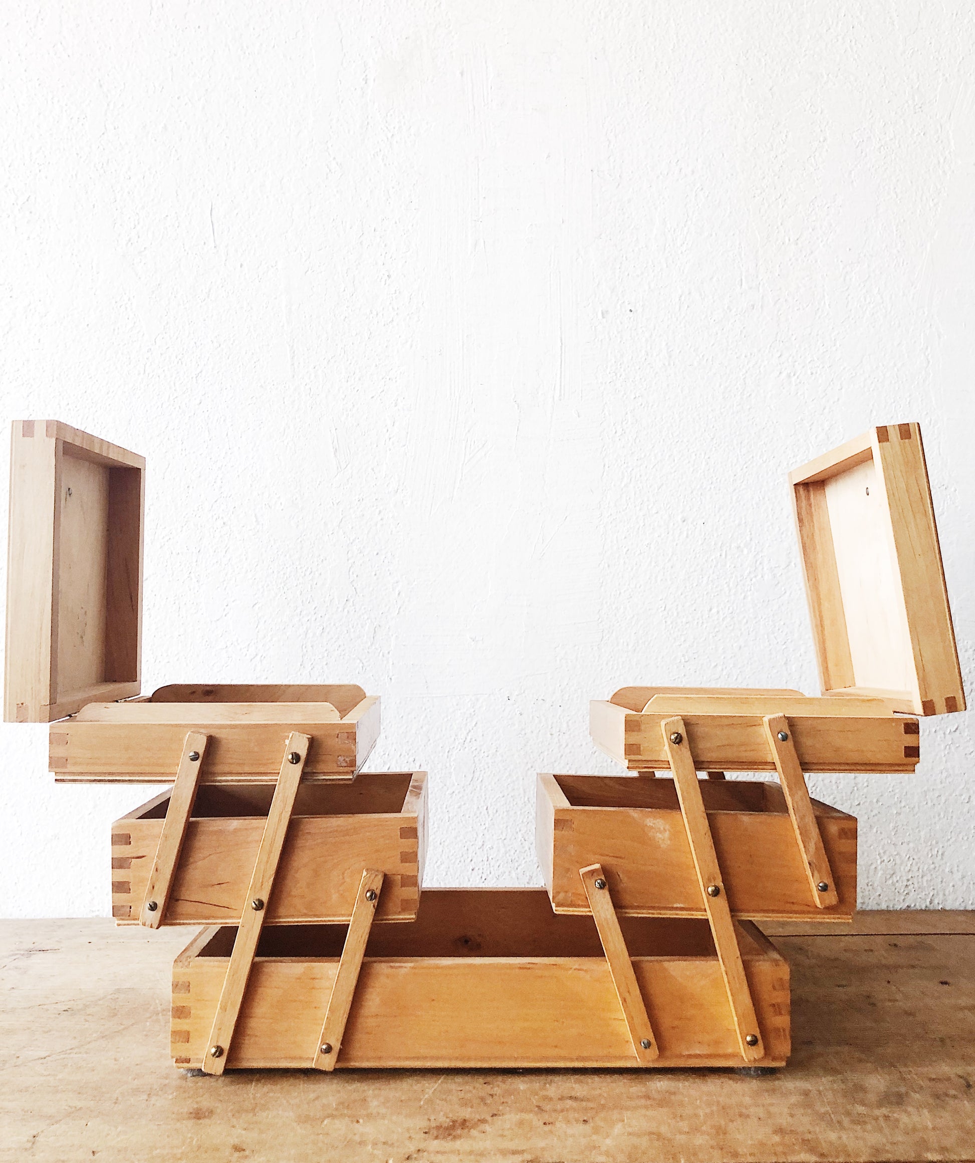 Natural wood and holds everything from craft and kitchen supplies to jewelry