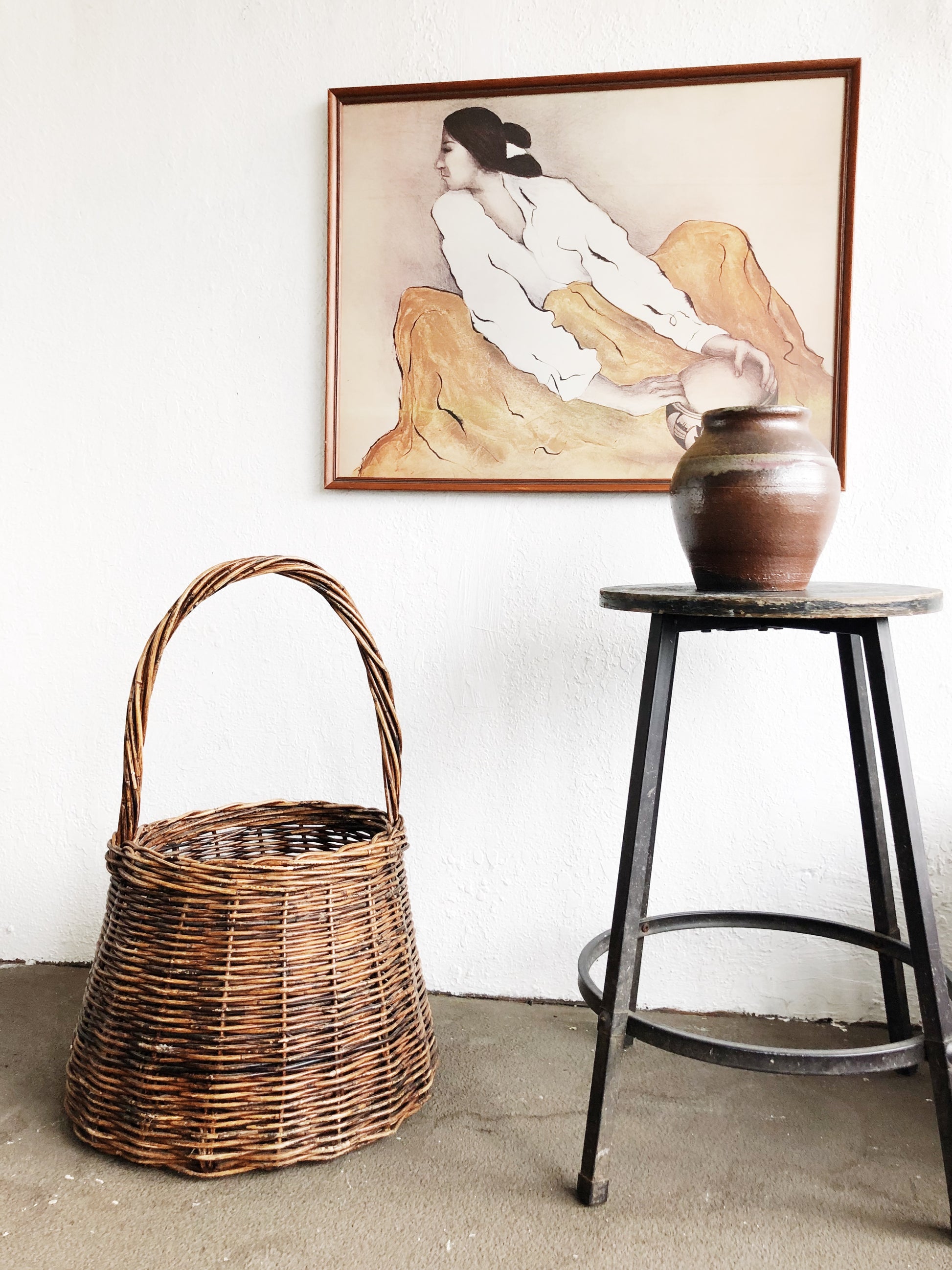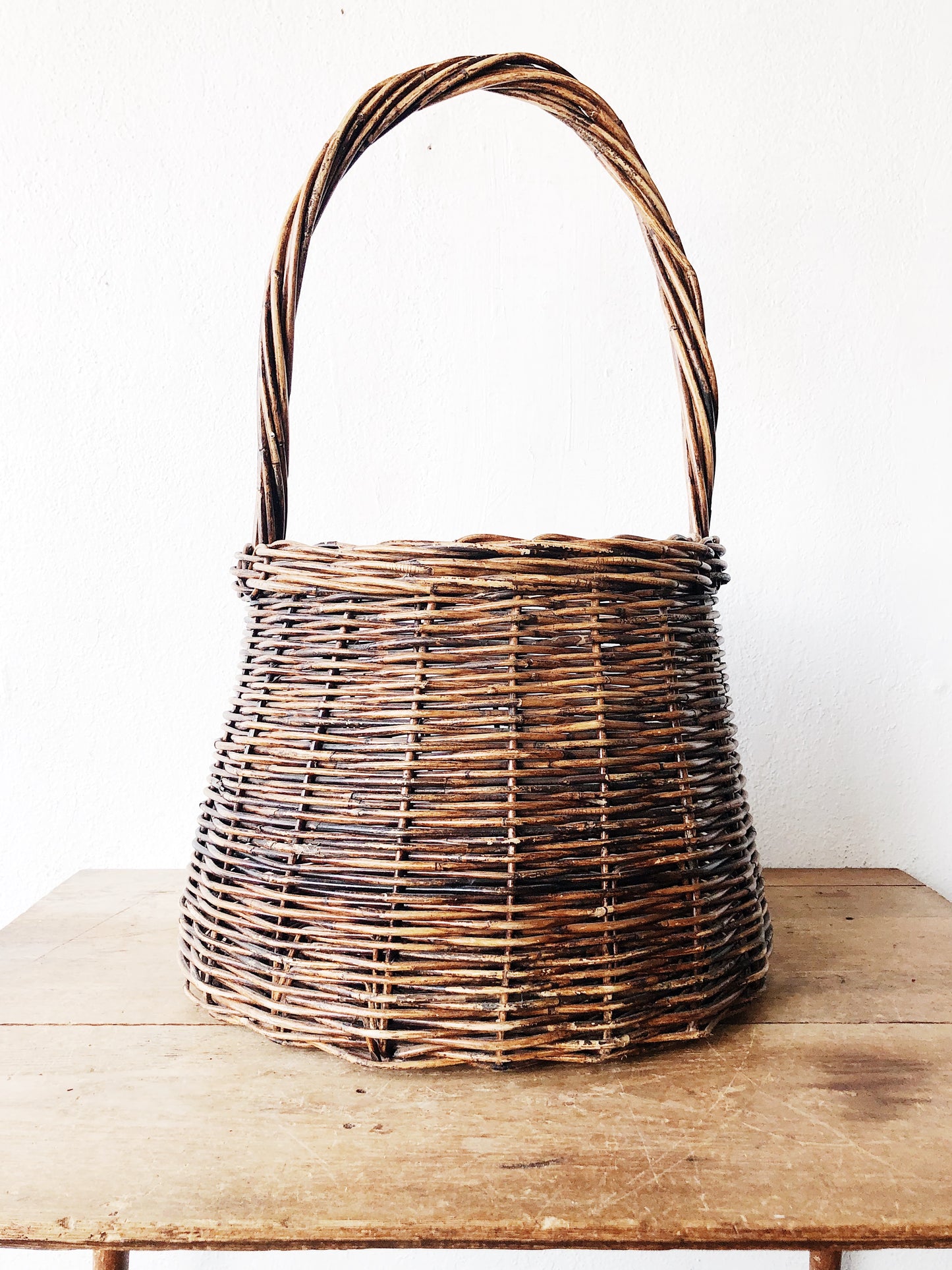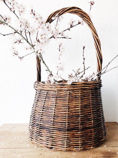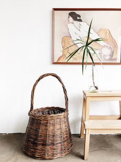 Nice tall handled grapevine basket. Large enough to hold kindling for a fire or large flowering branches. Sturdily woven