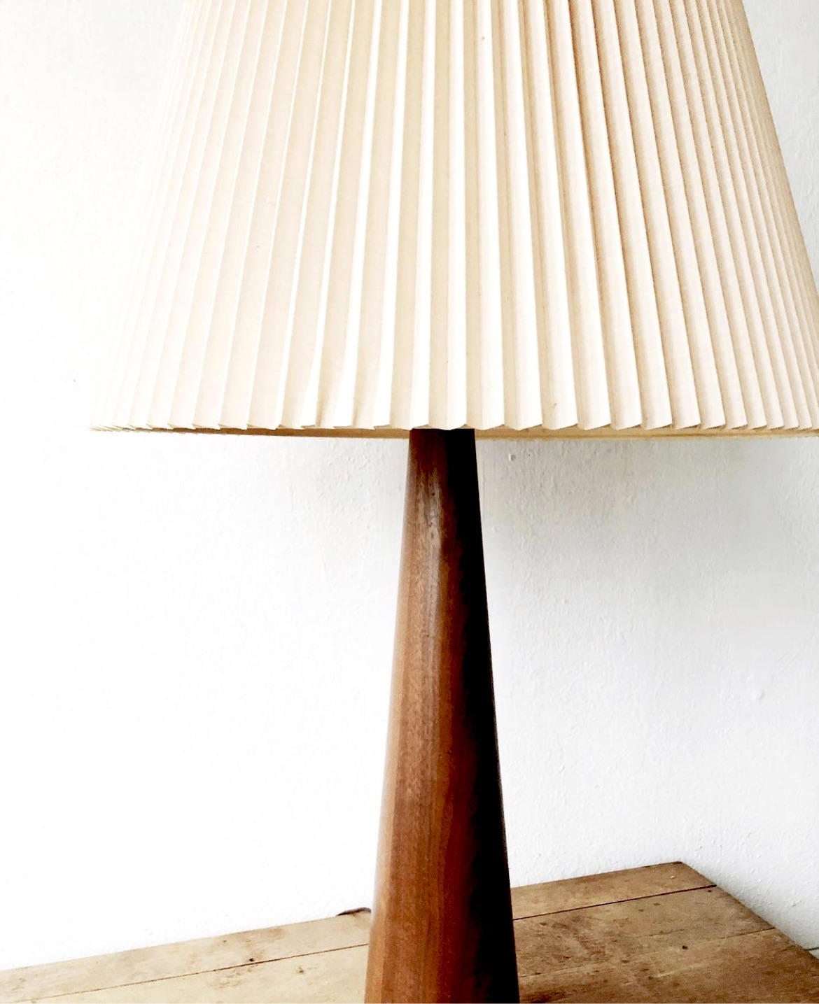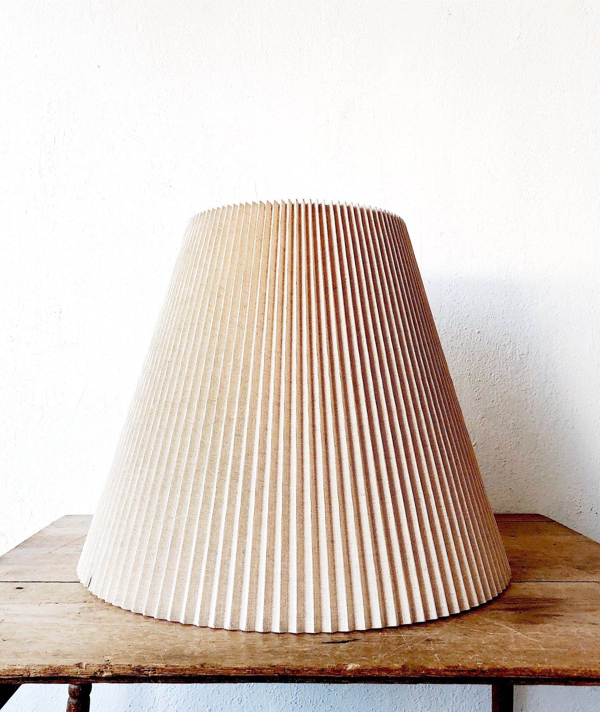 Beautiful ecru pleated linen shade in a large size. These are lovely on table or floor lamps but also hanging as a pendant with an easily purchased light kit.