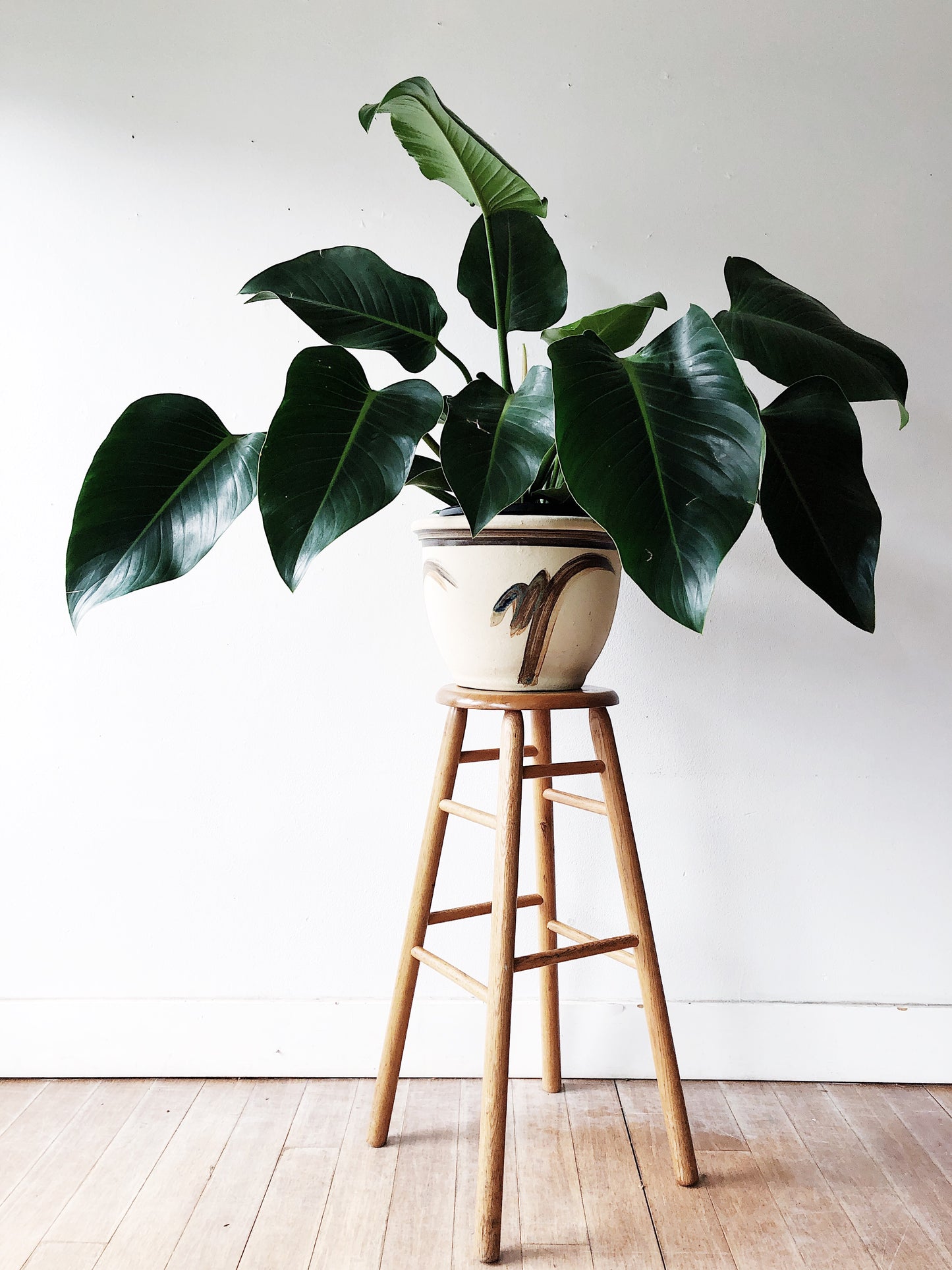 Nice tall vintage wooden stool that we like using as a plant stand for a large specimen. The wood tone on this one is really lovely. Super sturdy