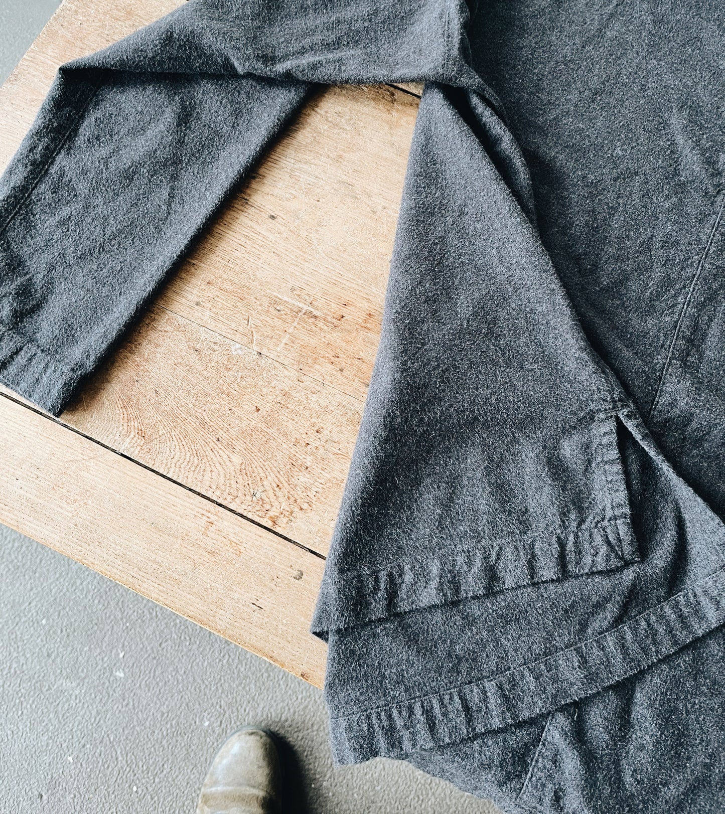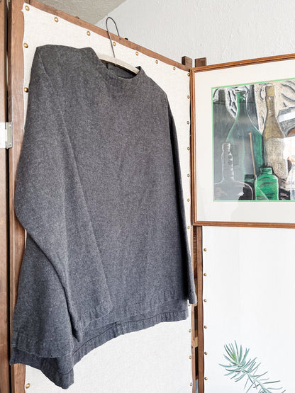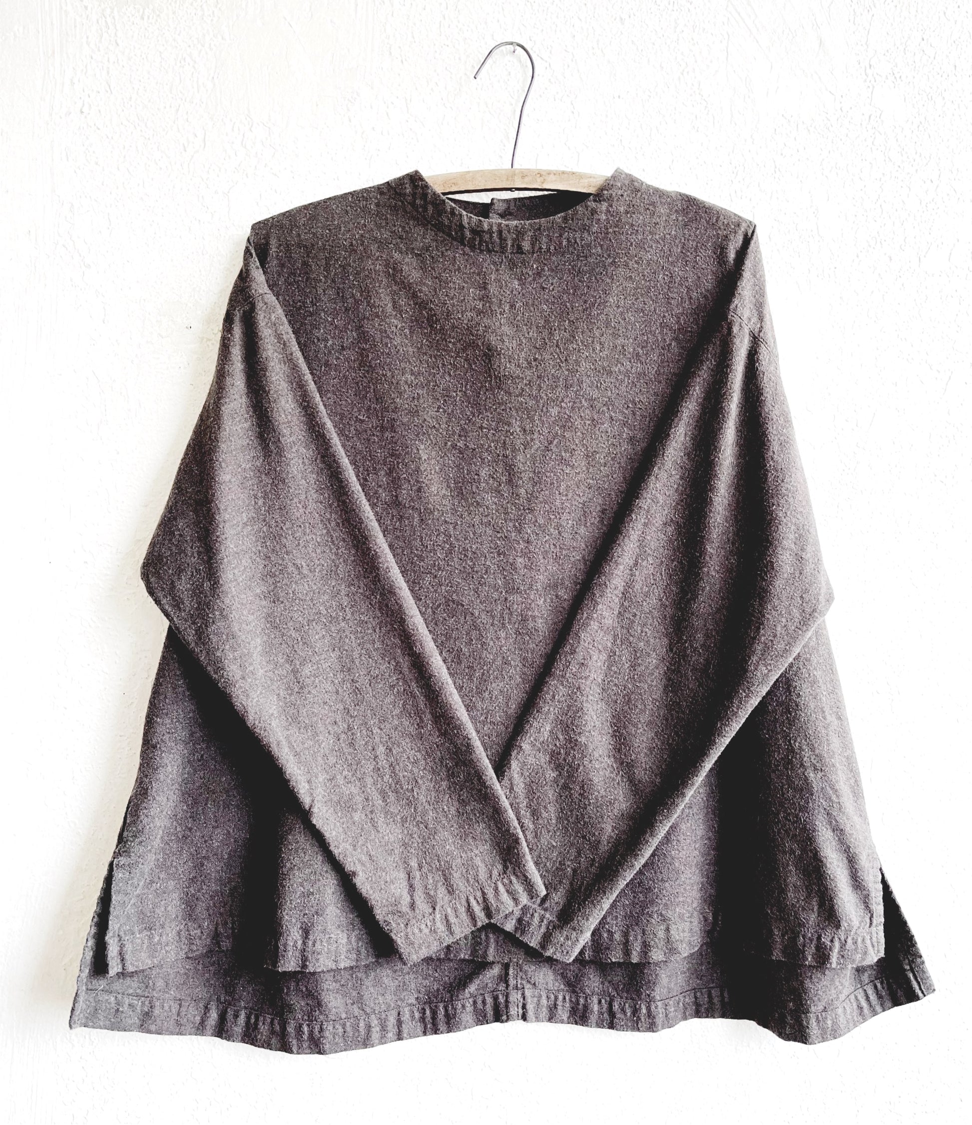 Well made and soft grey cotton flannel in a comfortable shape. Slightly A line with small button back neckline. Overall fit is loose and stylish. Machine sewn possibly handmade