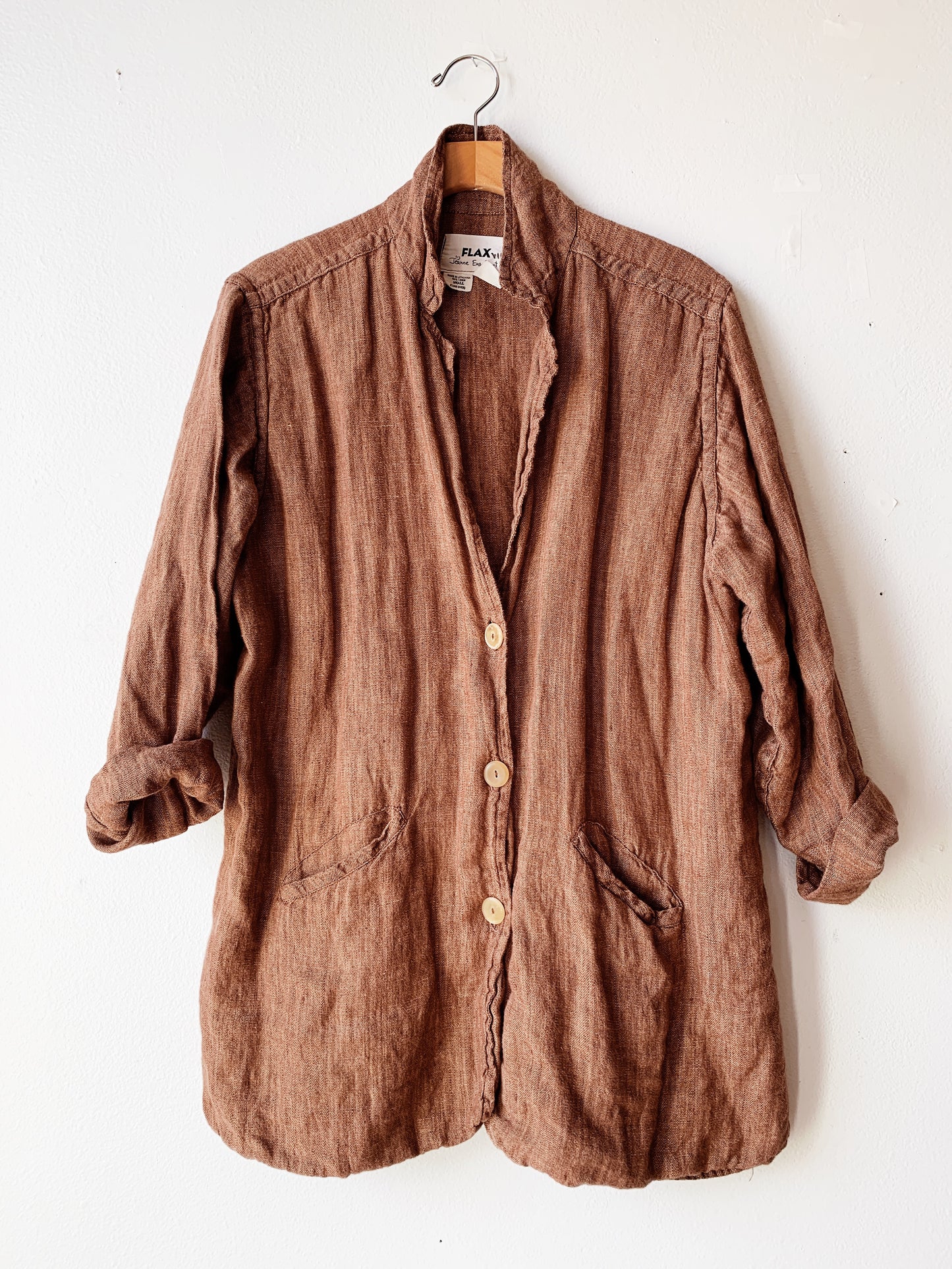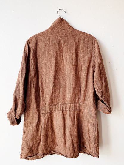 Awesome FLAX blazer / poet style jacket in a great copper color. Two front pockets, three button closure. Banded back. Tagged a small, fit is more oversized medium.