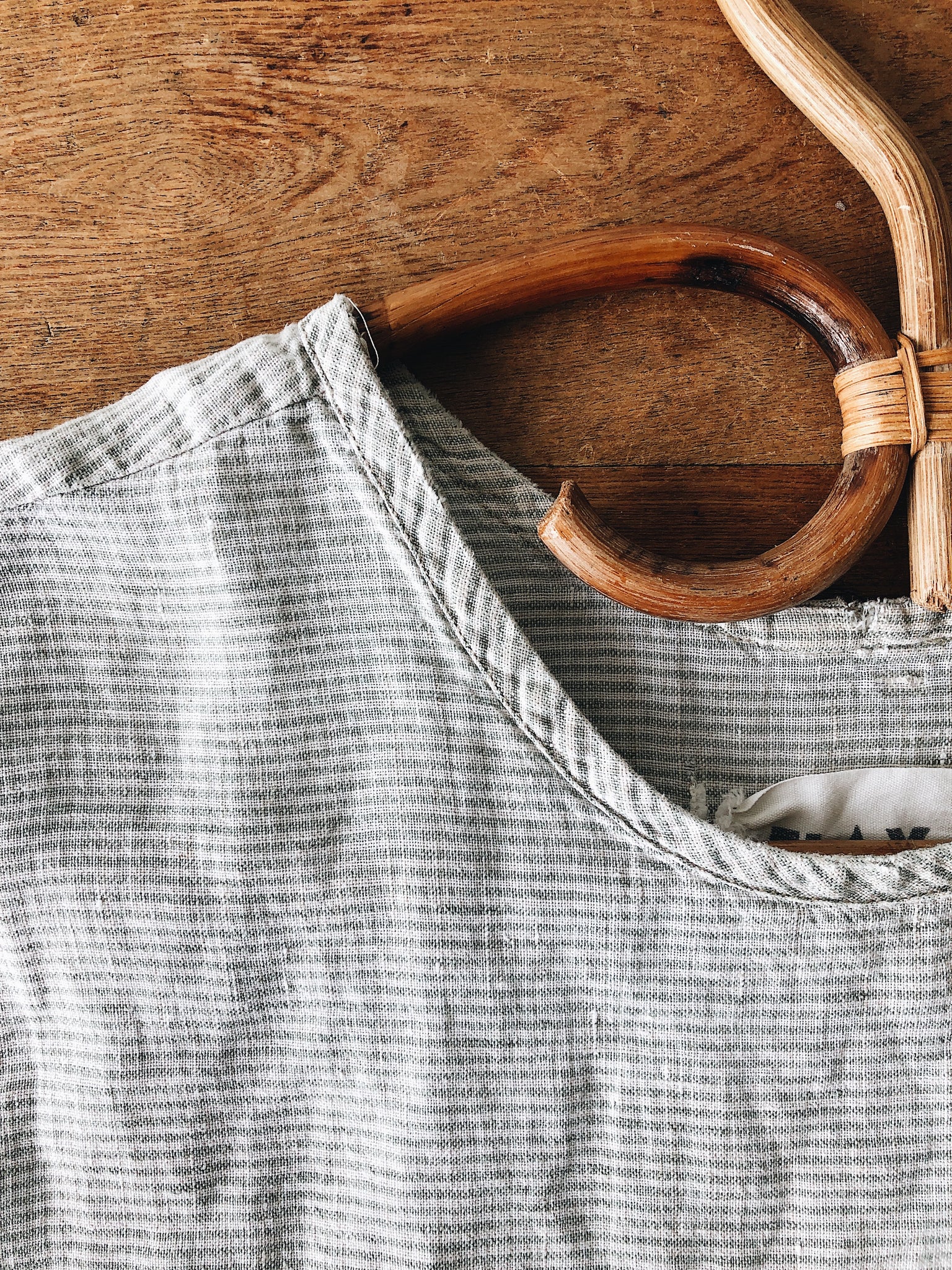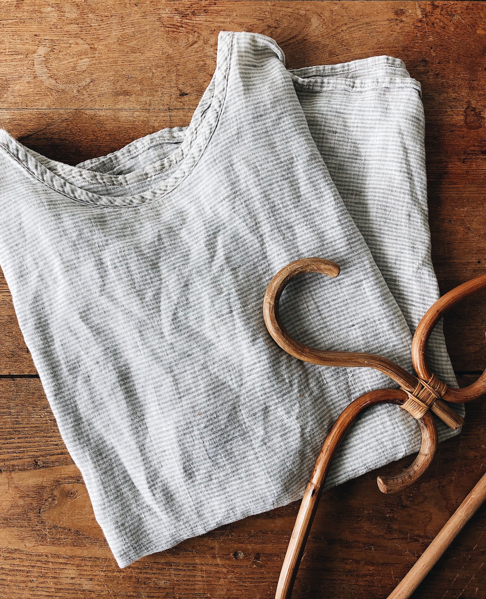 Super soft linen shirt by Flax. Nice boxy cut. Pale grey pinstripe. Great medium weight.