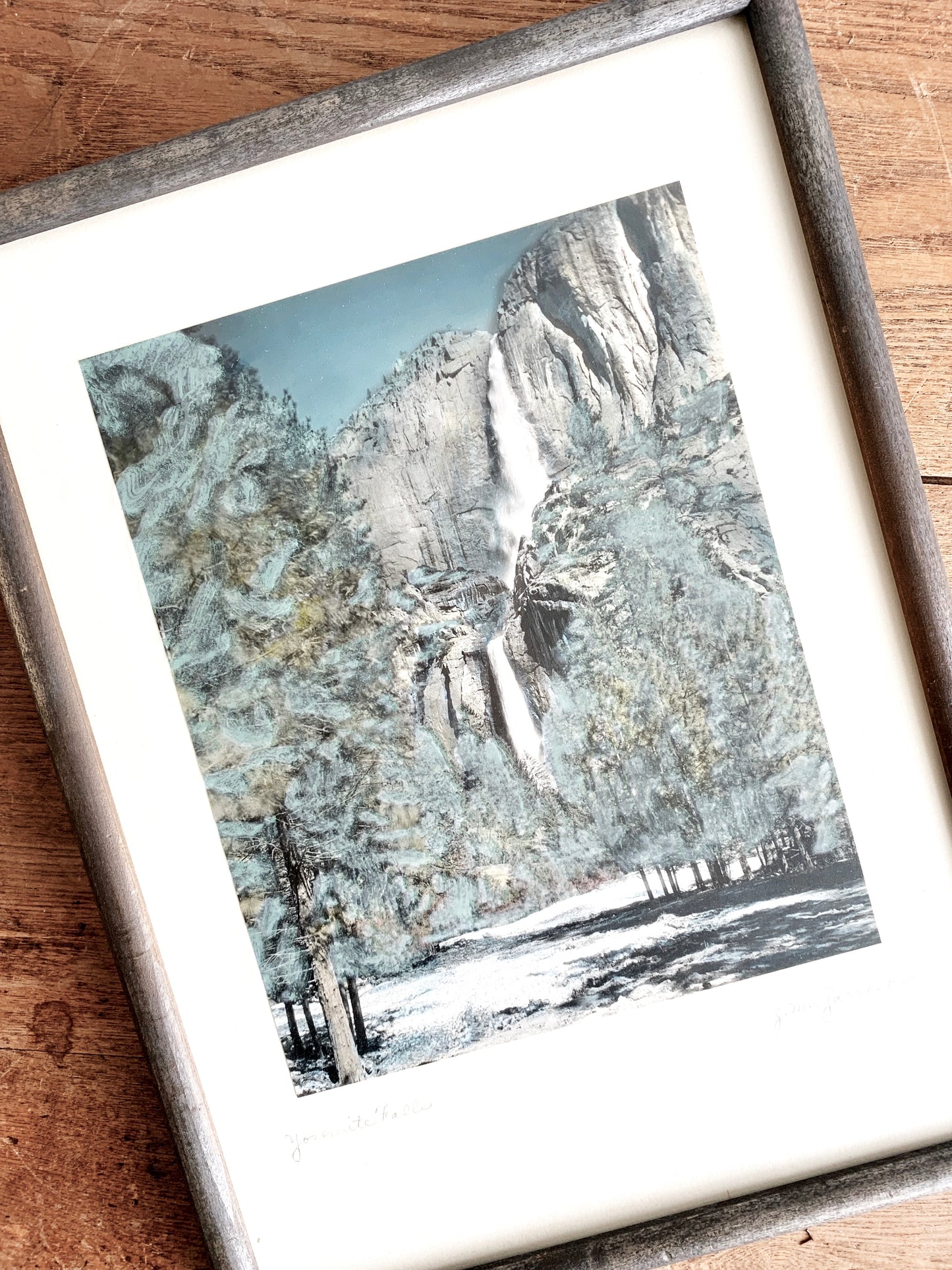 Lovely Yosemite Falls hand tinted photo framed in washed gray wood, under glass.