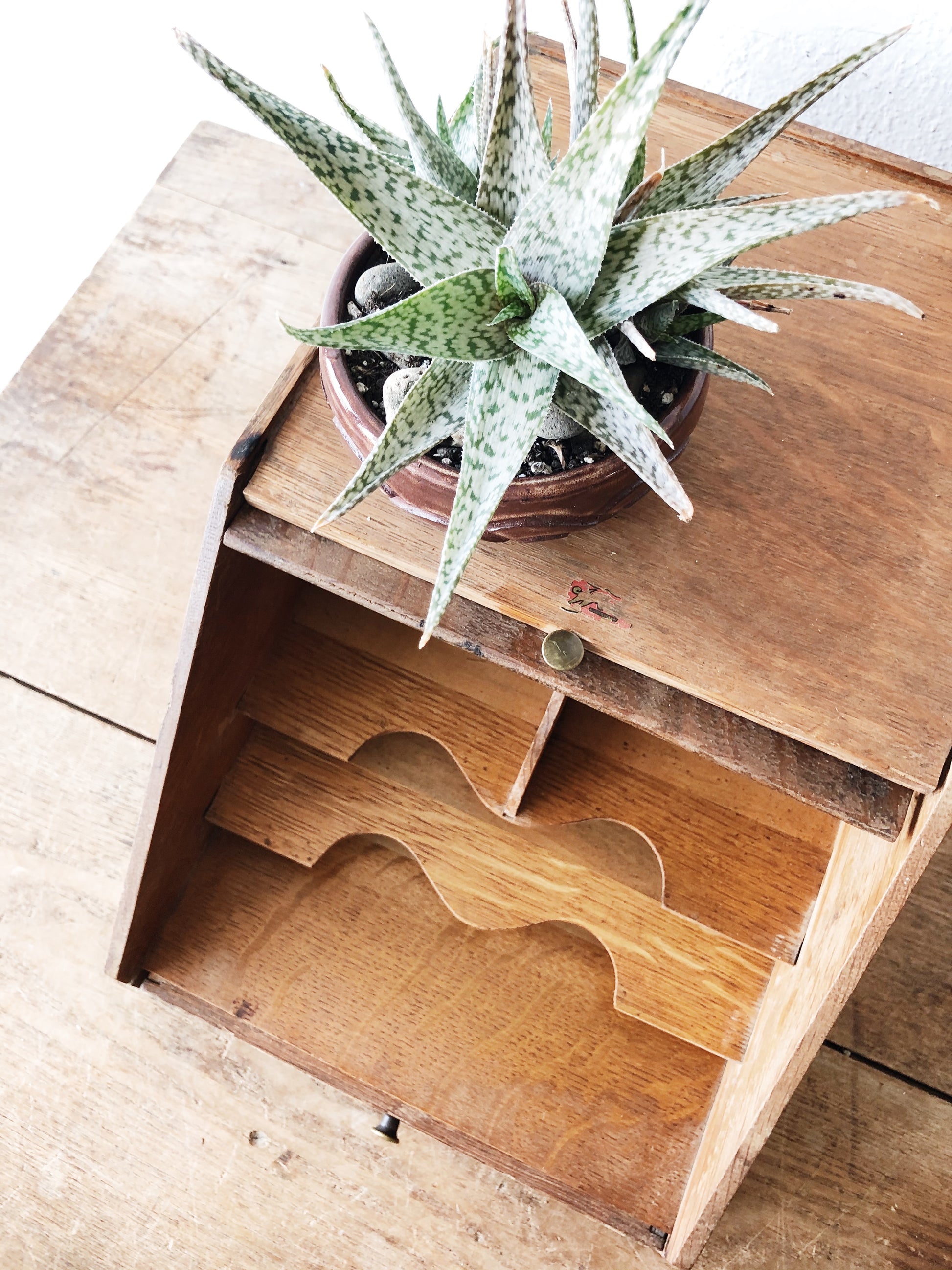 Beautiful old desk organizer from the 1920s. One little drawer in front with numerous flat cubbies. Lid slides open and shut