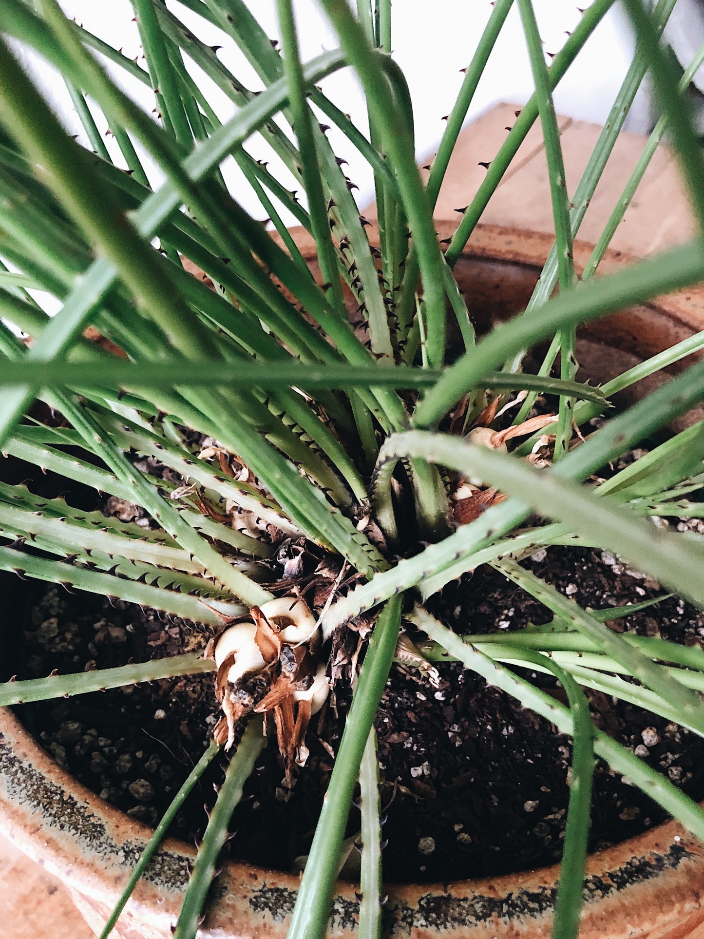 An unusual and rare plant with grassy leaves. Tiny thorns up and down them, and strange white seed pods at their base.