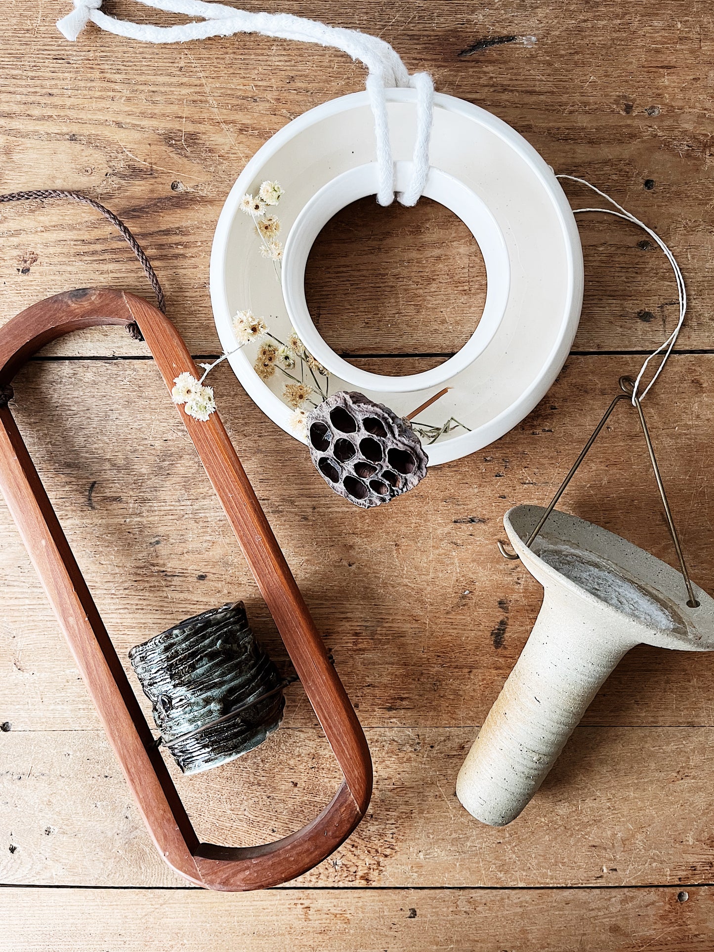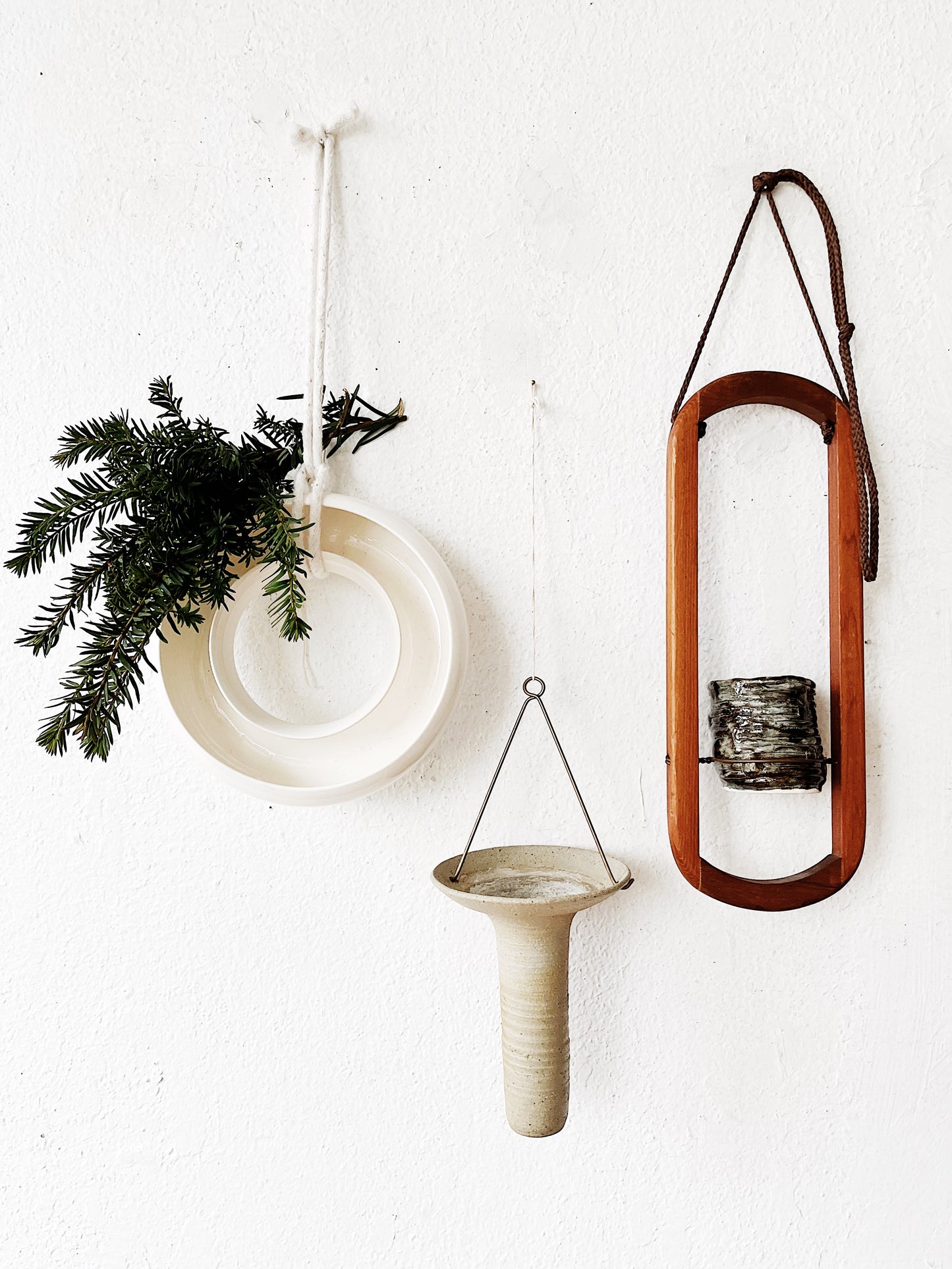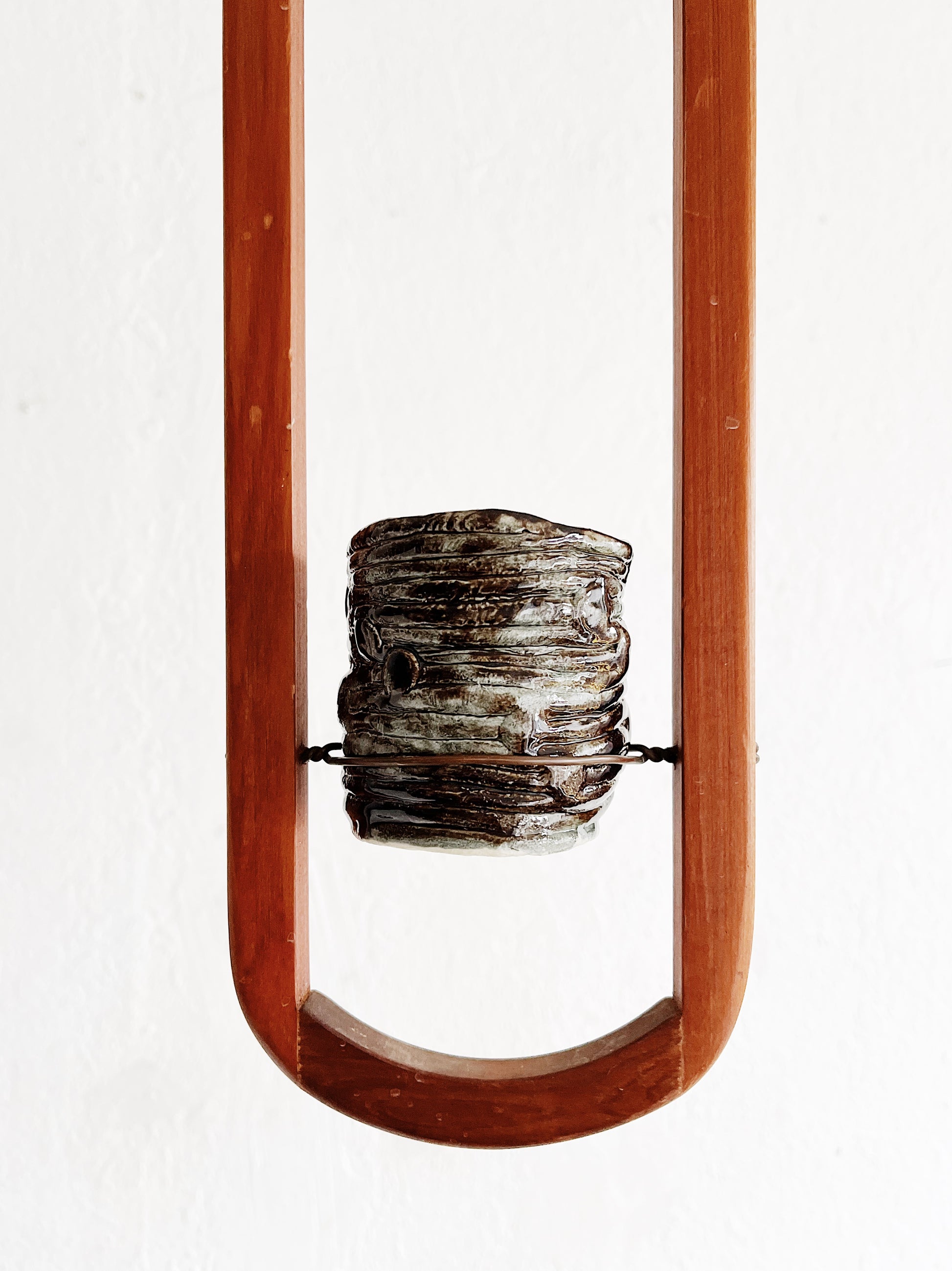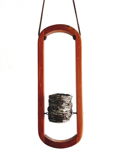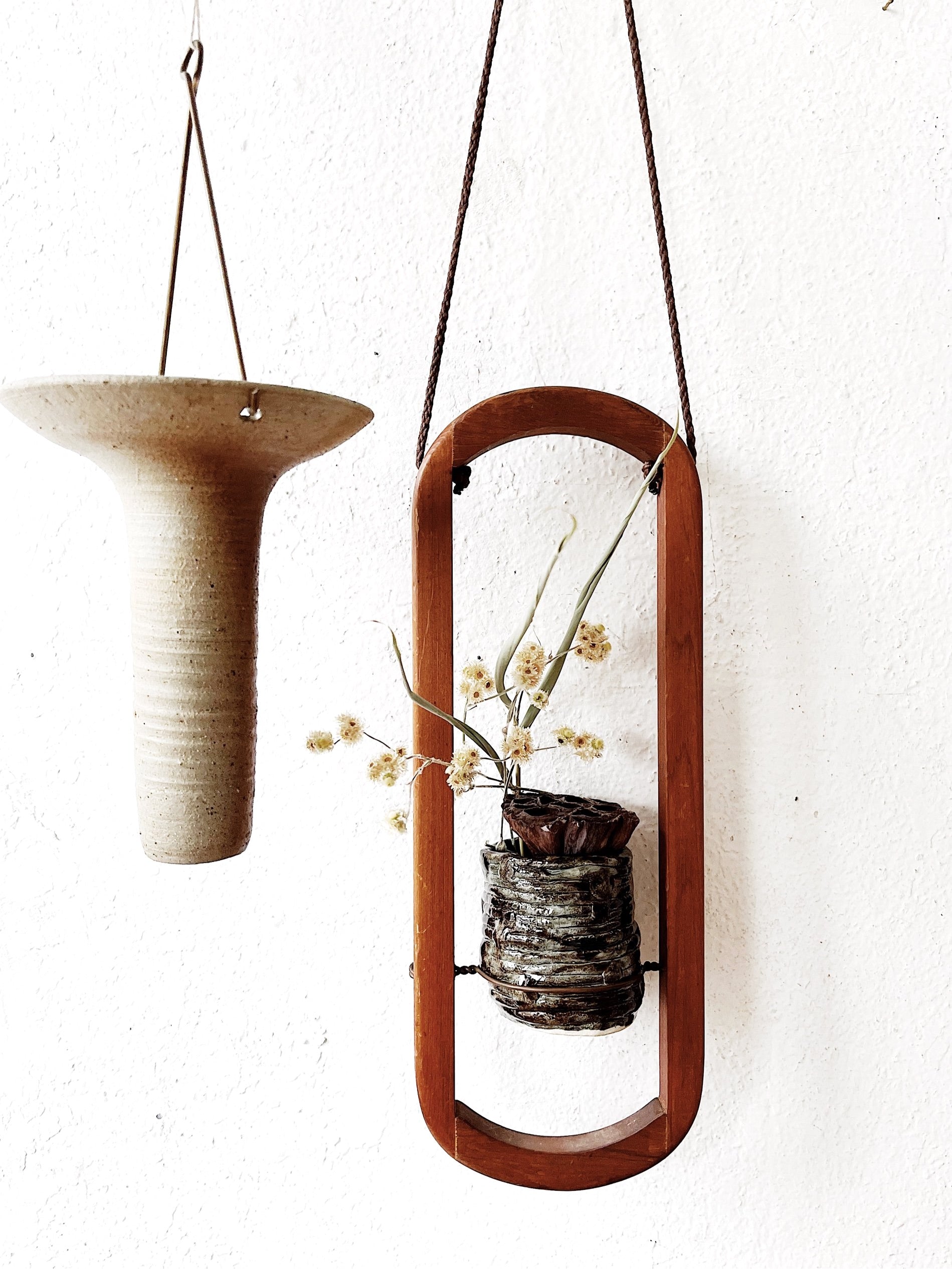 Vintage hanging planter / vase in a craft modern style. Teak with copper wire holder. Planter not included