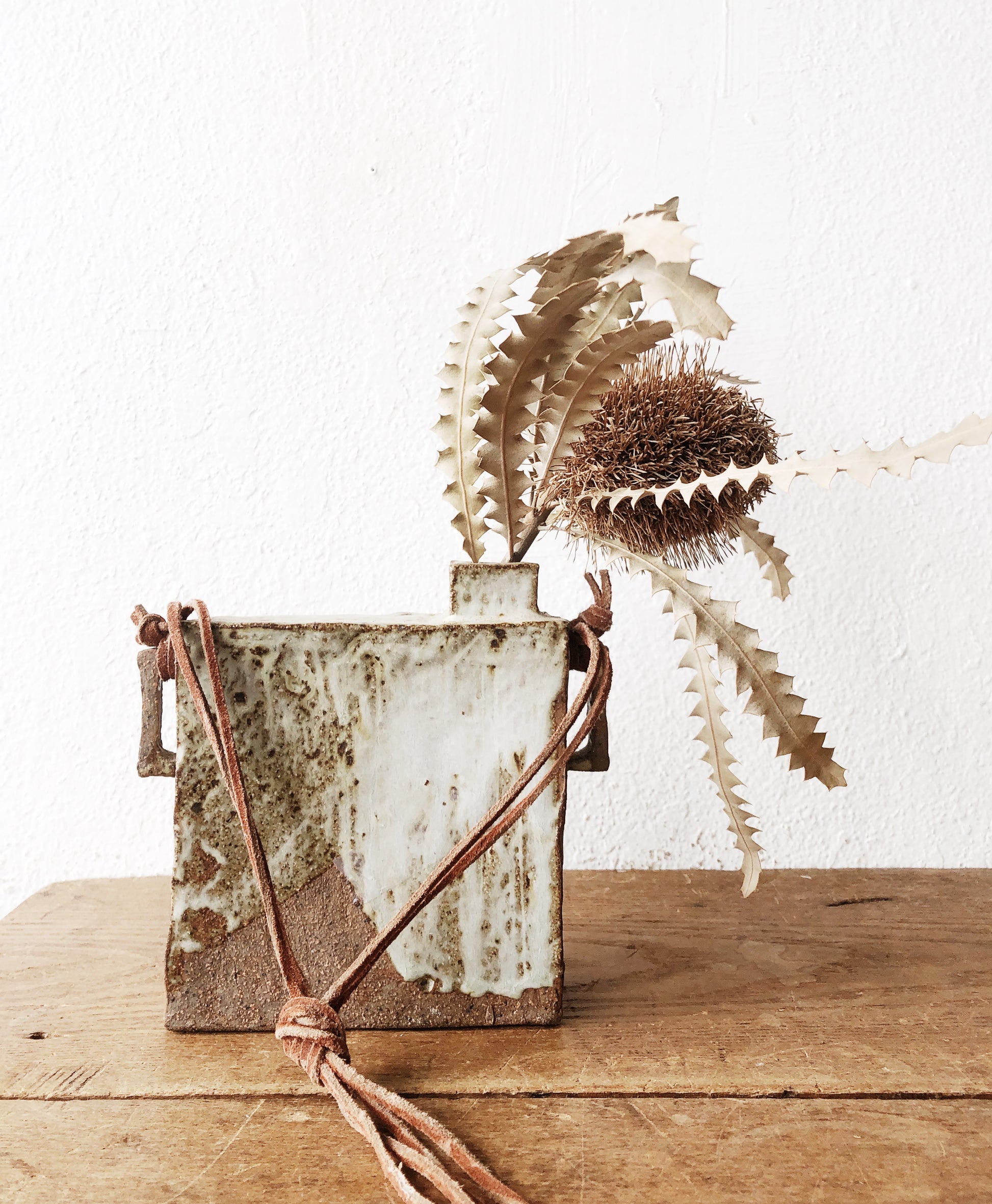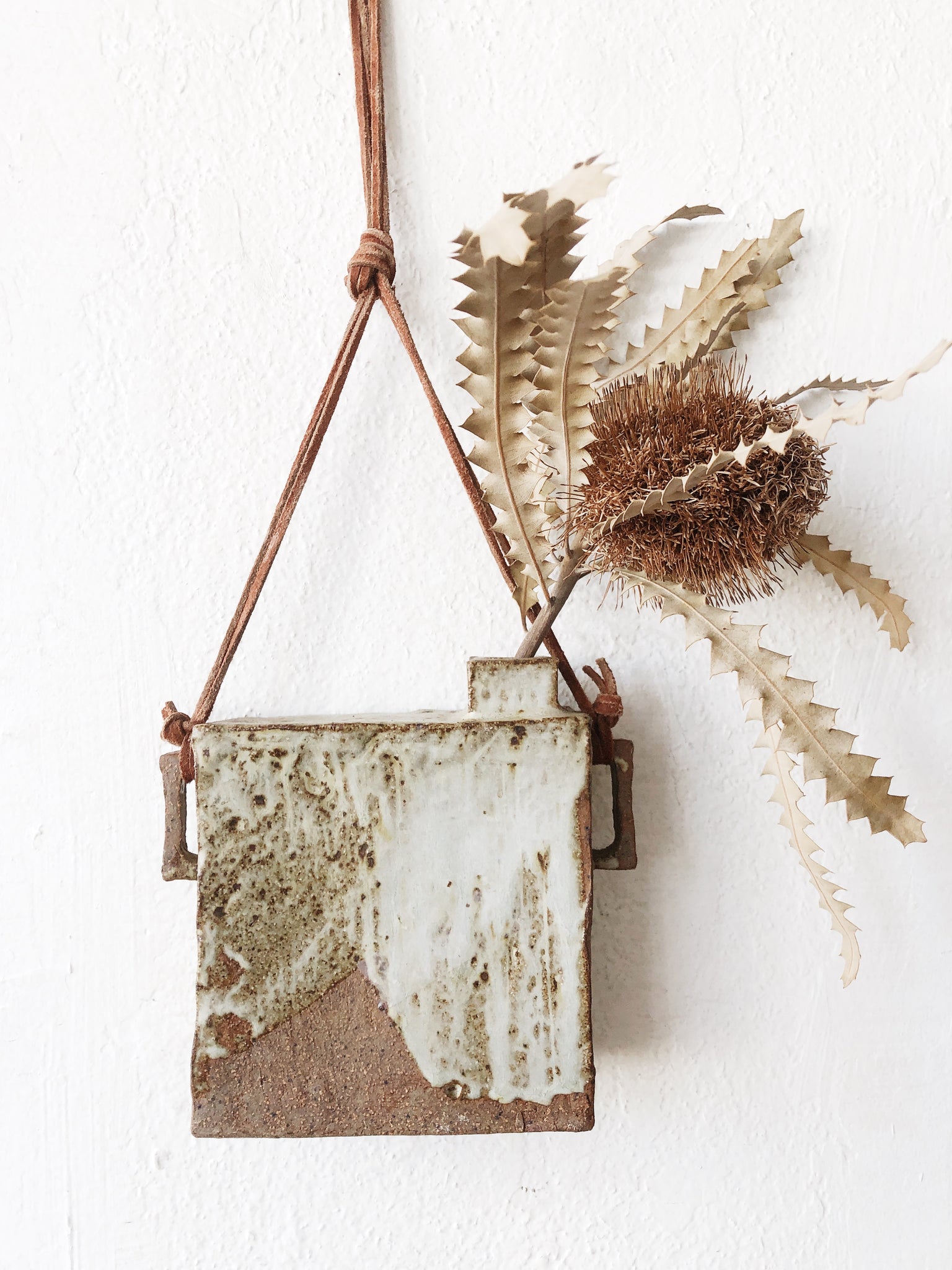Gorgeous raw clay and glazed ceramic vase. Hangs from a leather tie, can also sit