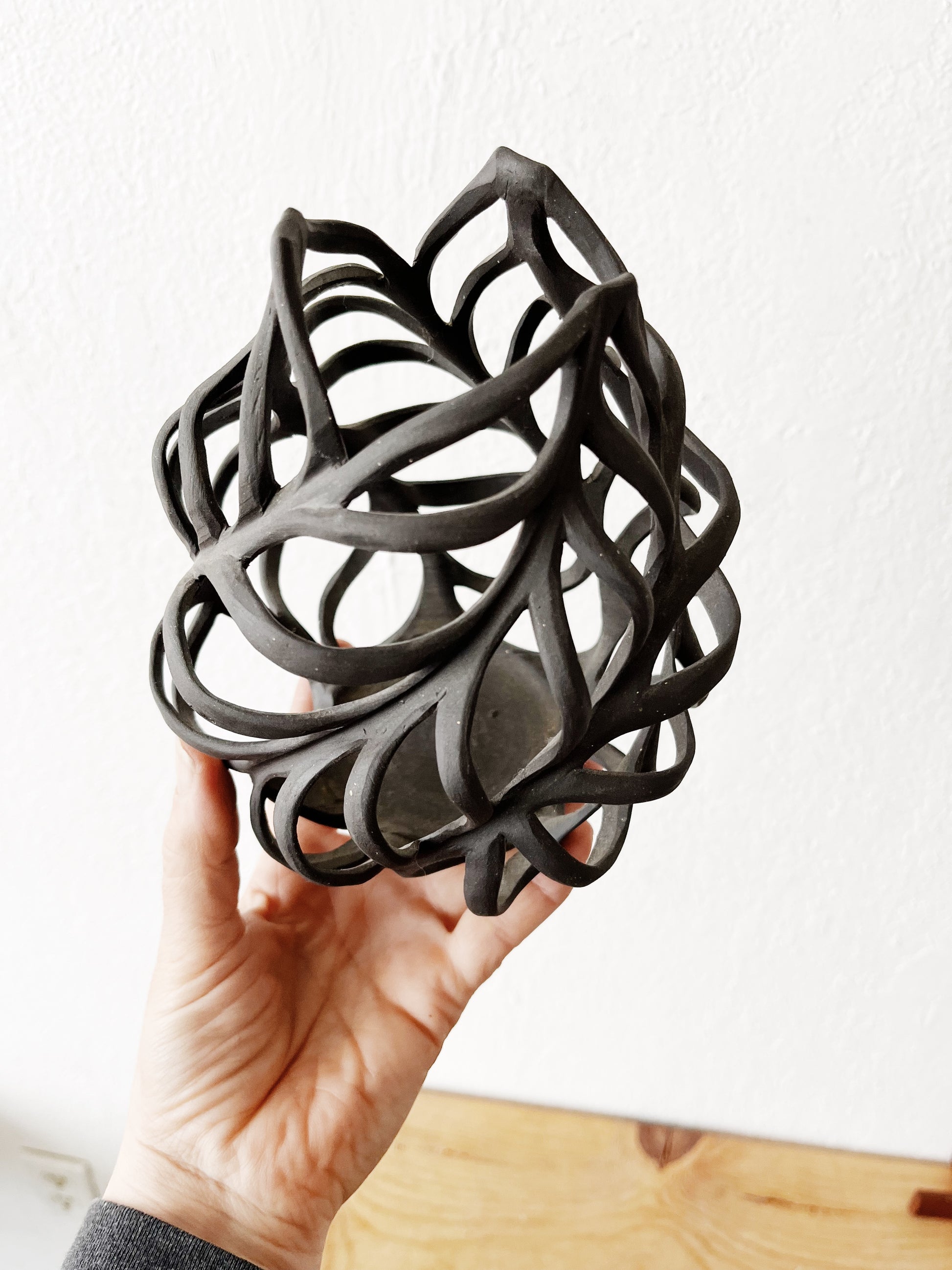 Beautifully and delicately made black clay ceramic luminary. Resembles the flame that it’s meant to hold. Stunning. Marked and dated